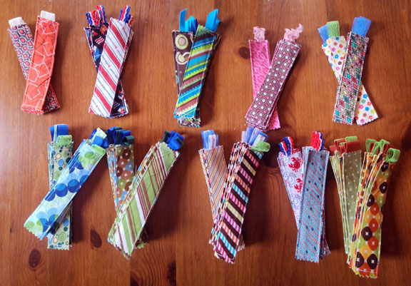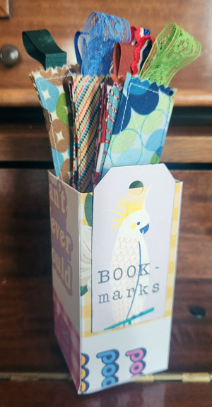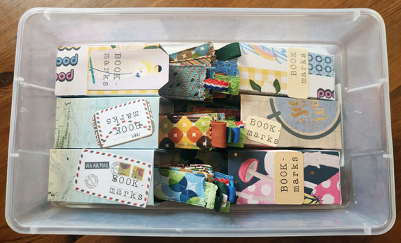I’ve made groups of 10 and 11 of a variety of the styles and filled the existing boxes. The rest of the bookmarks are under them in this little plastic bin that I’m going to keep in my car.