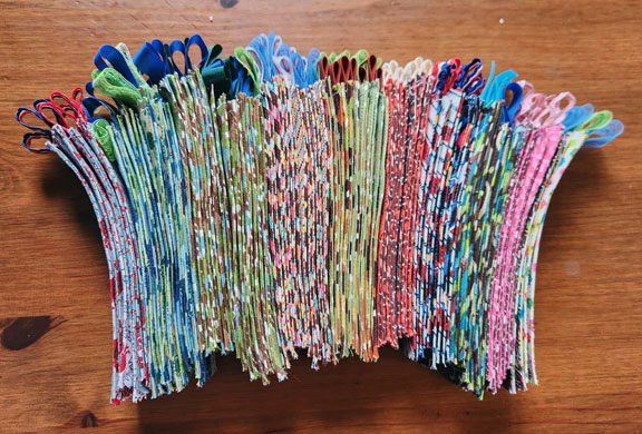 I had all this 1 1/8" single fold bias tapes in long lengths sewn together also one side left from a project that didn’t go anywhere that I wanted out of my stash, but didn’t want to throw out or seam rip, so I decided to make bookmarks to give away.