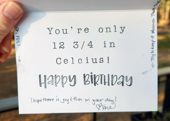 I saw a similar phrase on a card and thought it would be great for him! I realized as I was editing photos that I misspelled “Celsius” so I have remade the inside with “Celsius.” Bonus: it also covered up my smudges and gave me an opportunity to pay attention to such. However, I forgot to take pics before I signed and sealed the envelope!