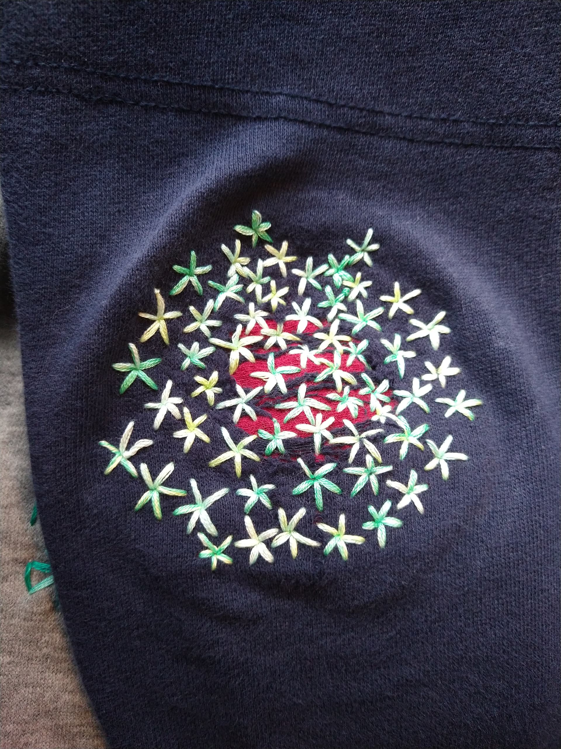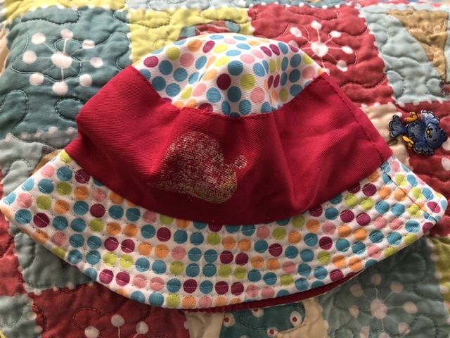 Did a small/easy mend today. The snail decoration on this sun hat faded off in the wash so I had the Child pick from several patches that I had no business buying years ago.