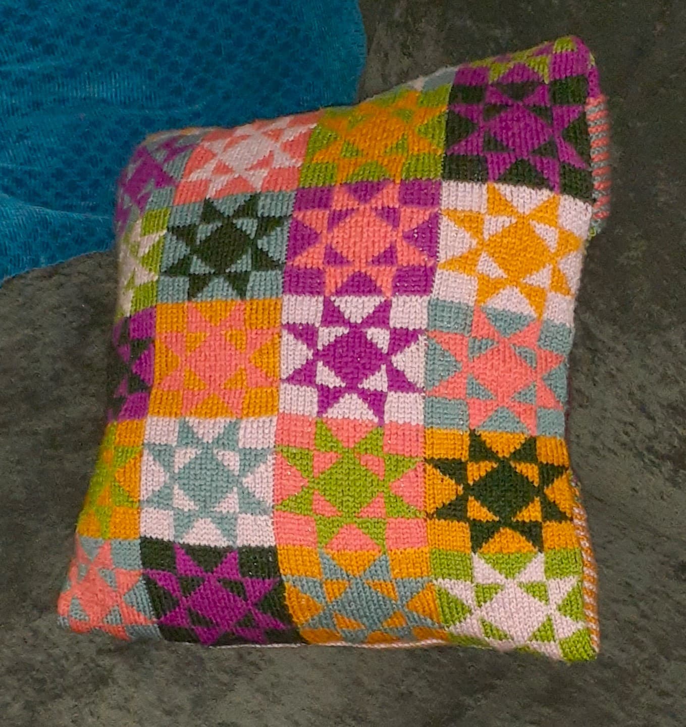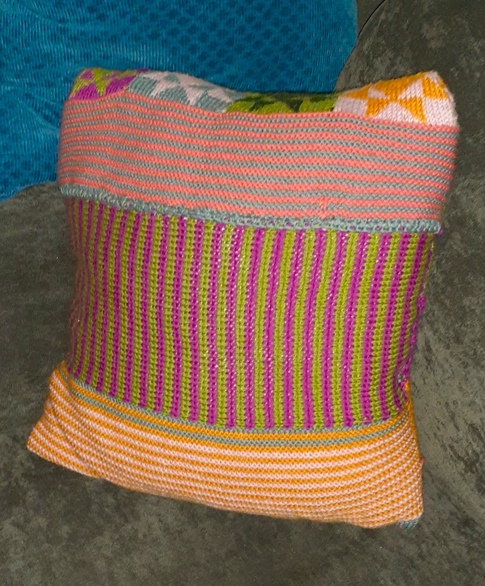Finally finished finished this knit pillow cover. The front was finished last year, and sat for long while. Then I finally got a pillow insert for it, but that ended up being bigger than I planned so it sat some more. I finally finished cobbling together the back, which is a mish-mash of leftover yarn. It’s definitely not a perfect fit for the form, but I’m past caring now. It’s wonky but cute.