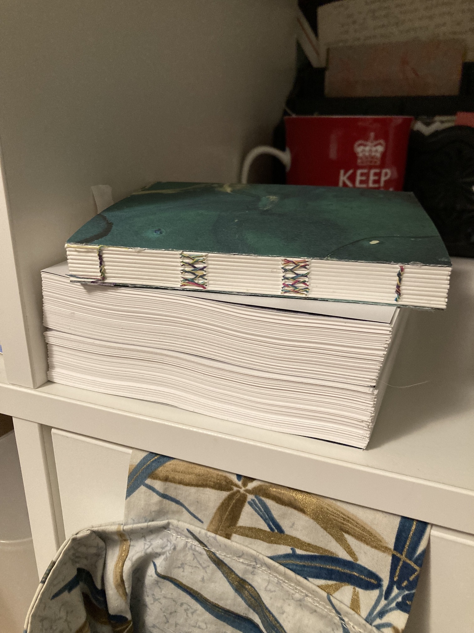 Monday evening: printed out some more pages (not shown) and glued up some spines.