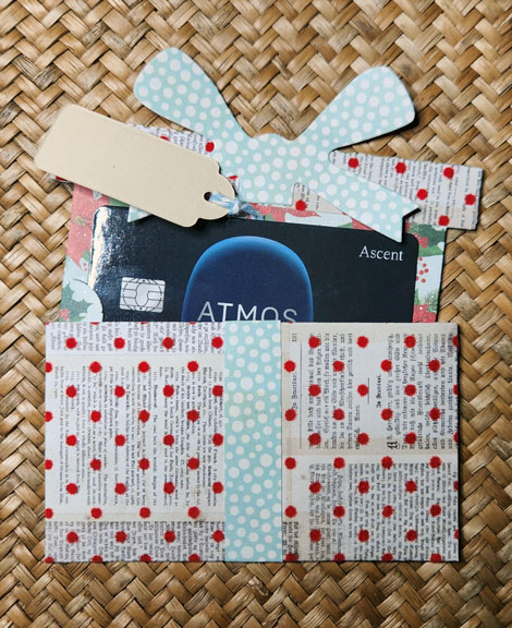 This one is for my mom, who’s brother died recently. He did that classic bachelor uncle thing of wrapping gifts in newspaper, so I thought this paper was a nice homage to him, even though they are book pages. The red dots are flocked!
