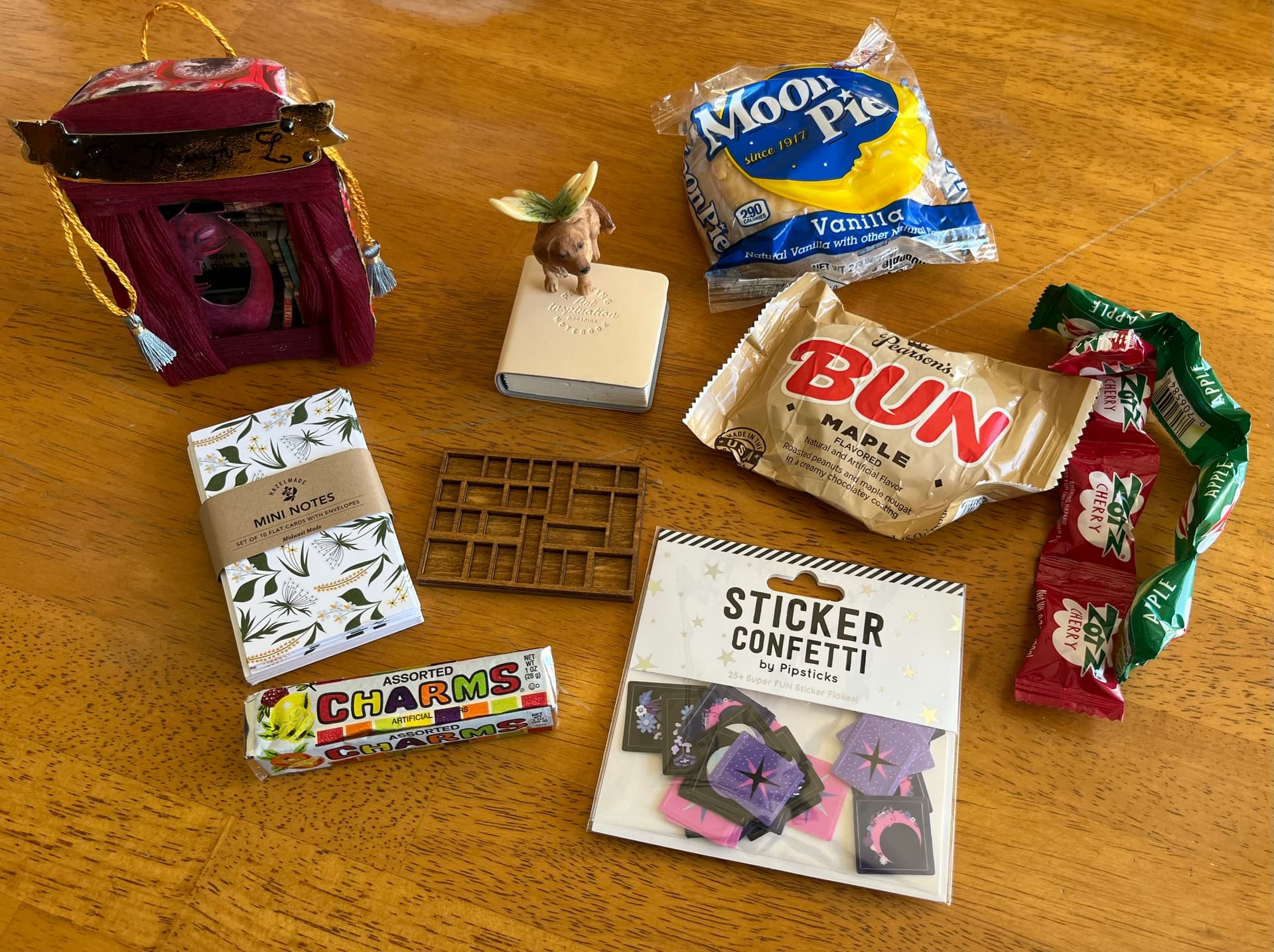 The little notecards are soooo cute, and I love the tiny art book. The winged puppy is a plant poke which is why he’s sitting on the book like that. The sticker confetti looks fun! Such a unique idea! I have a friend with a miniature printer’s case like that and I’ve always admired it- how cool that I have one now, too! And of course, who can forget all the sweet treats!