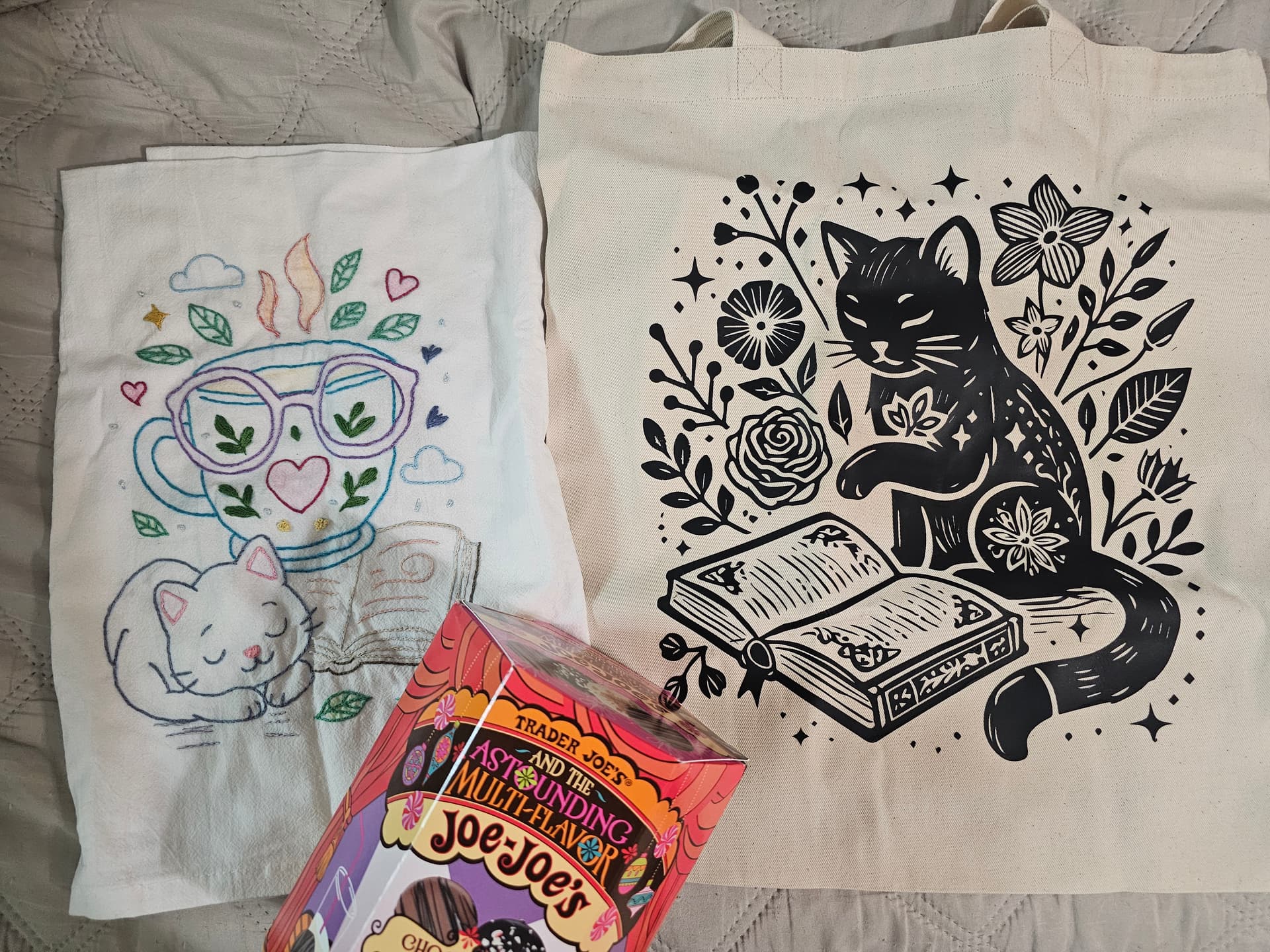 I got a beautiful tea towle with the cutest cat, open book, and a tea cup with glasses (which I wear)! Then I got a super cool tote bag. I can never have enough tote bags! And I also LOVE images of animals reading. This is purr-fect for me! Oh, almost forgot the huge tub of fantastic cookies that will leave me wearing sweatpants until Spring!