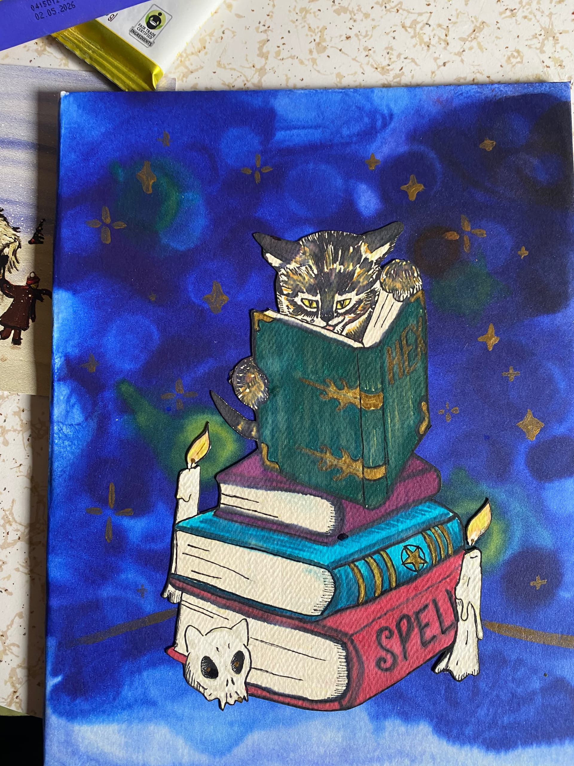 I forgot to mention that the cat art is built over an old textbook cover, so it has books through and through!