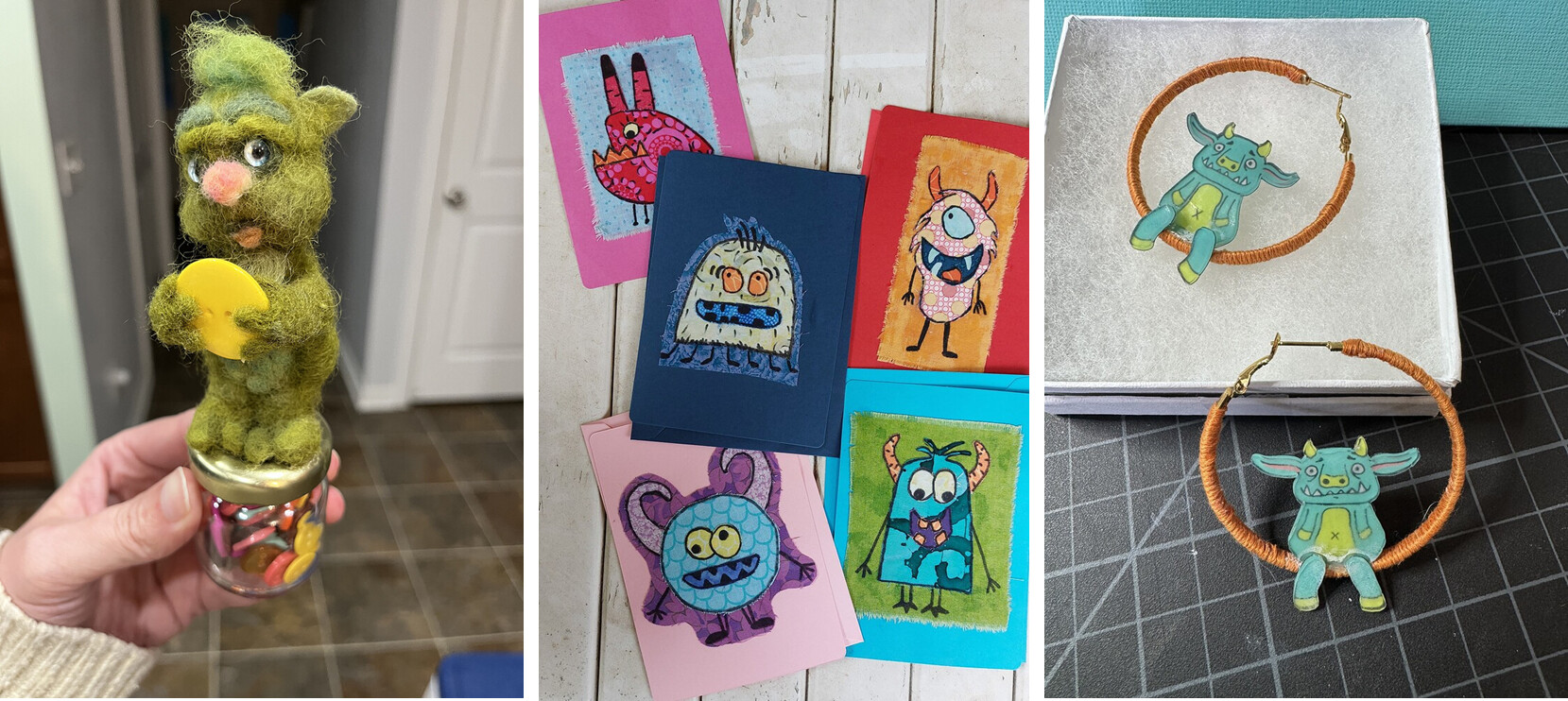 Greta the Button Monster by @Tapestry, Fabric Monster Cards by @MightyMitochondria Tapestry, and Monster Hoops by @gozer