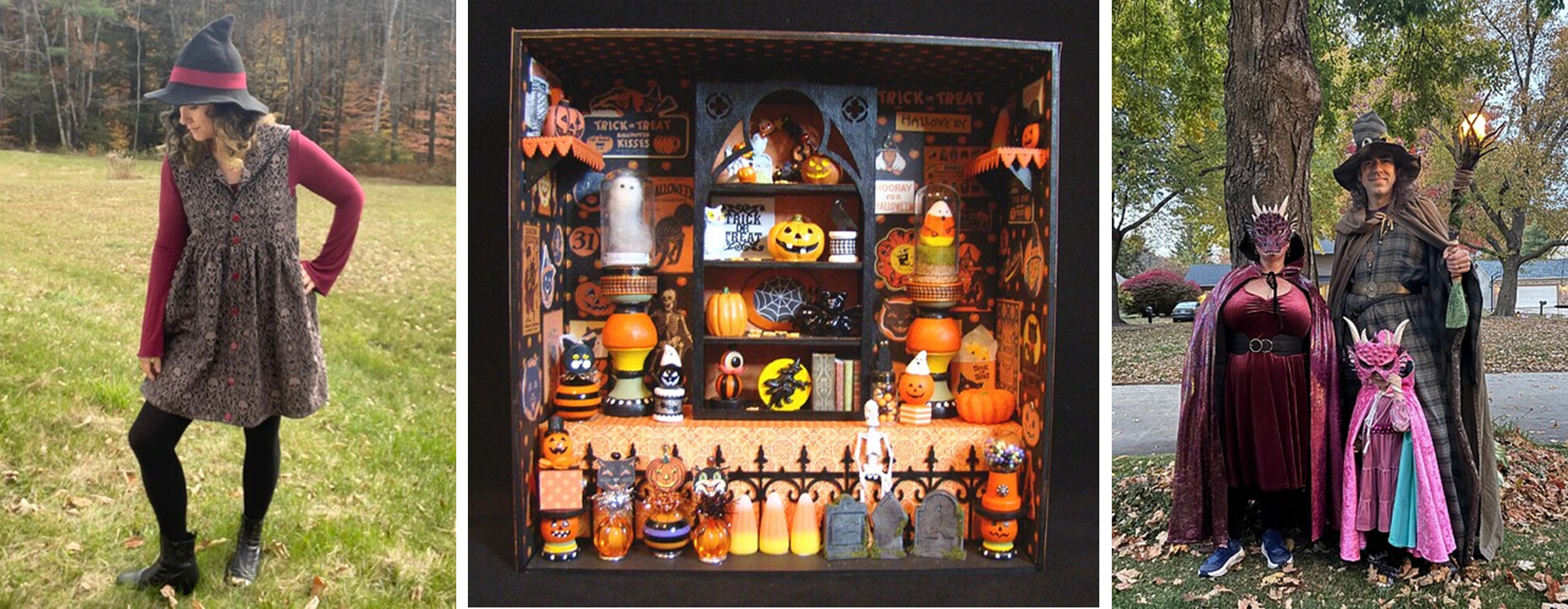Thrifted tablecloth to dress by @Rlynn, Vintage Halloween Display by @MissingWillow, and Wizard & Dragons Family Costumes by @MistressJennie