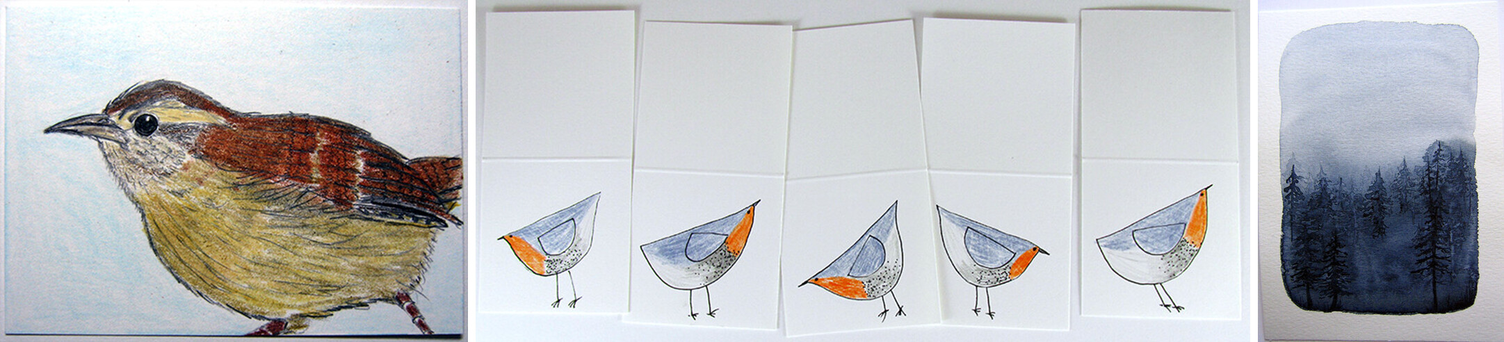 Carolina Wren ATC, Little Bird ‘Tweets of Love’ Notecards, and Misty Forest Anthology by @bluebird