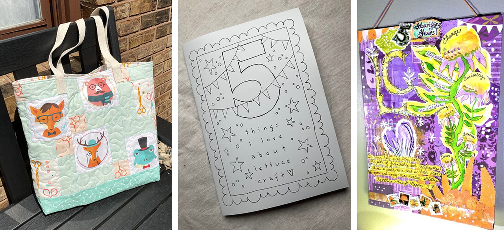 LC Critters Quilted Tote Bag by @MistressJennie, Five things I love about LC Coloring Zine by @jemimah, and LC Turns 5 Wall Art Collage by @ArtsyLadyCrafter