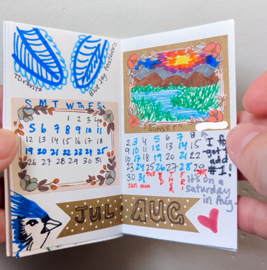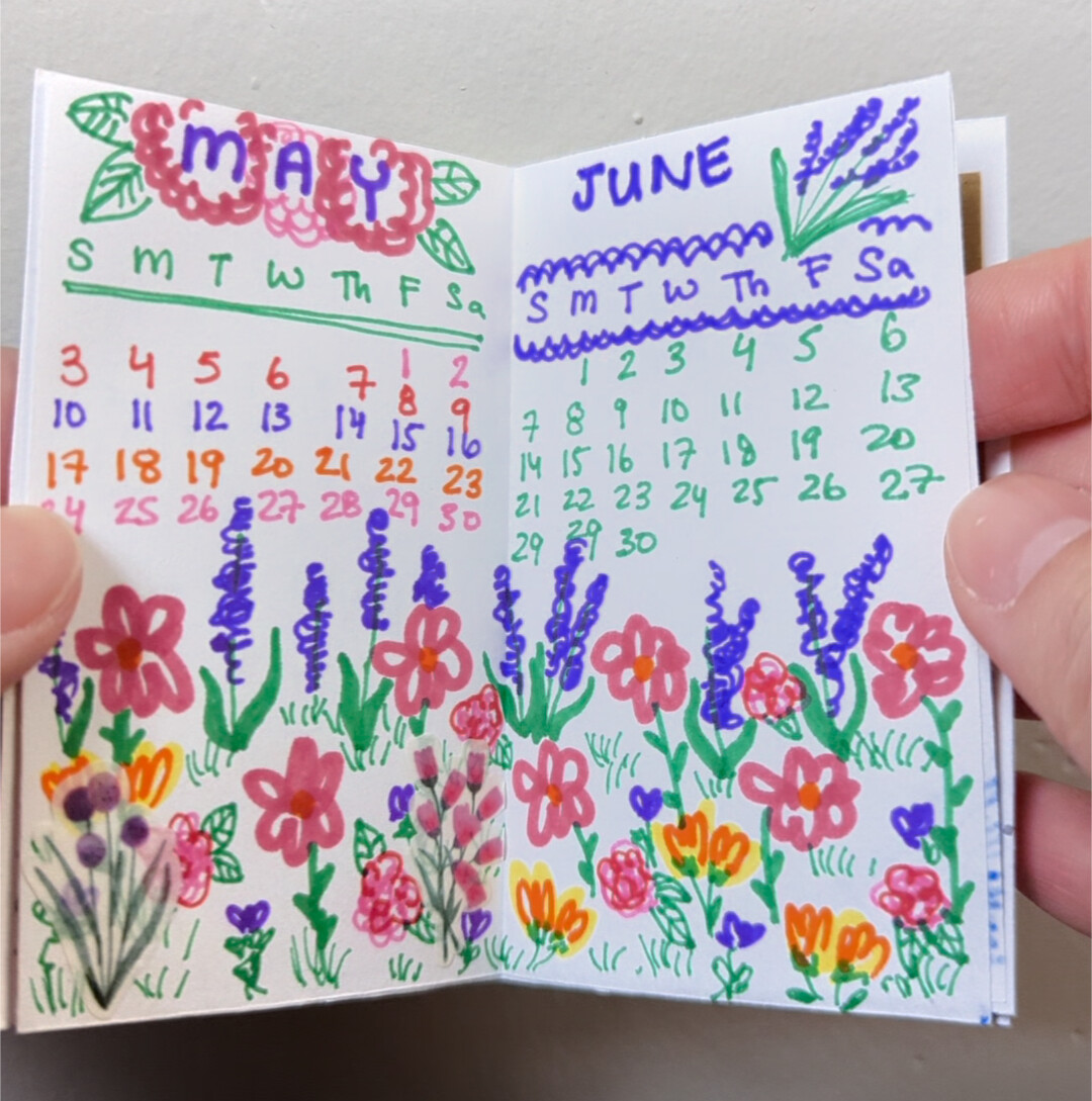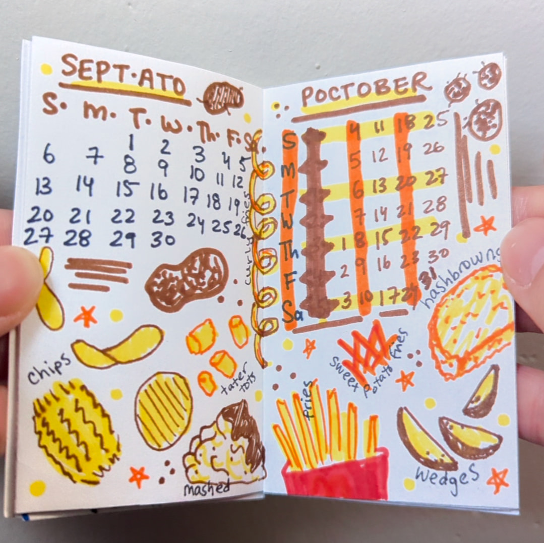 Fast forward to January, I was lurking the zine swap and felt really inspired. So instead of a full size calendar, I made my friend a 16-page Zine pocket calendar. I followed this booklet tutorial. I gave myself permission to just let creativity flow, marker on paper, go for it. This is the end result. It’s a little weird, doodle-y and more of an artistic experiment than a functional calendar . It features a few double spreads including: wildflower themed, potato themed, and dog themed double spread . Enjoy!