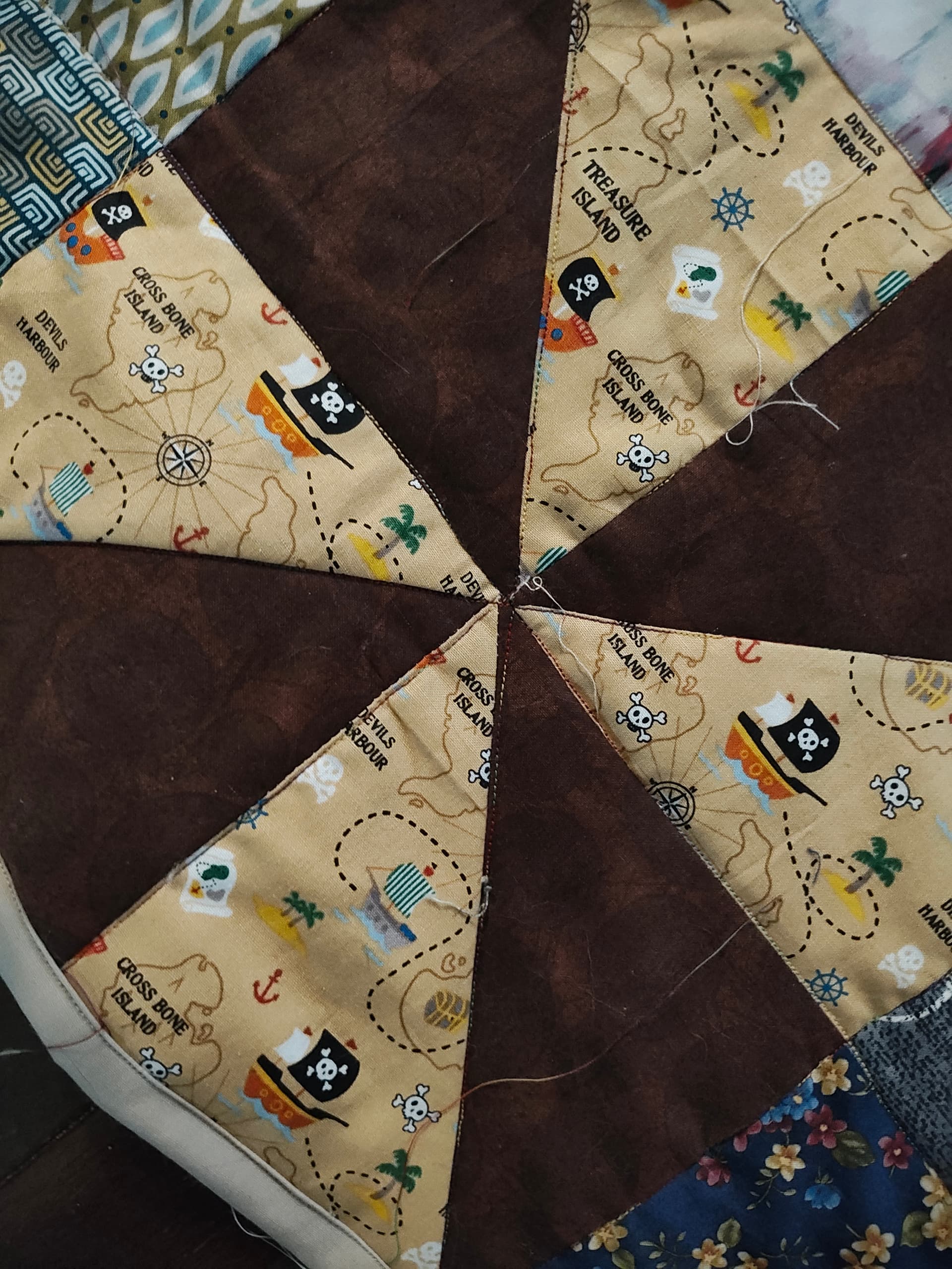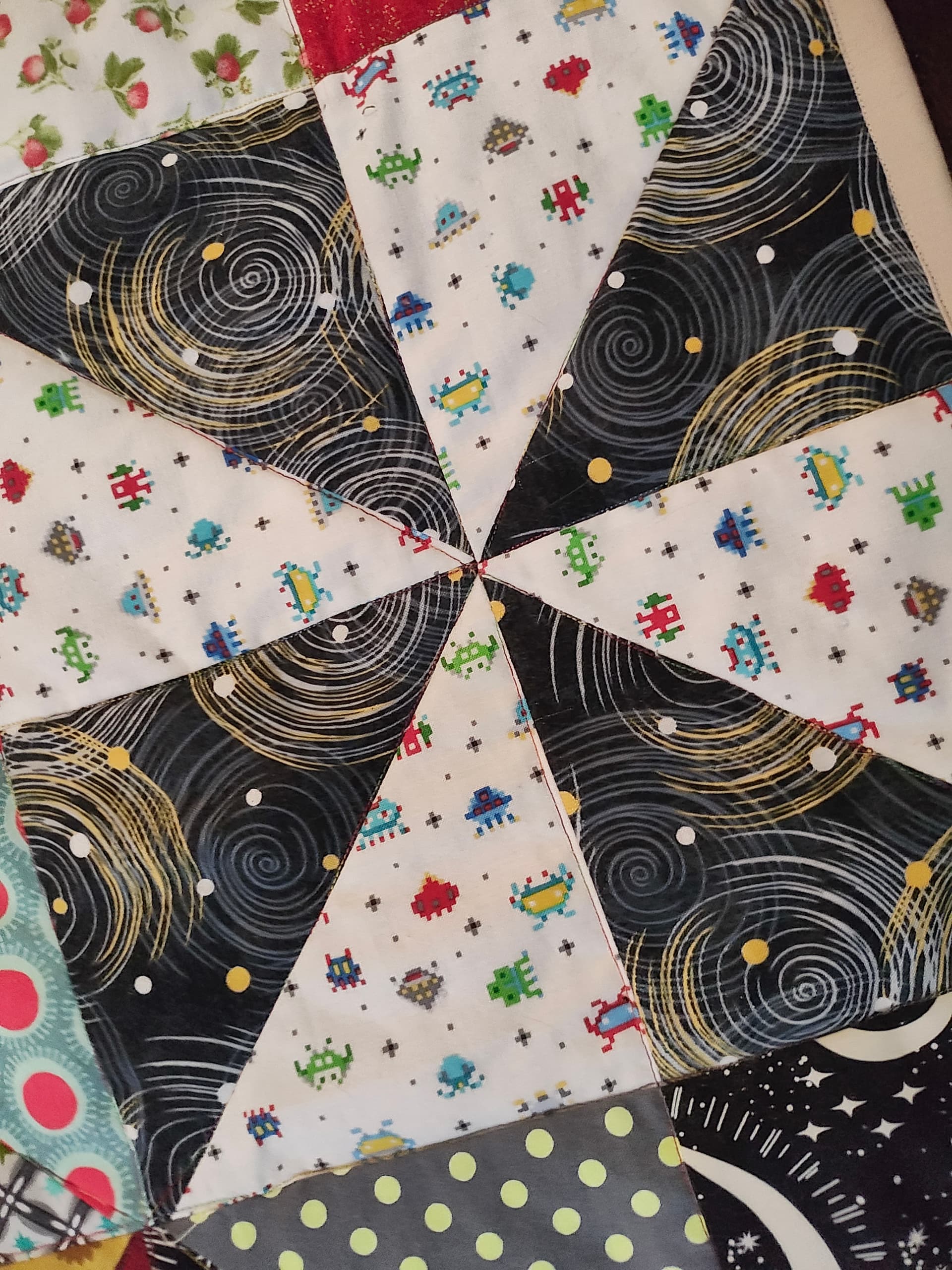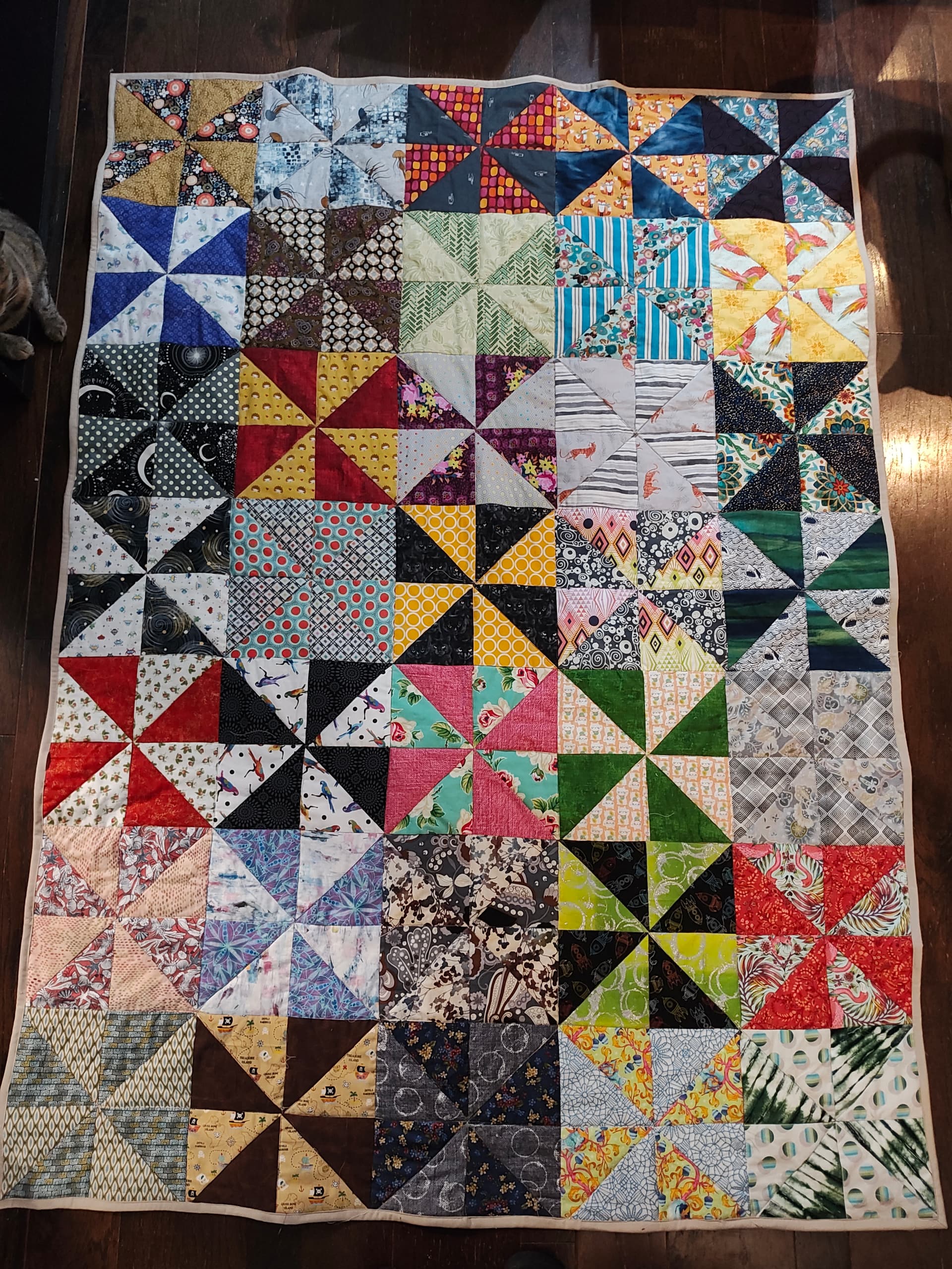 Great job finishing off two WIPs while working on such a monster main project at the same time. I’m usually not a fan of pinwheel blocks (maybe I just dislike how thick the center comes out), but your full on scrappy ones really brought out the joy of that block. I love it!