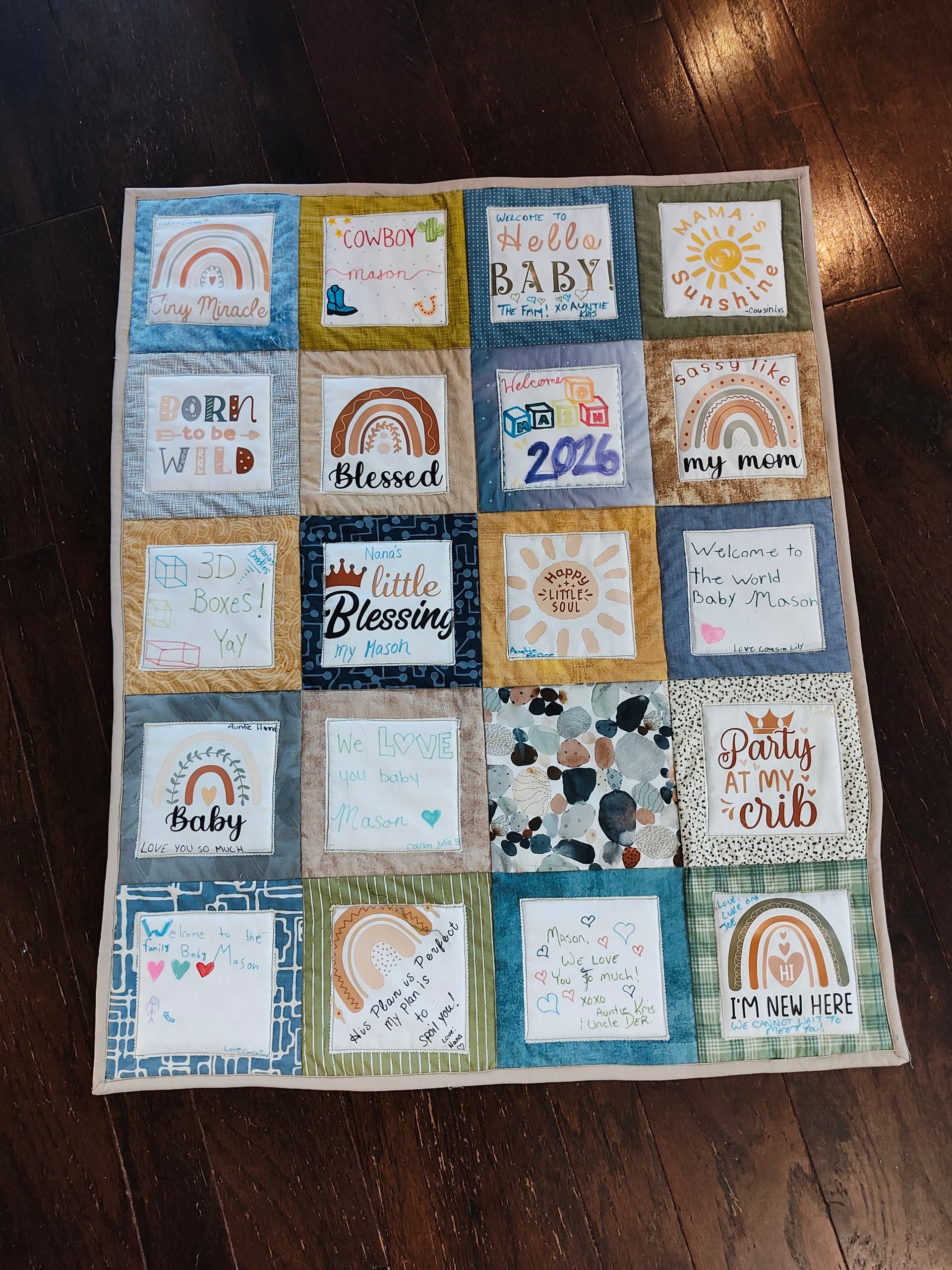 The second one was for a work acquaintance. Who became a new great auntie and at the shower they made blocks. (I believe the vinyl blocks came from Etsy, and well. I have opinions. I’m not sure how well this will hold up to daily use, and I re heat pressed them ) Of course non sewers don’t know about seam allowances.so I had to try something to keep as much of the edges in tact. I added a 4 and three fourths square of batting and essentially appliqued it to a backing square. It adds a bit of extra dimension and didn’t take out as much of the writing as full quarter inch seams would have .