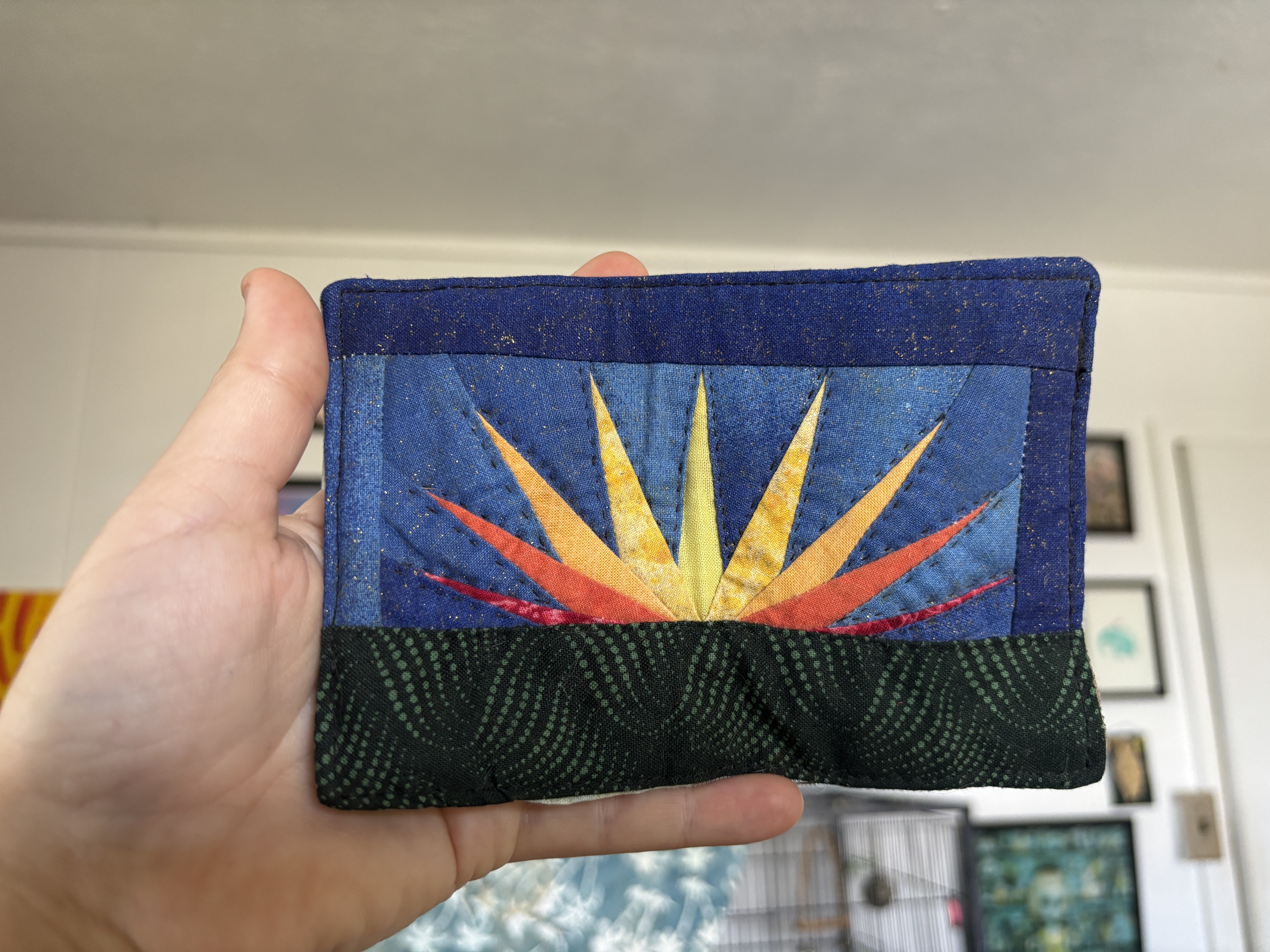 Sorry for a photo of a piece that is NOT from this round, but I was just decluttering my desk and found this little quilt in a stack of mug rugs and coasters I keep in there.