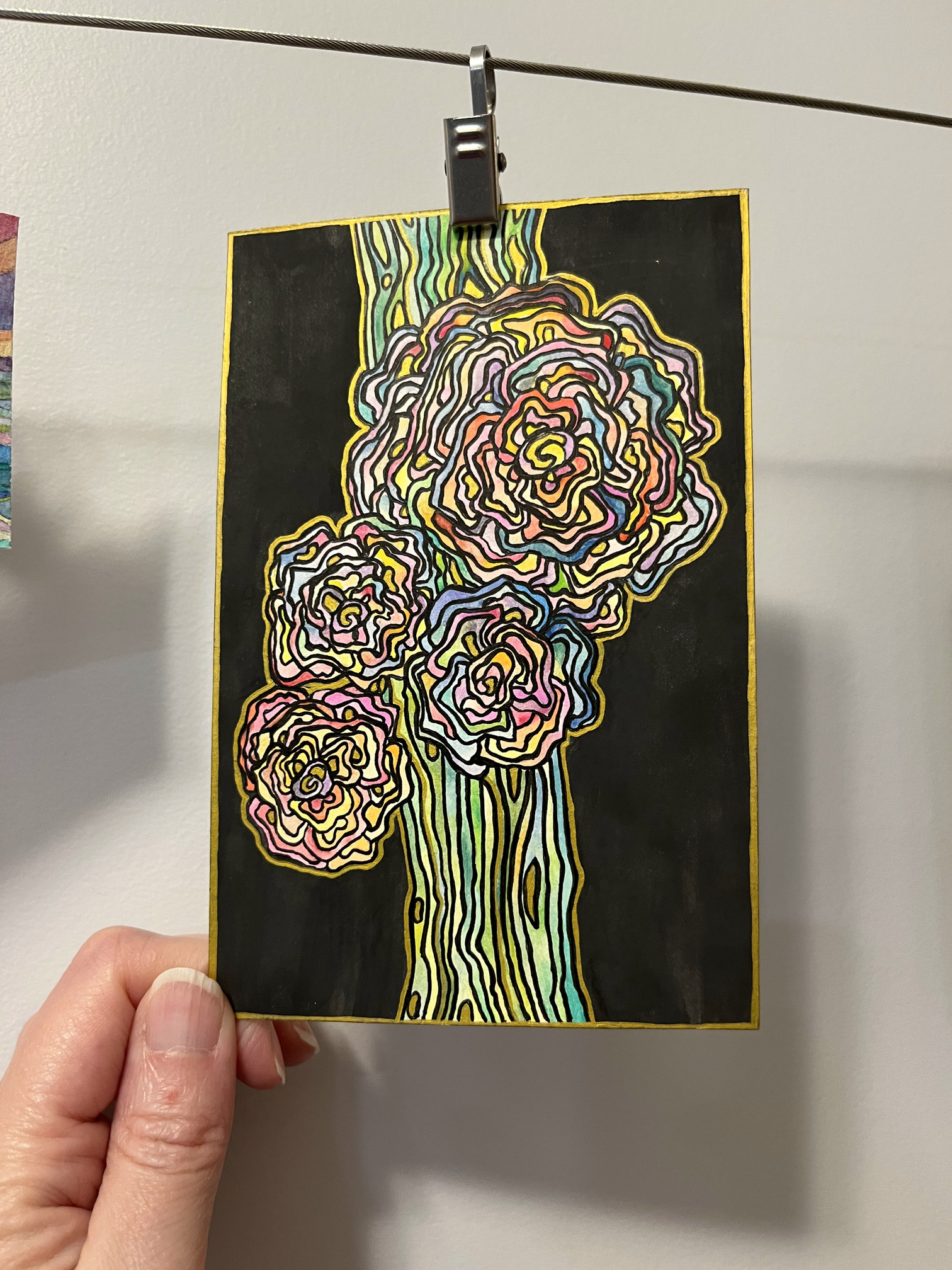 That is so crazy that all the art you received is adjacent to the others. I love @curiousfae’s water color bouquet! The linework is so clean and clear and the way it pops out from the black is super cool! @Cindy’s looks like it was made to coordinate, and the fact that she wove it is kismet! It pops as well.