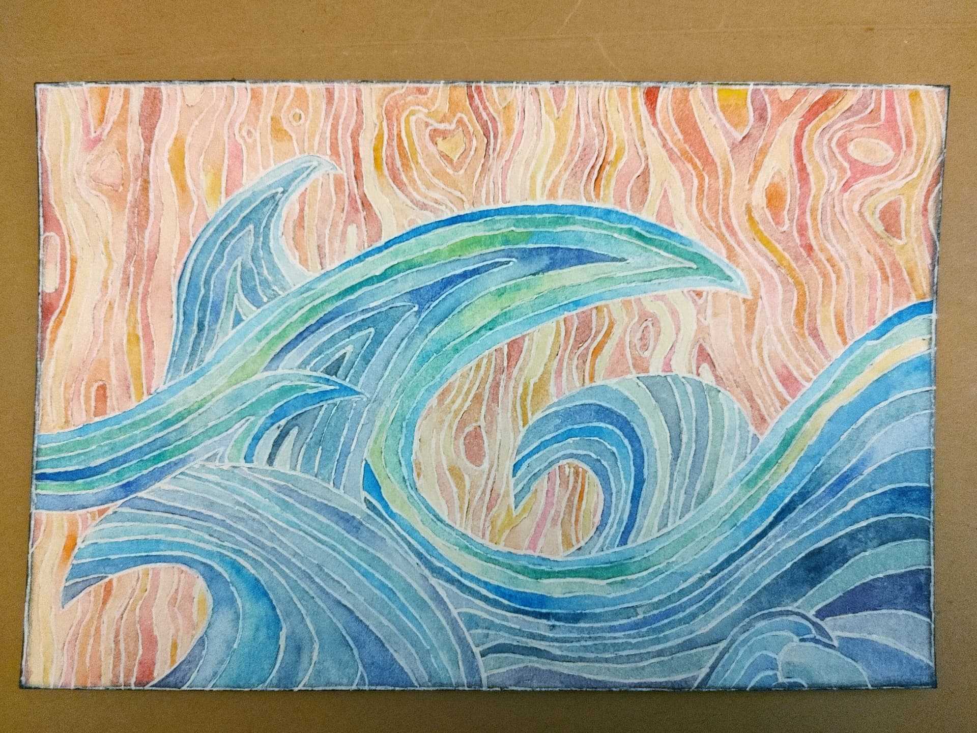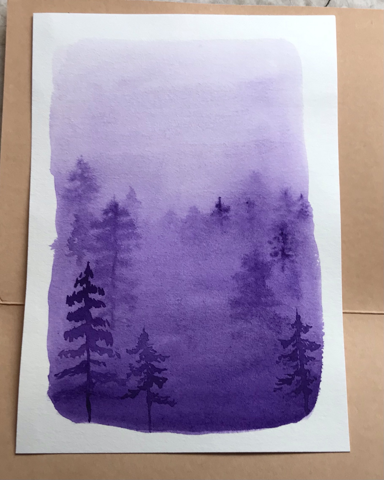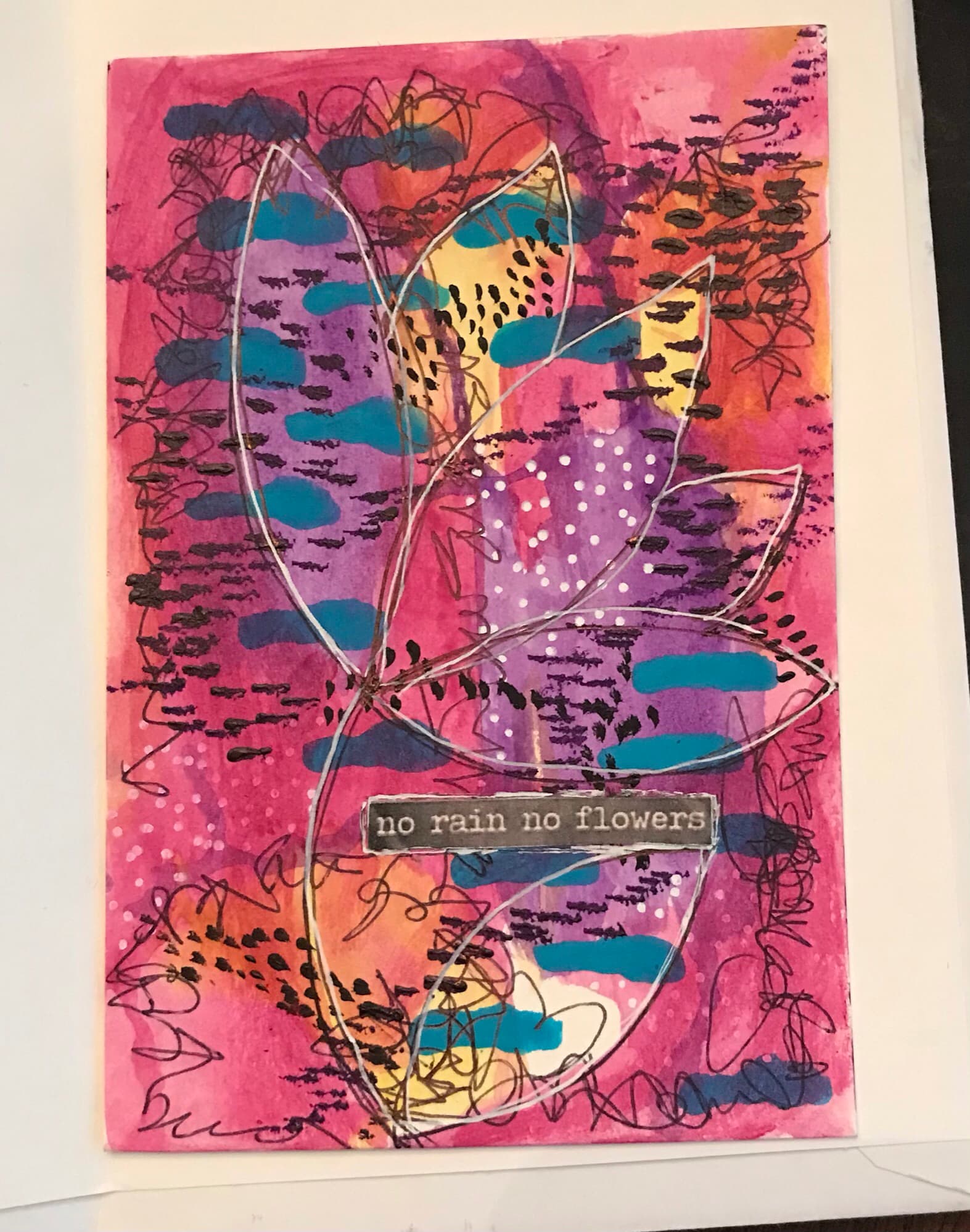 She sent me this amazing watercolor. I have to say, the colors are off here. My phone does not like to get shots of this color pink and it has been raining here. If you have a better pic, please post it. The colors are so beautiful and subtle and calming in real life. It looks like she masked off the white areas. It’s so pretty and well executed.
