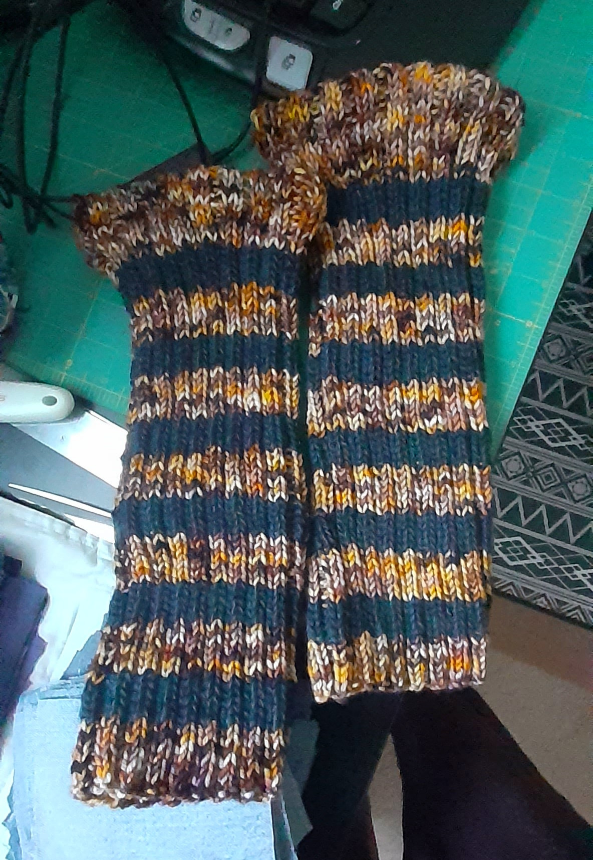 Simple 2x2 rib legwarmers. I’m not sure why the tops flared out when I made the casing so I can tie them securely to my legs, but it’s for me, so I’m not too bothered and functionally it still works fine.