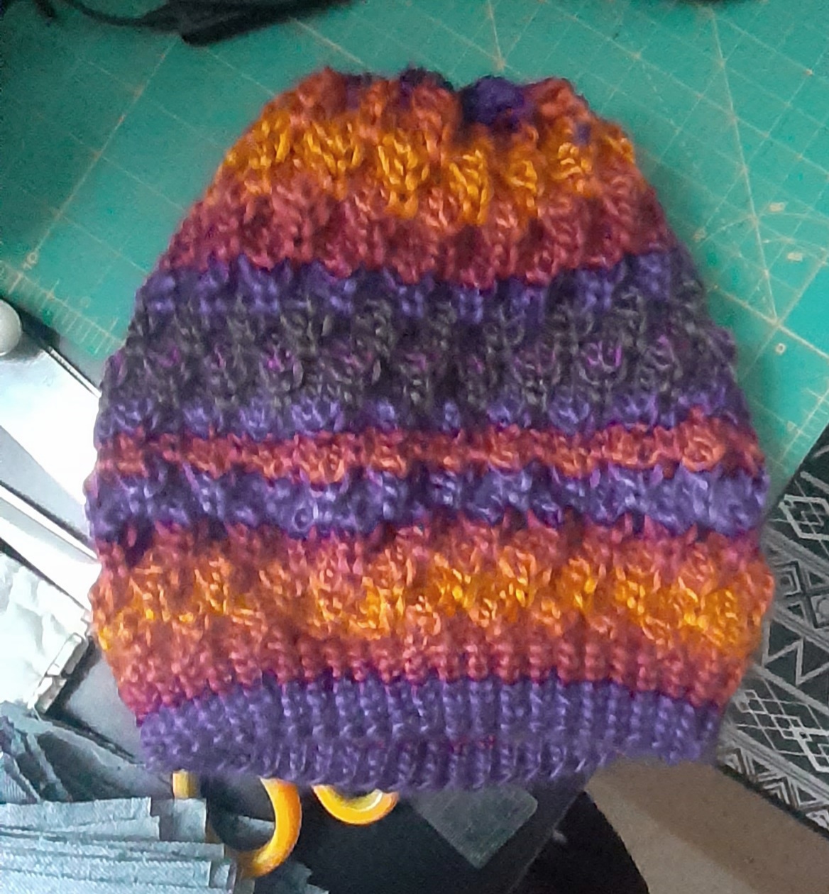Storyteller hat using some a leftover skein of Landscapes yarn. This will be donated. The texture was fun to learn but I forget how splitty and unspun that yarn is so that made knitting a little less fun.