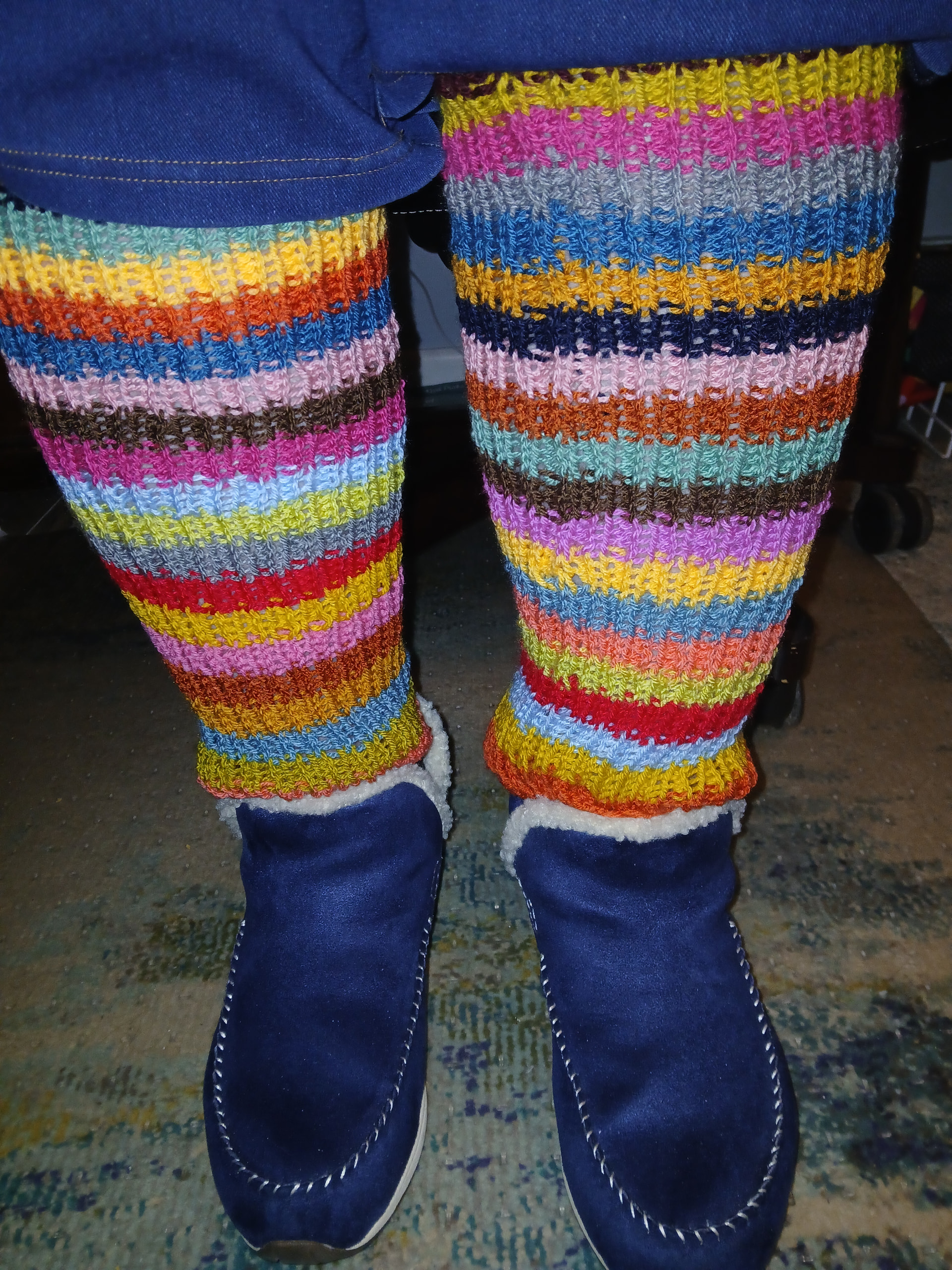 I managed to finish another set of leg warmers; destash some yarn; and organize my yarn stash so I can make things more readily. (I obviously need different jeans to wear these. Wide leg jeans do not tuck easily! )