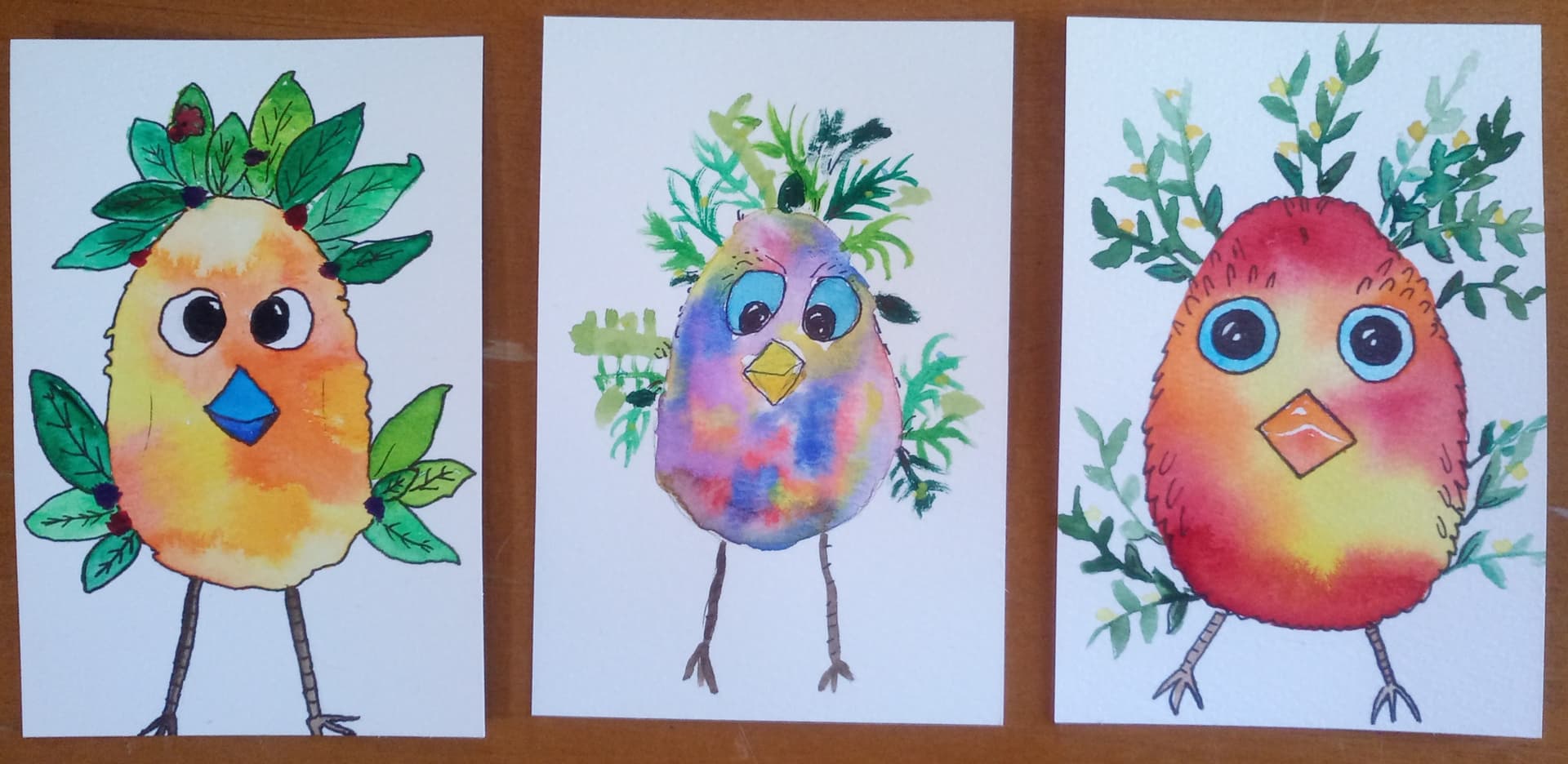 After my kids and I finished our first batch of watercolor postcards, we still needed a few more, so we set off to find another tutorial we liked (postcards are a fun low commitment way to try new things). We settled on this tutorial on youtube…but went a bit rogue again. I painted the one on the right, my son painted the one in the middle, and my daughter painted the one on the left. I like the kids’ birds better than mine…I think they have more personality. I can’t decide if the bids are super clumsy and covered in leaves because they crashed (would definitely be me if I was a bird), or if they are dressing up and wearing the leaves as a spiffy new outfit (would totally fit my kids).