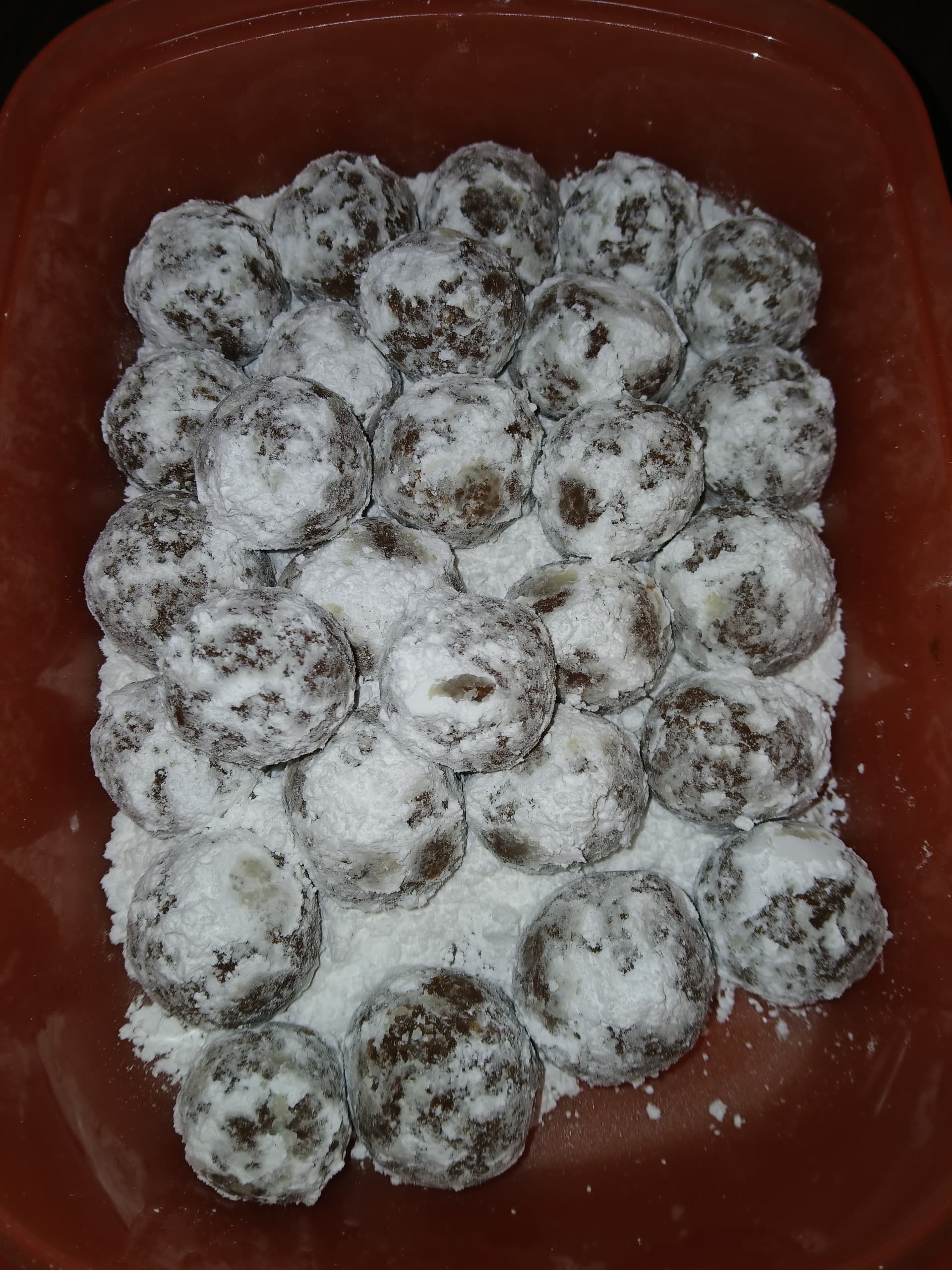 A couple of people made some no bake round ball things, so I looked up round ball cookies and made Rum Balls and Date Balls. Most of the date balls were devoured before I could get a picture, but at least some are left.