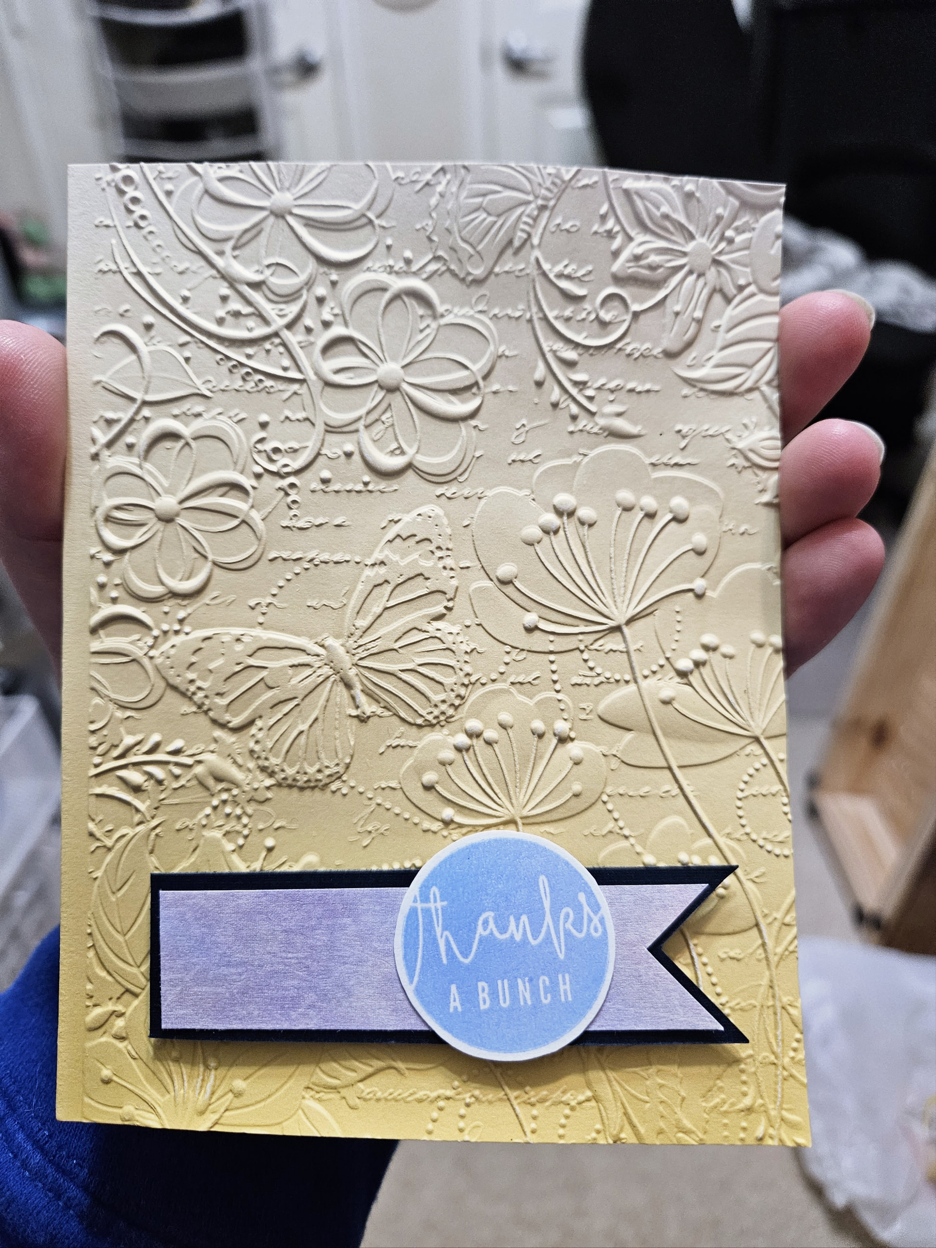 While I have a ton of pre-made cards on hand, it always feels more personal to make something special when I need to send a thank you. I didn’t have a ton of time but used an embossing folder, a stamp, and some patterned paper to throw together these cards recently.