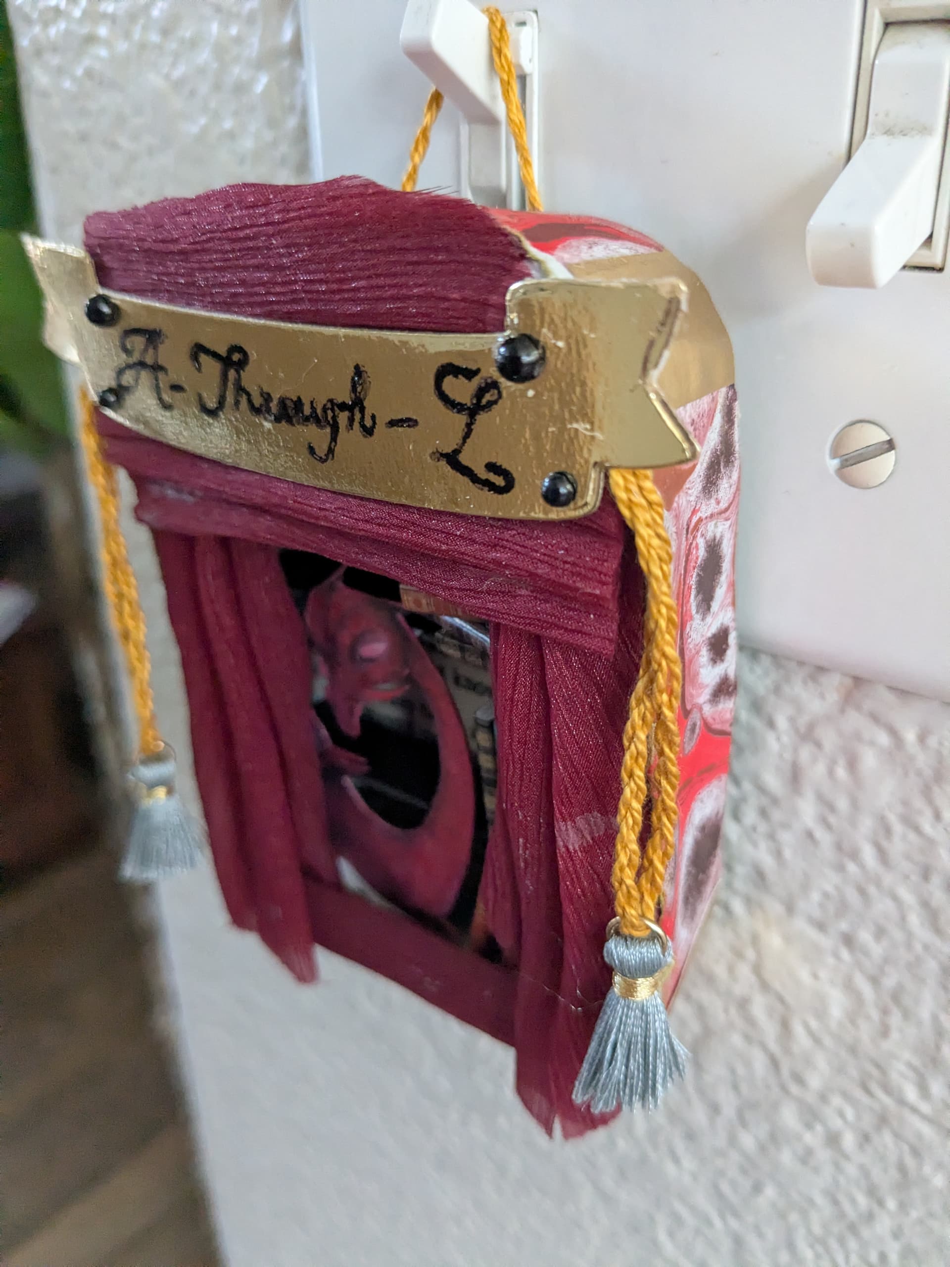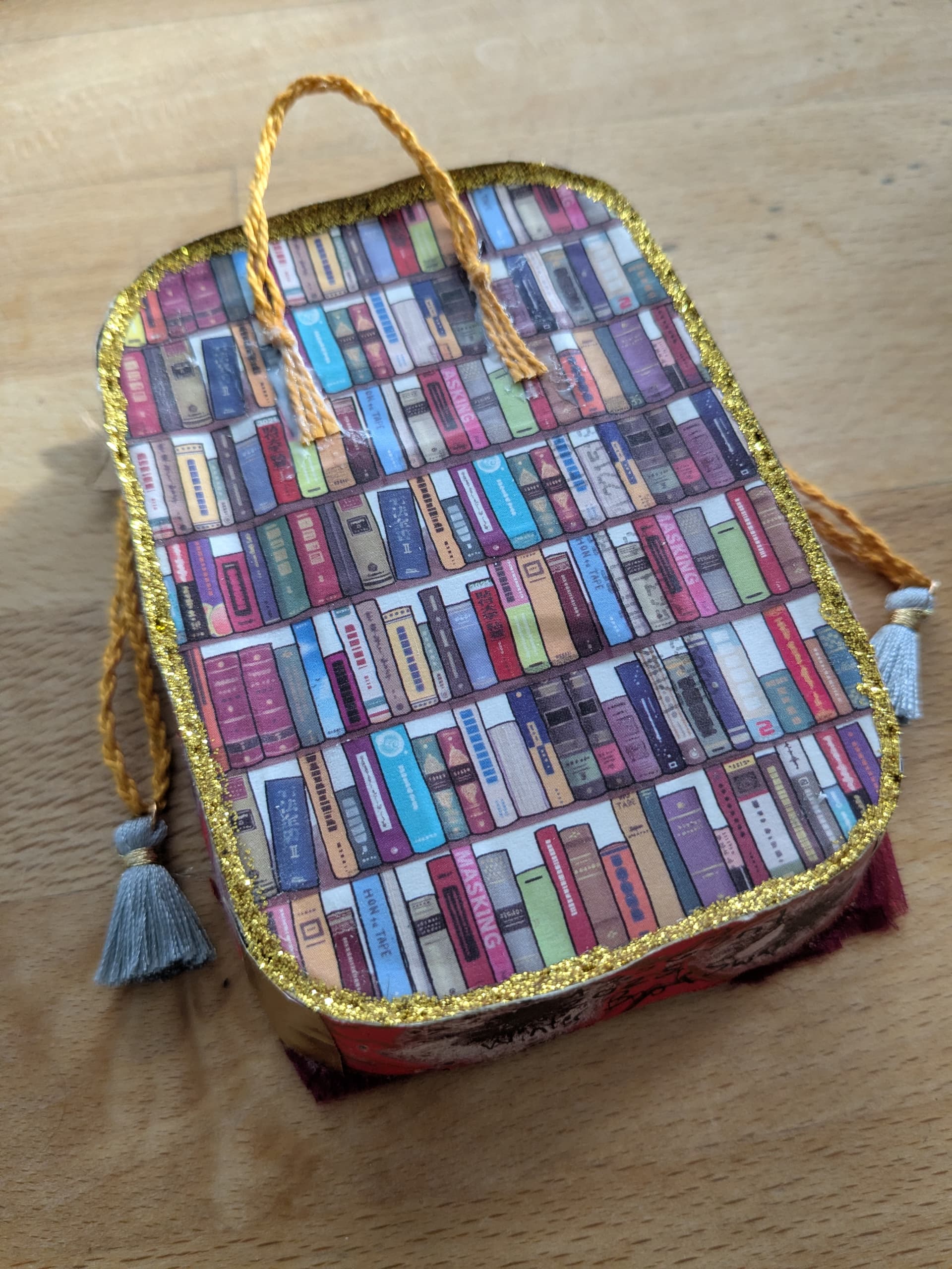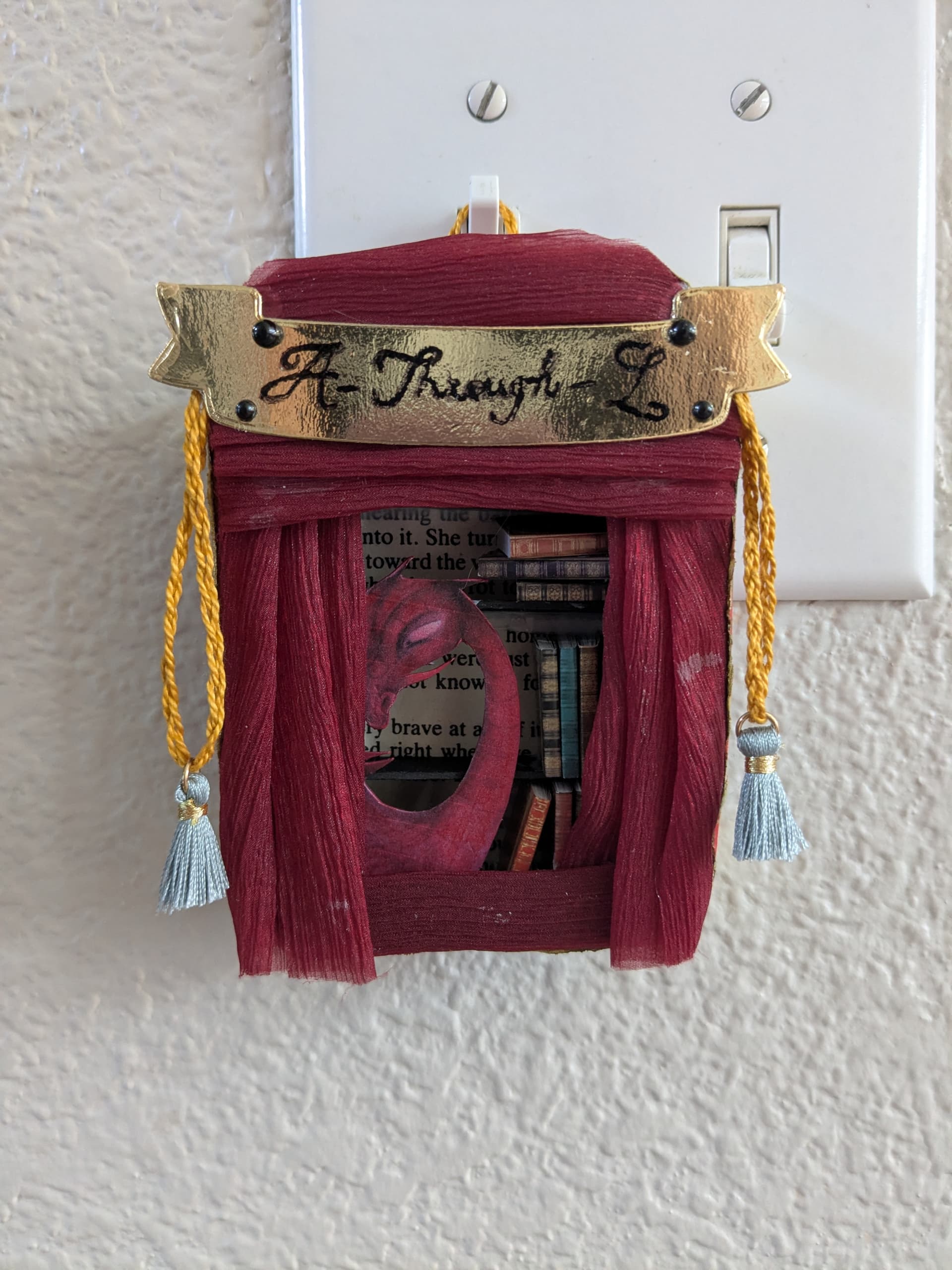 The altered tin features the wyvern named A-Through-L from the Fairyland series of books by Catherynne M. Valente. The books were in B1K’s Goodreads “To Read” list and I was intrigued by the artwork. The wyvern is named thus because he is a wyvern-and-library hybrid. Yep, his father was a library. Fantasy novels can do anything!
