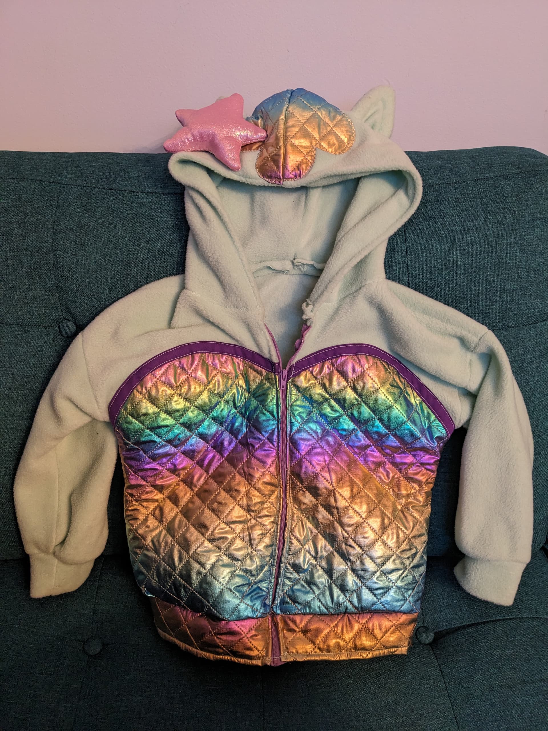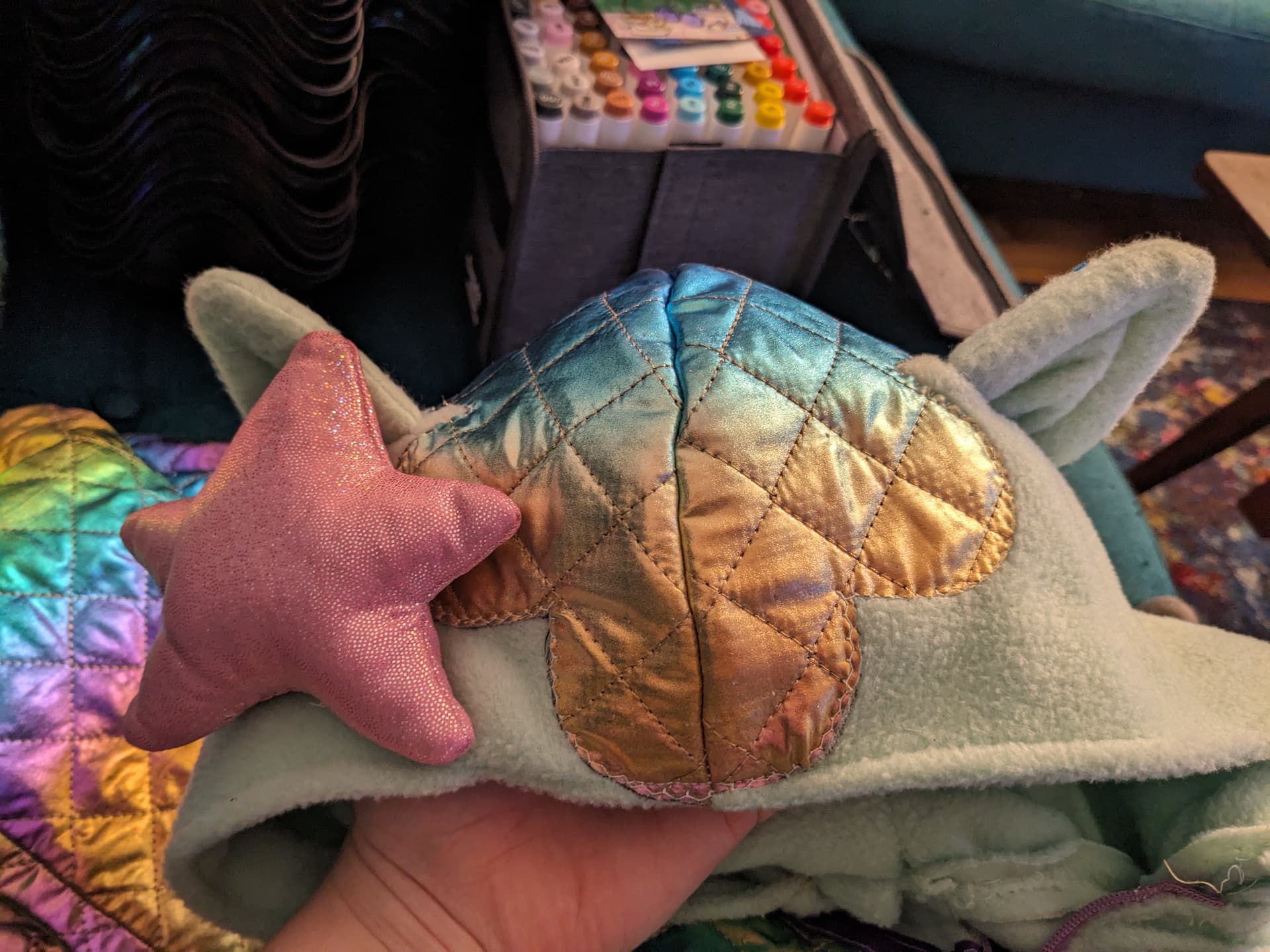 MerCat was a huge undertaking! I knew I wanted something easy to walk in for my little, so decided on essentially making a track suit. The quilted fabric has no give whatsoever so it was easy to sew but hard to fit. I made the pants first, and freehanded some fins to attach to the back. The hoodie was an adventure to figure out - I took the existing pattern and made a secondary piece for the mermaid top which I sewed on. The head piece was done in the same manner, and ears attached to the sides. I then made the star and attached it in a few places so it wouldn’t wobble. If I did it again I’d make the whole hood a bit bigger, as it had a tendency to flop off her head.