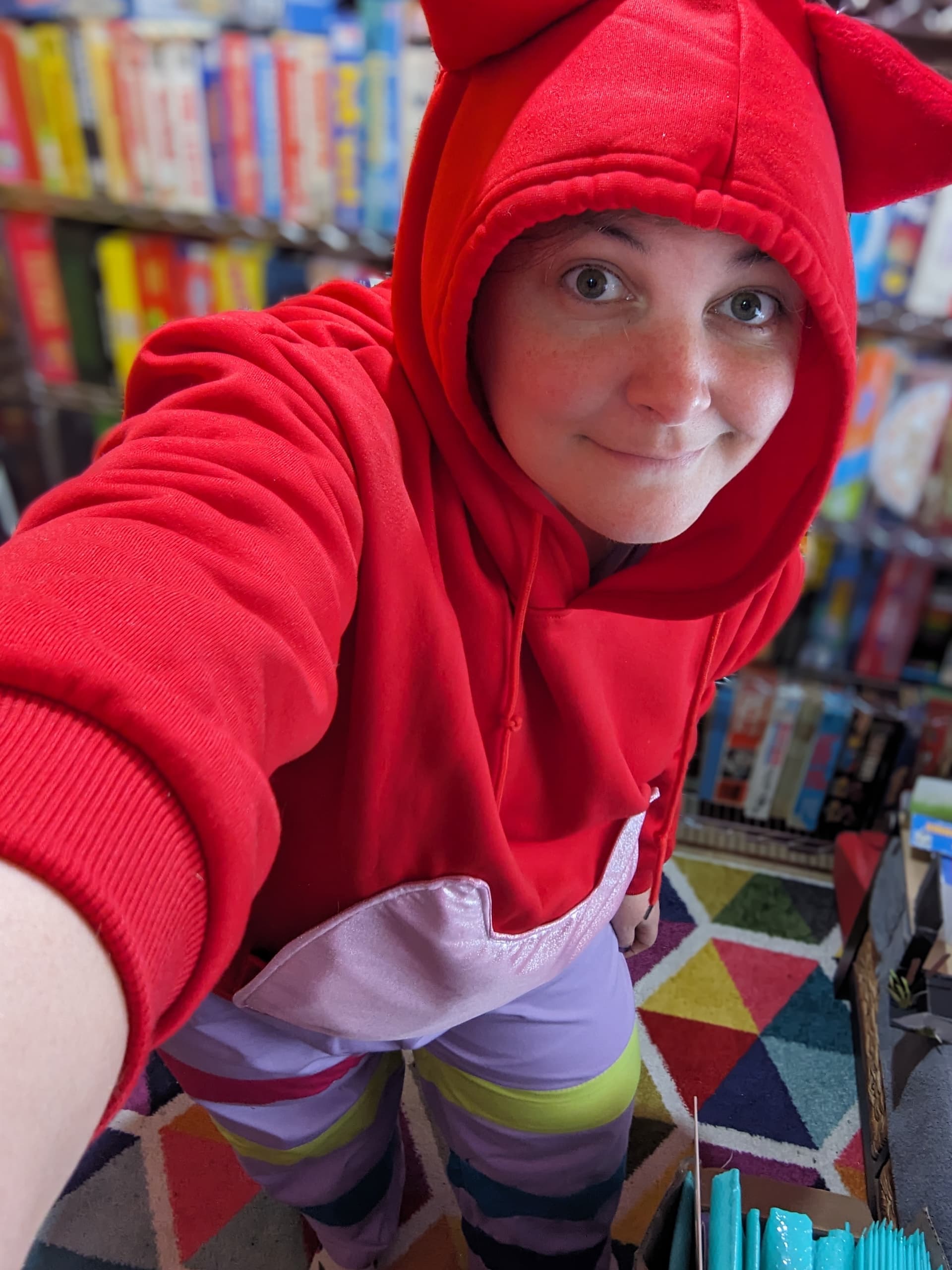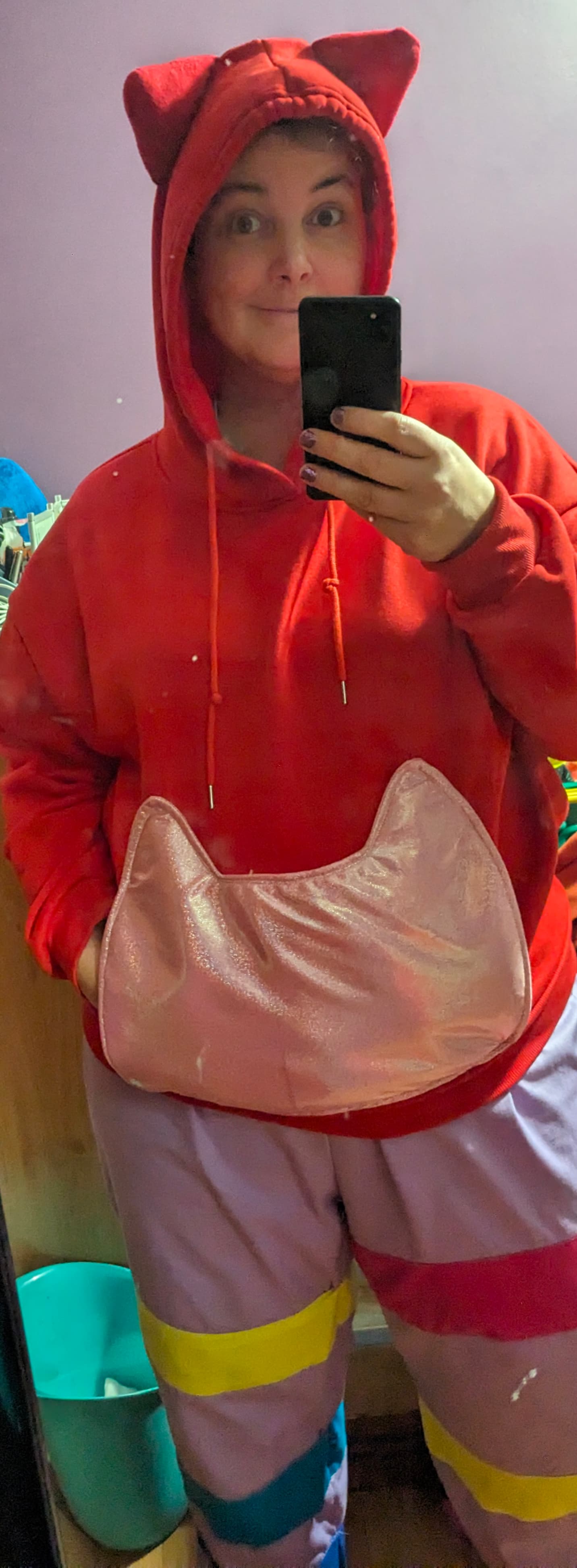 DJ Catnip started with a red hoodie. Added the ears and sparkly cat head shaped pocket (measured to fit over the existing hoodie pocket so I still had a pocket!) Striped pants were sewn from scratch - started by making a pair of purple pajama pants and then adding on all of the stripes. In hindsight, making the striped fabric and then making the pants may have been wiser, but my brain couldn’t handle the math at that point, haha. I also made a striped tail with an elastic that fit around my waist, so I could take it off as I wanted.