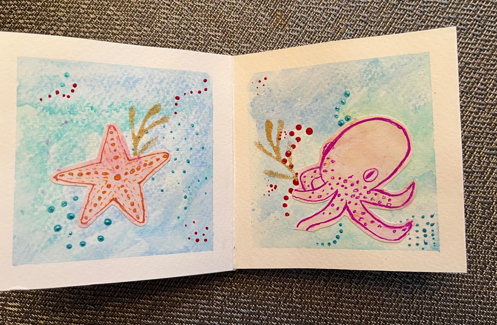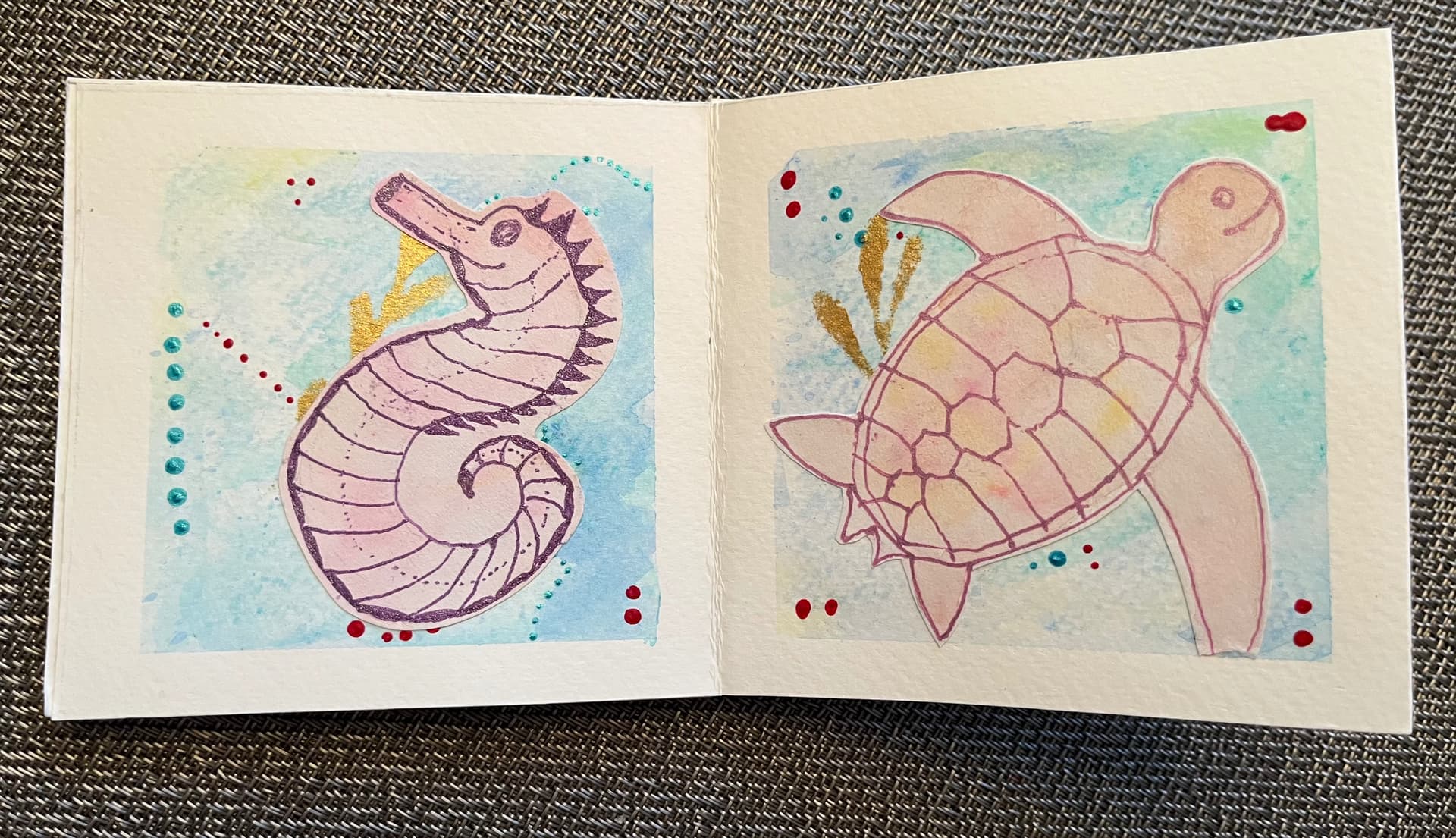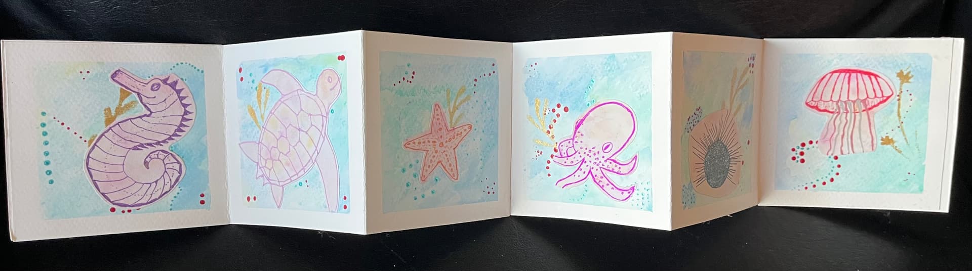 Each set of pages of dreamy colored sea creatures