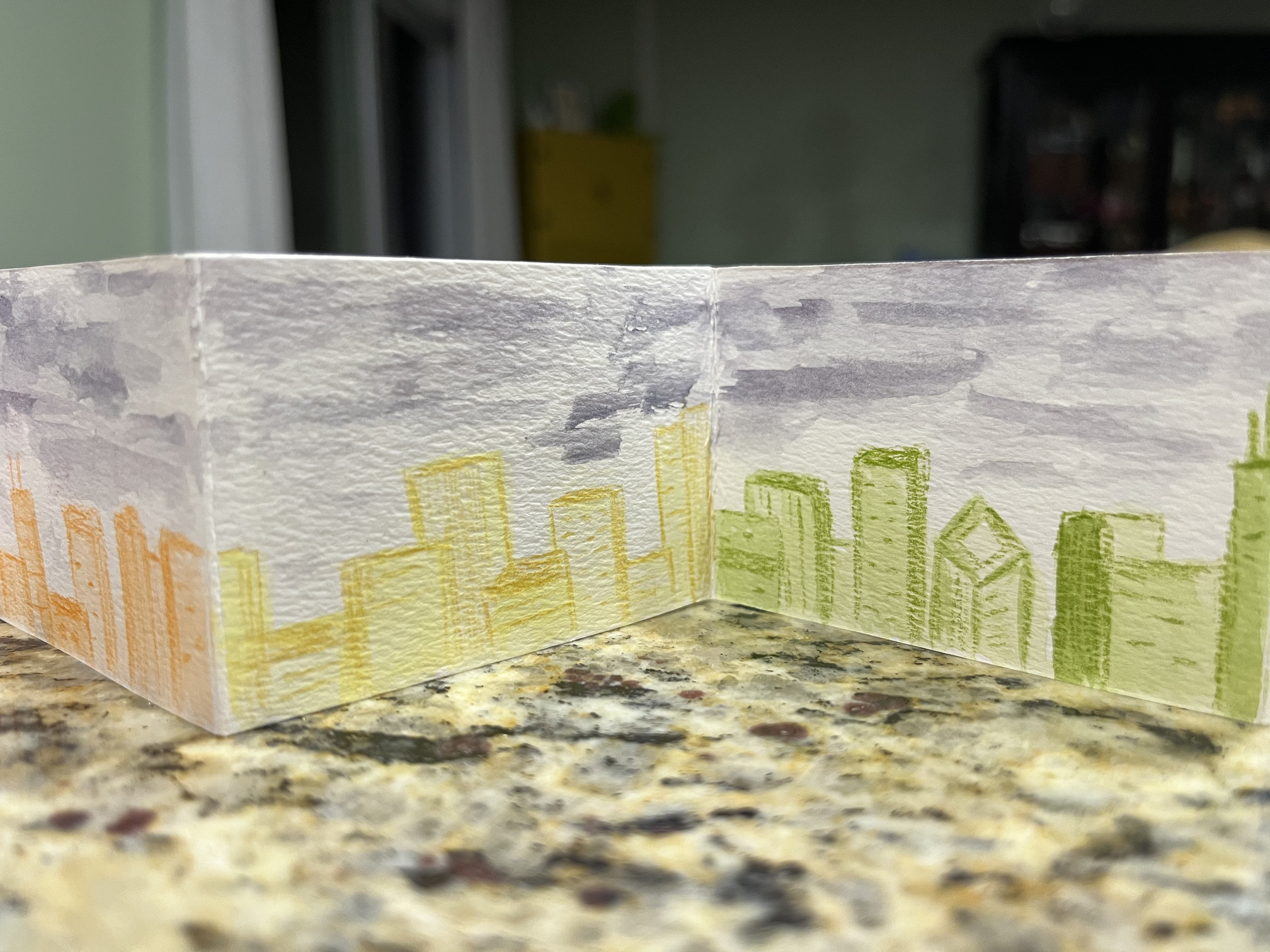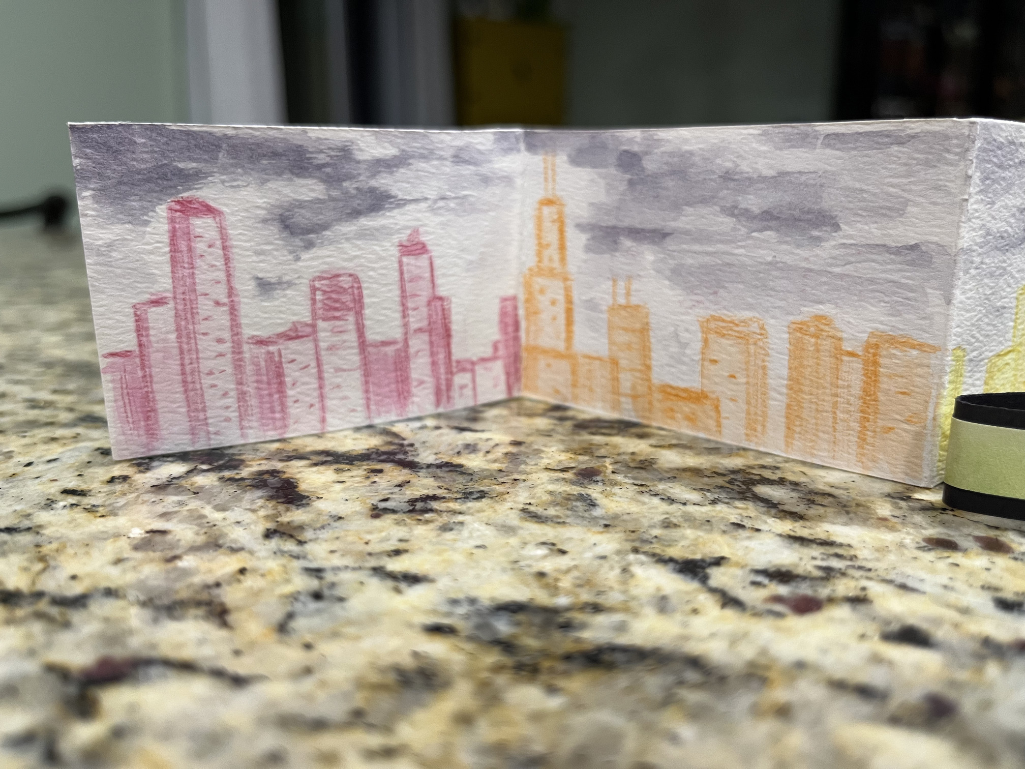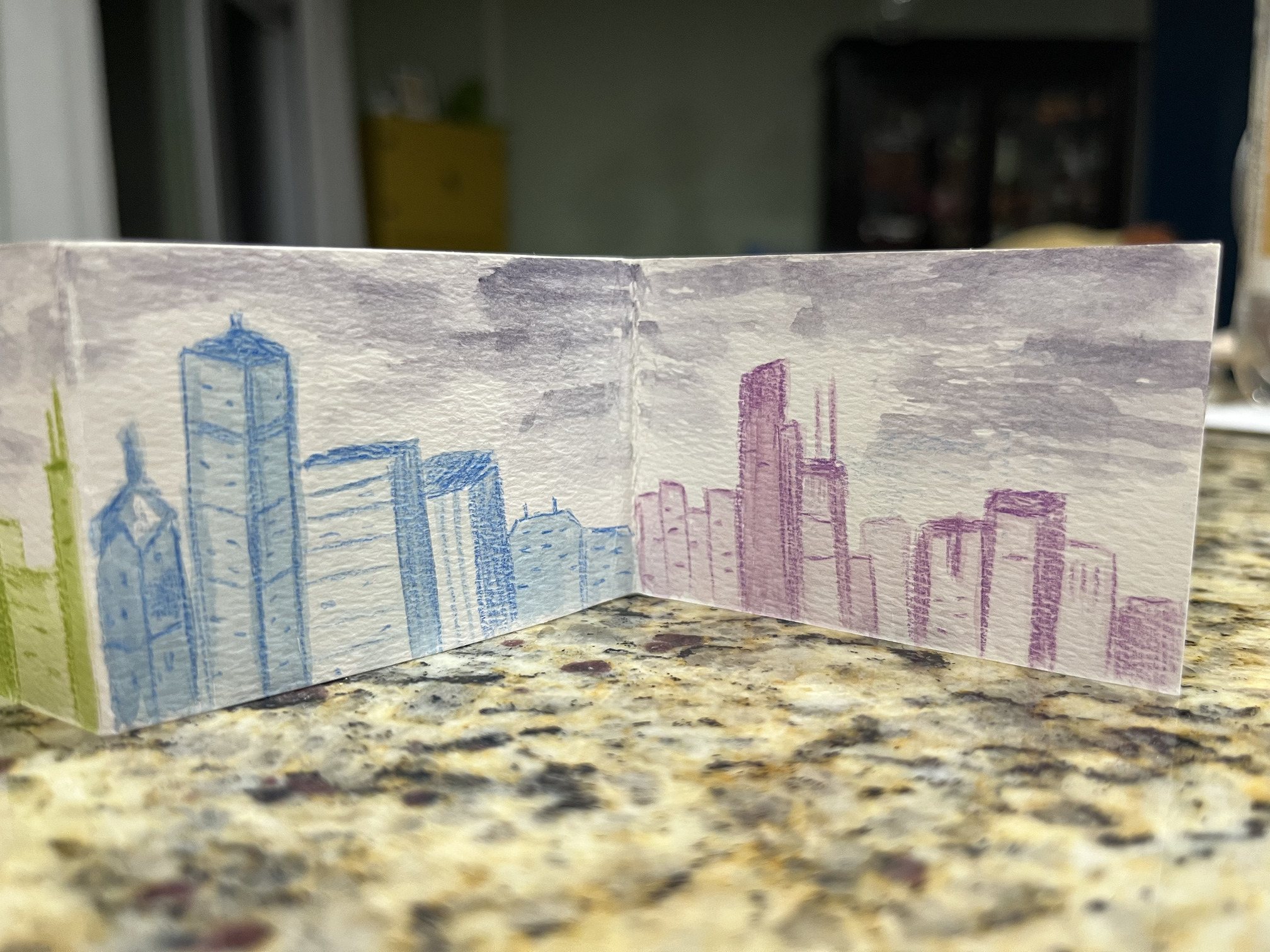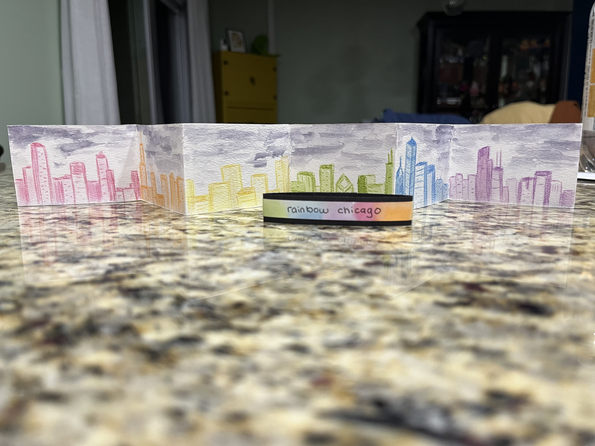 I received the most spectacular accordion book from @photojenn. She combined a few of my themes, sketchy, rainbow and cityscape. I love this little book so very, very much! It must have taken forever to draw this cool city. Living close to Chicago, I even recognize some of the buildings.