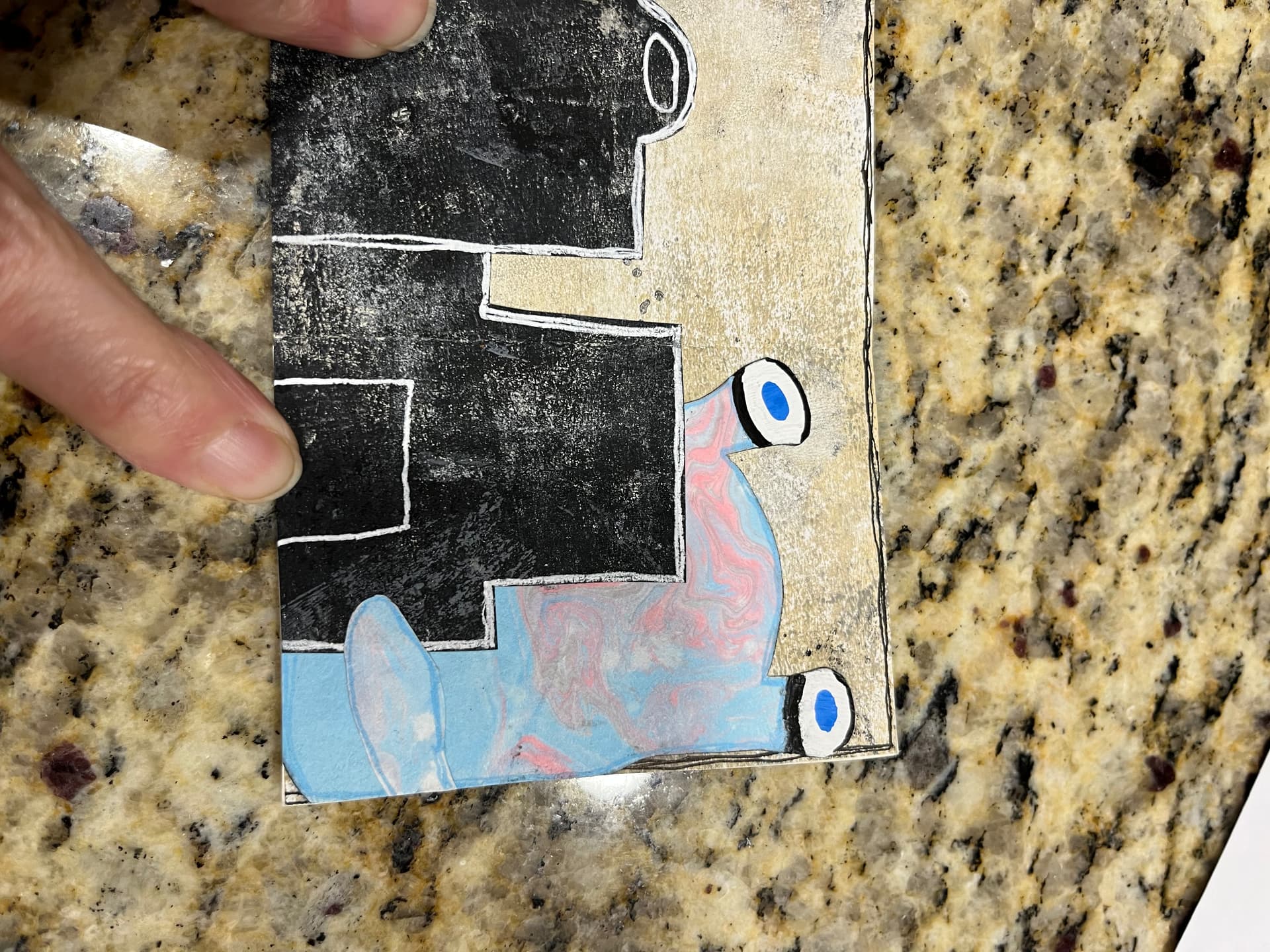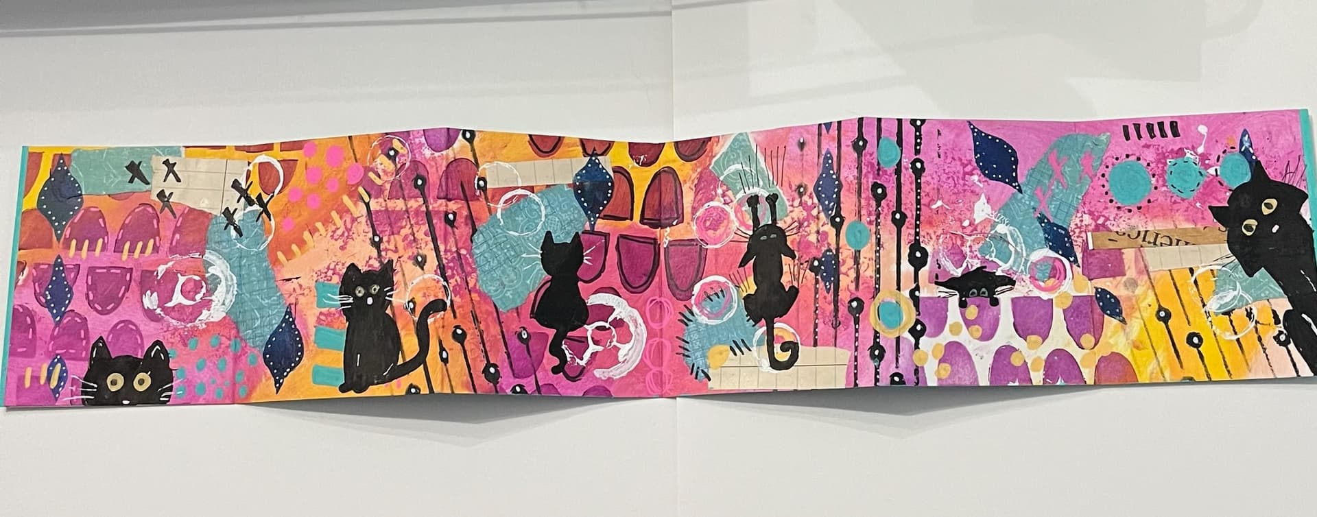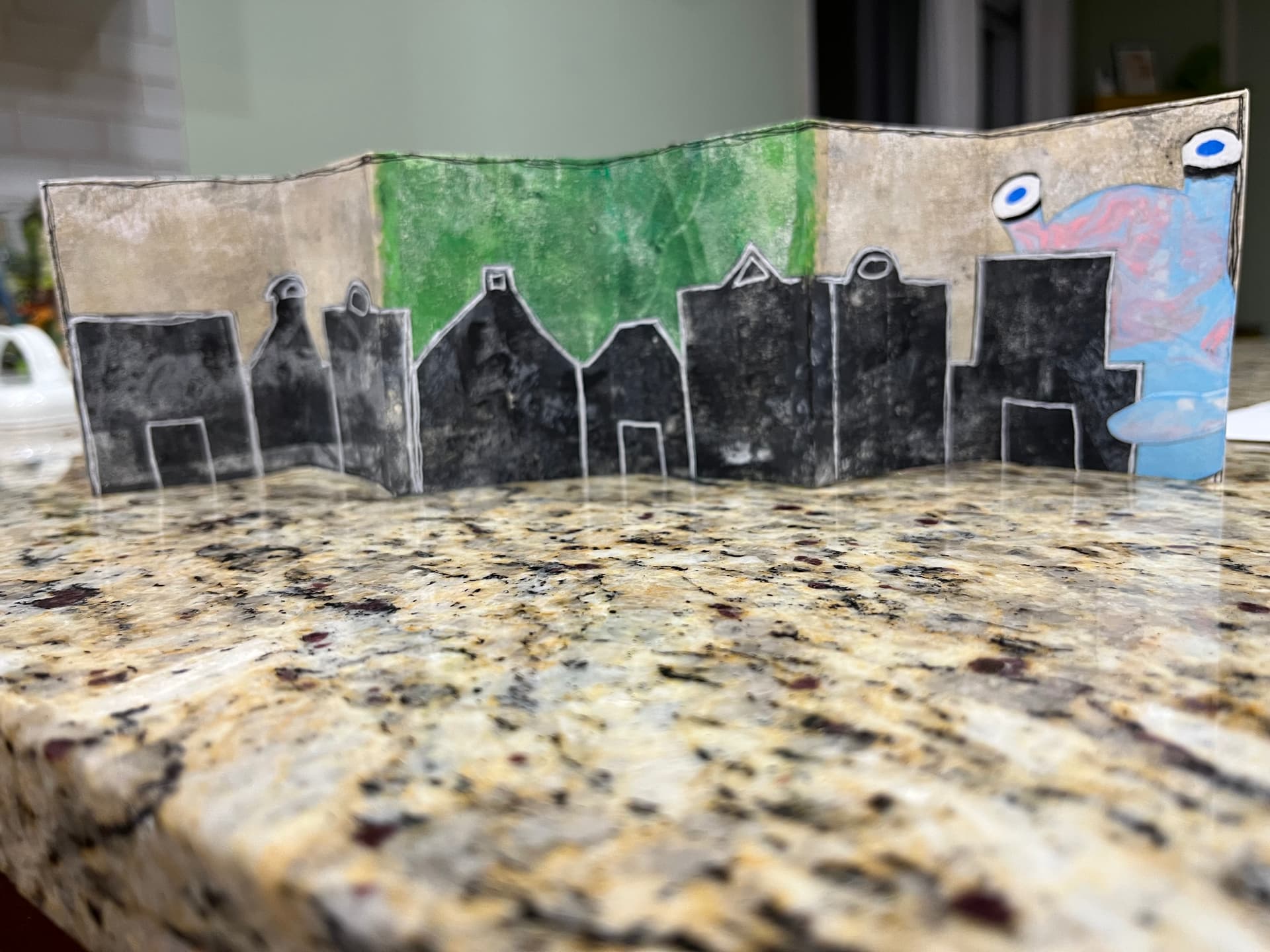 Check out this accordion book! She mashed up several of my themes. Black and white with pops of color, cityscapes, and monsters.