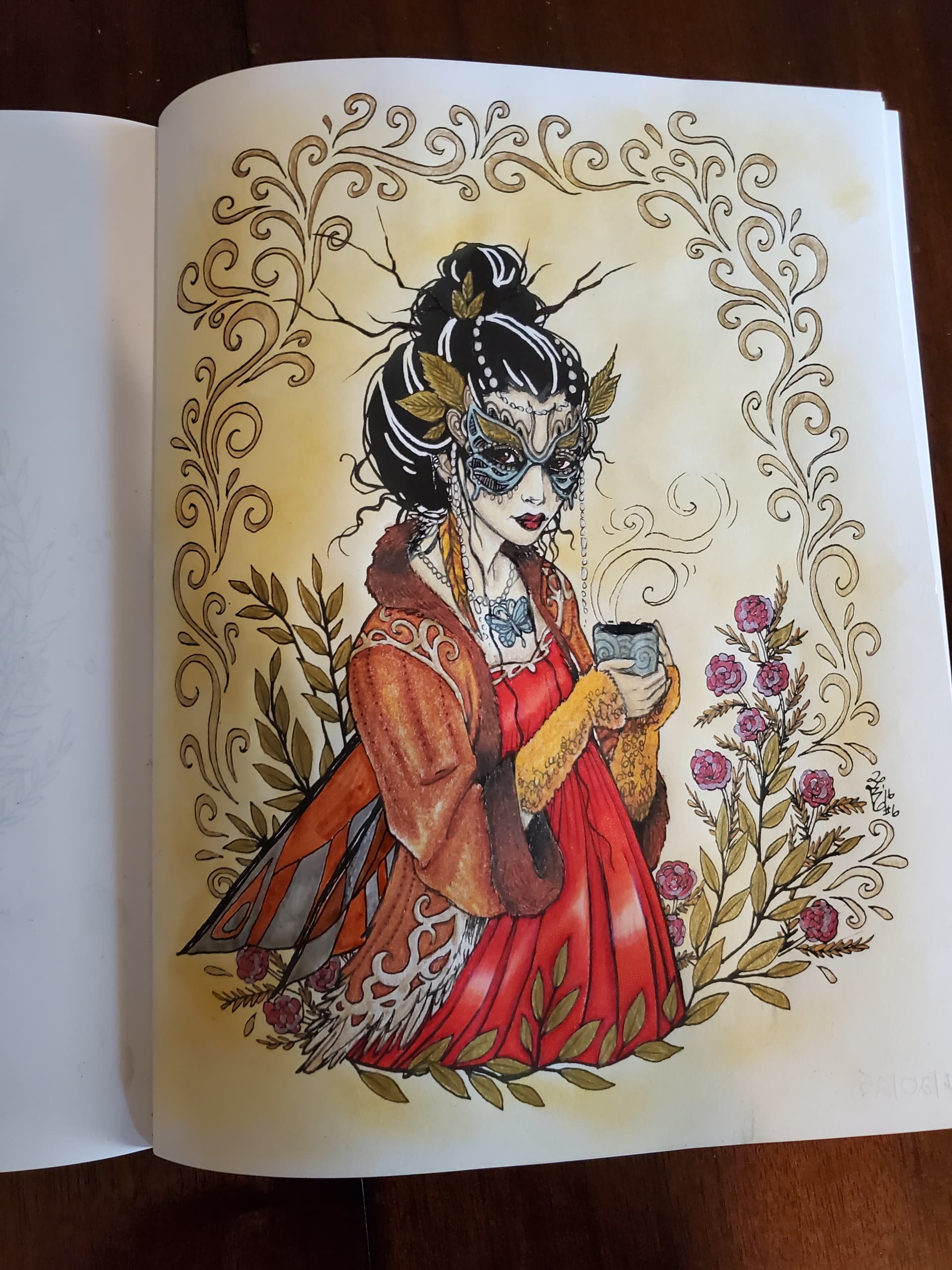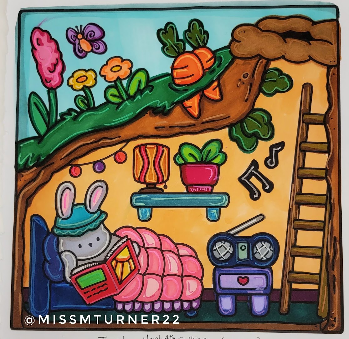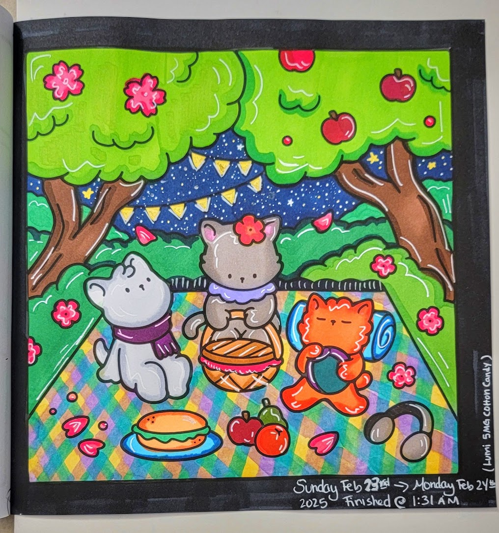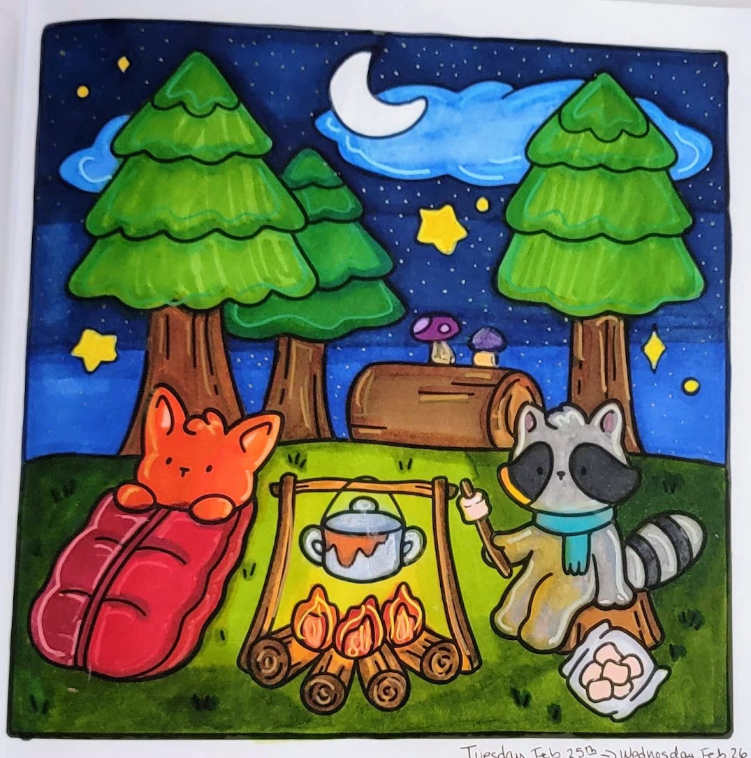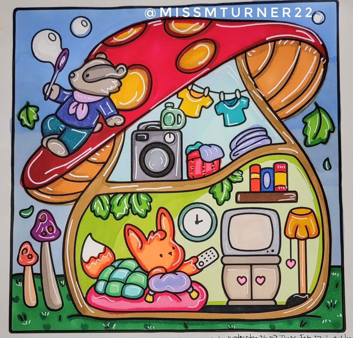 I’ve gotten back into coloring the past few months. It’s something I do at the end of the night to wind down and relax before hitting bed. I’ve been working with “cozy” books lately + alcohol markers (with accents done in acrylic paint markers) to keep it simple and easy and stress-free. I’ve been working on developing my personal “style” and way of doing the coloring.