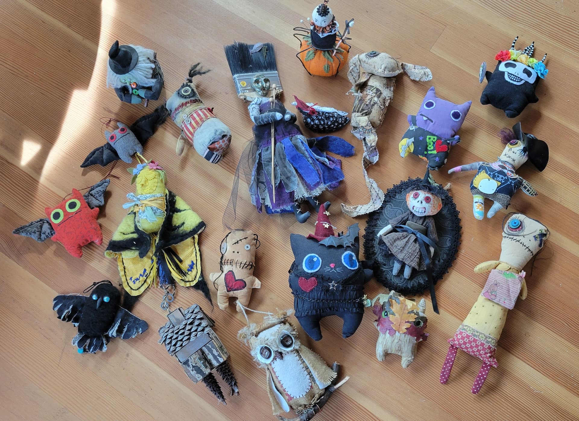 I pulled all my creepy and cute dolls down from a high shelf and elsewhere. Beware, this is what years of swaping gets you! Only a few are my creation. I think mt Trunk or Treat creepy doll emporium will be well stocked. I also found my mother’s porcelain baby doll with the arms and legs falling off (creepy repair shop vibe), doll arms, and a couple of kewpie dolls. Now for a costume….