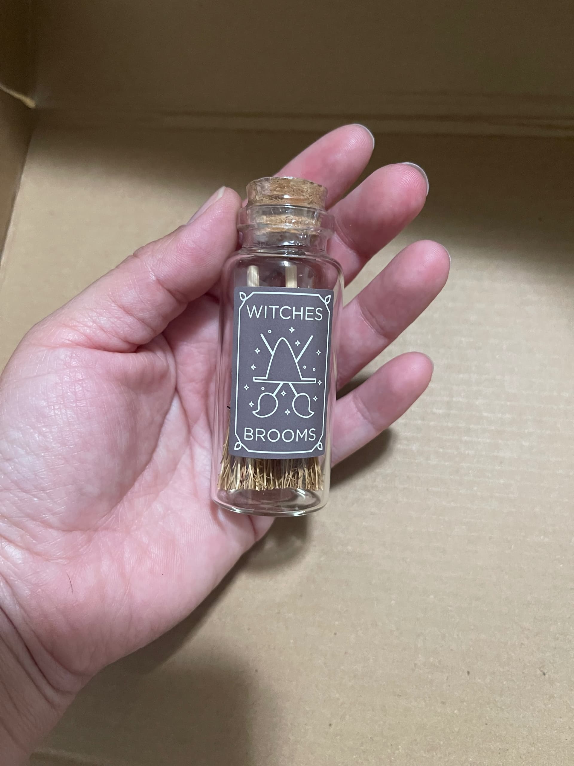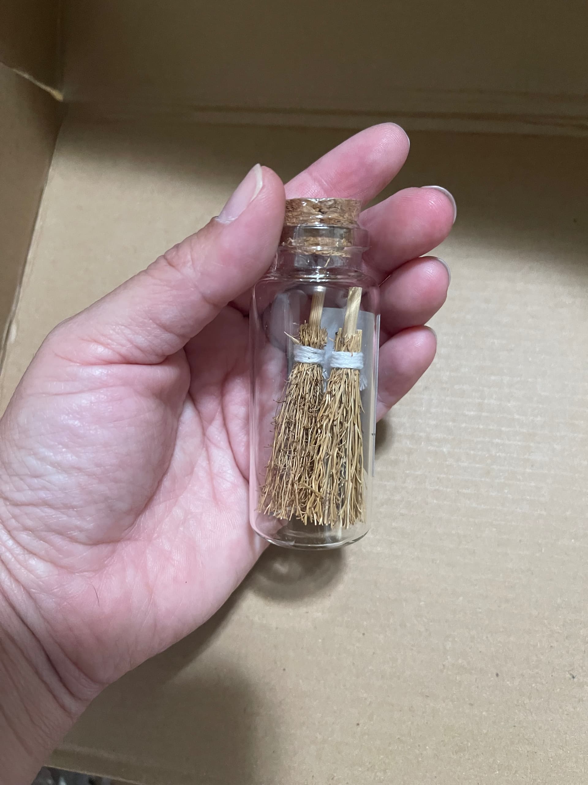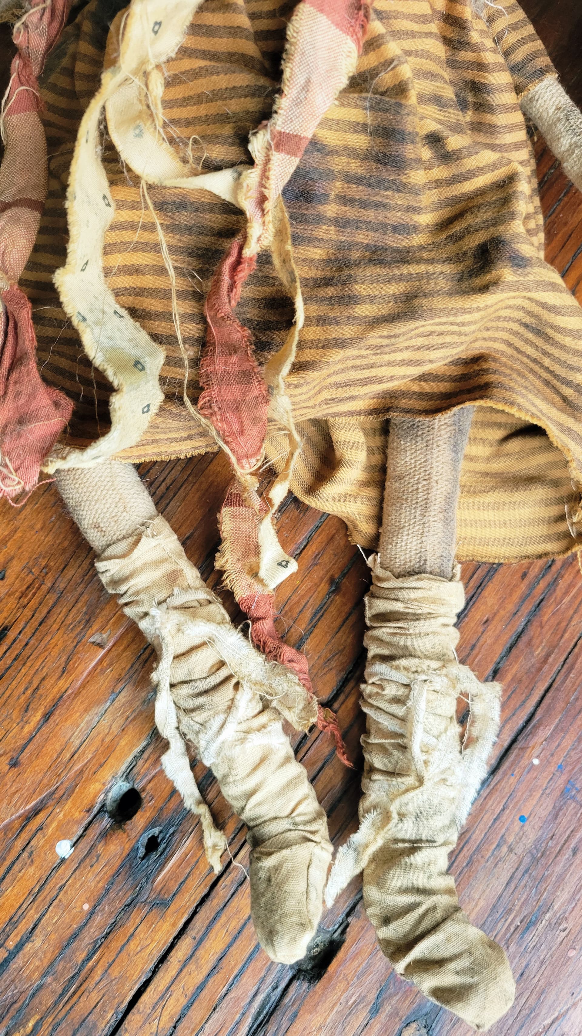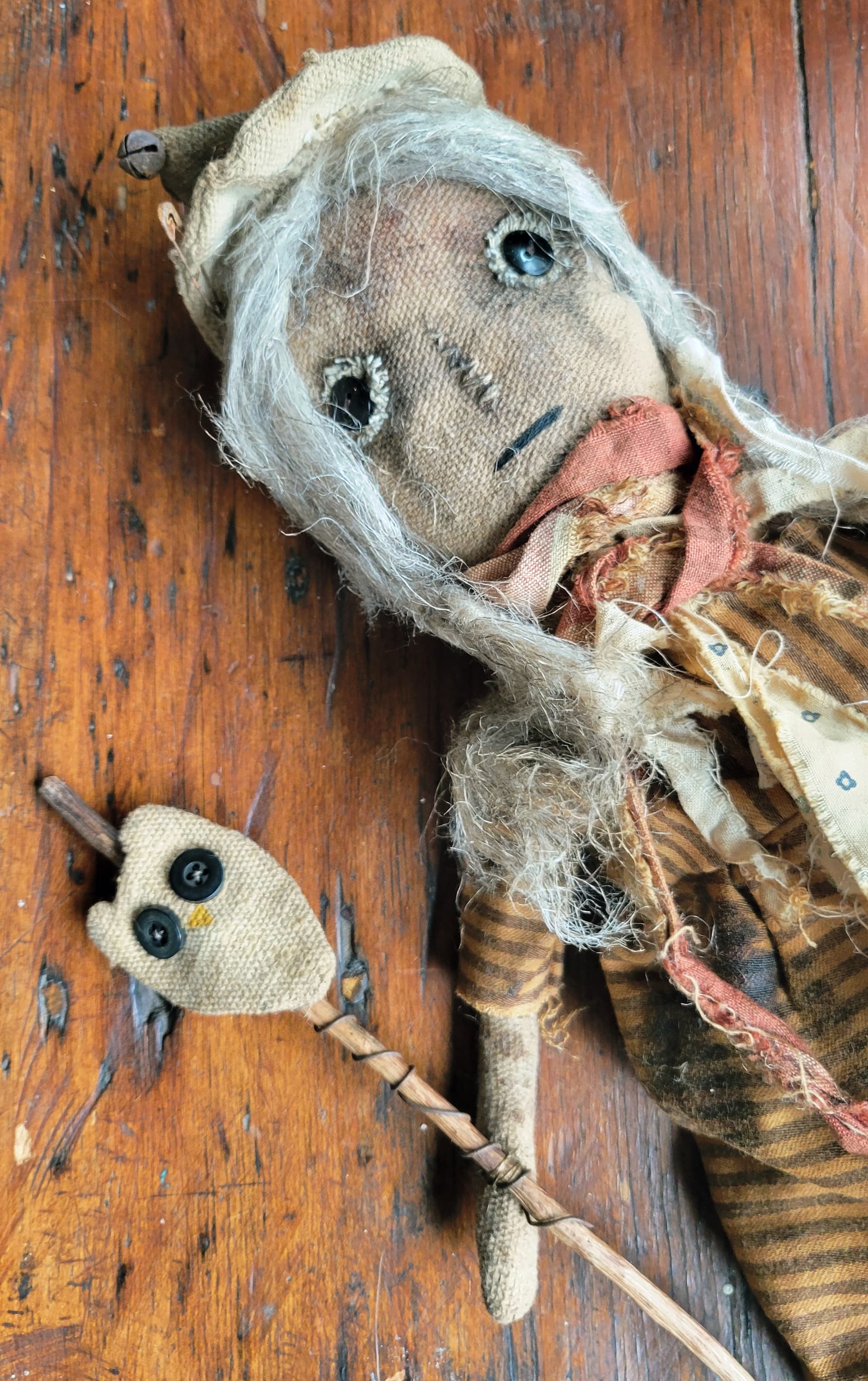 @Rlynn sent the cutest witch to warm my heart!. She has long gray hair and sparkly eyes. I love her hat and her mummy wrapped feet, which pair scrappily with her striped dress. And she even has her familiar owl perched on her staff. What a treat. She will figure prominently in my Trunk and Treat creepy doll deco this year. And front and center on the doll shelf year-round