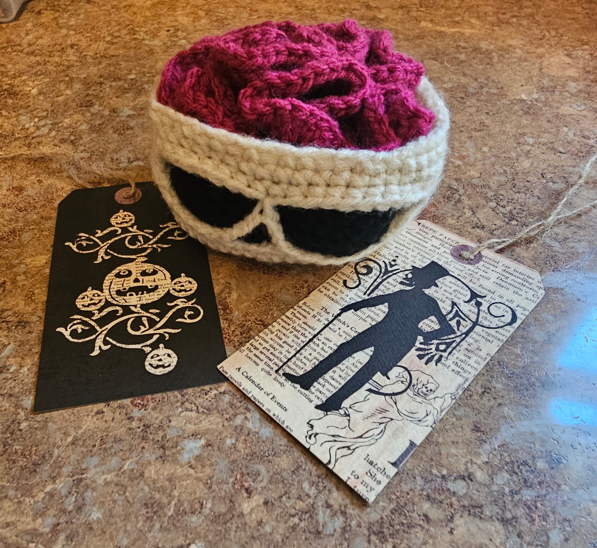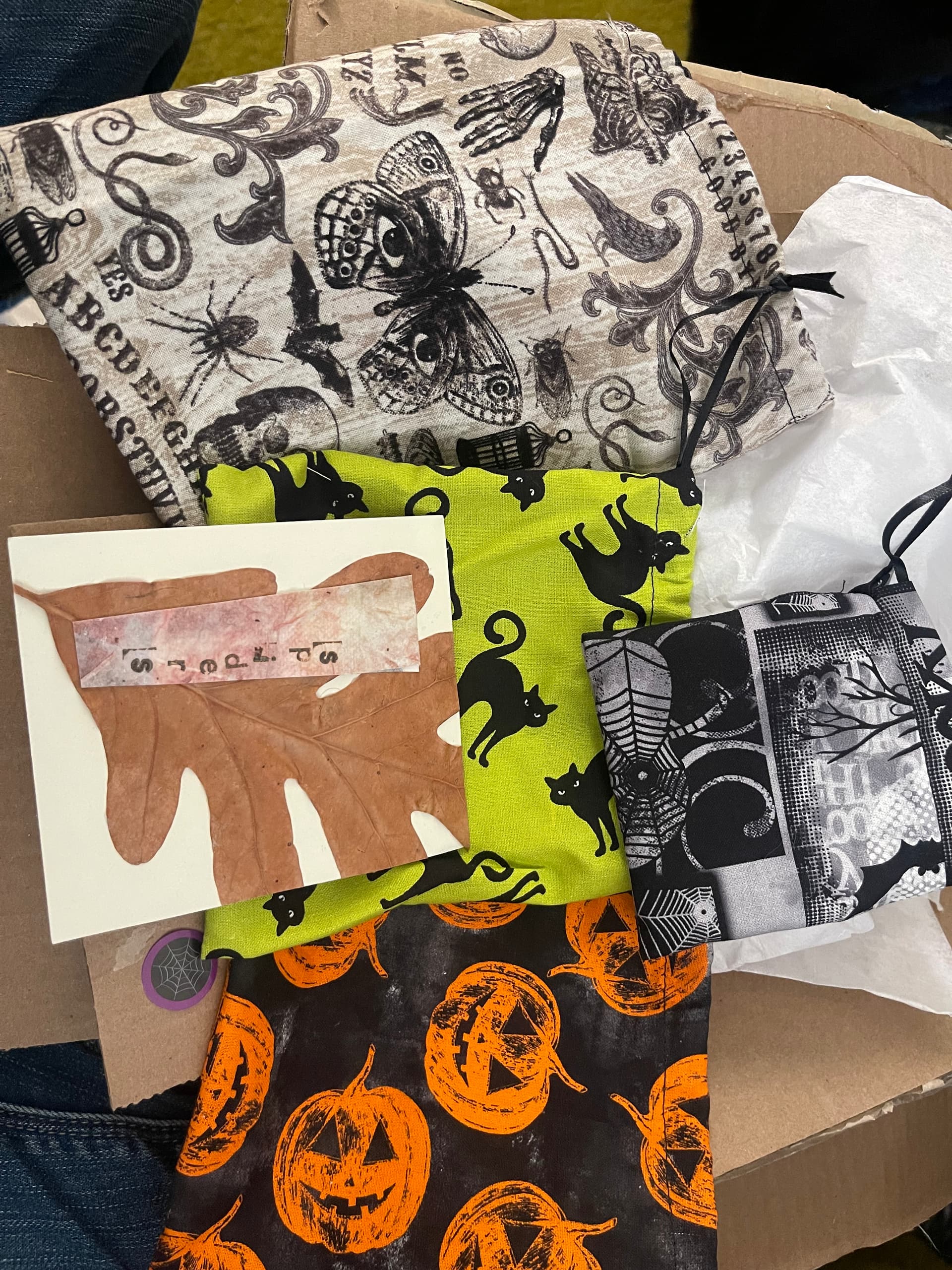 And then every single item was wrapped in tissue paper and tucked into these spooky cloth gift bags. The card carries a hint of what my swap gifts are….![]()
