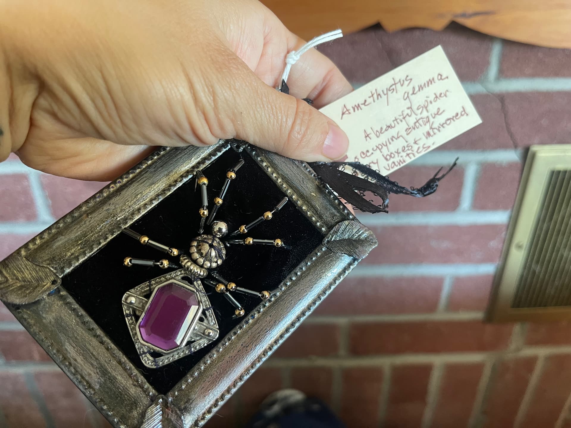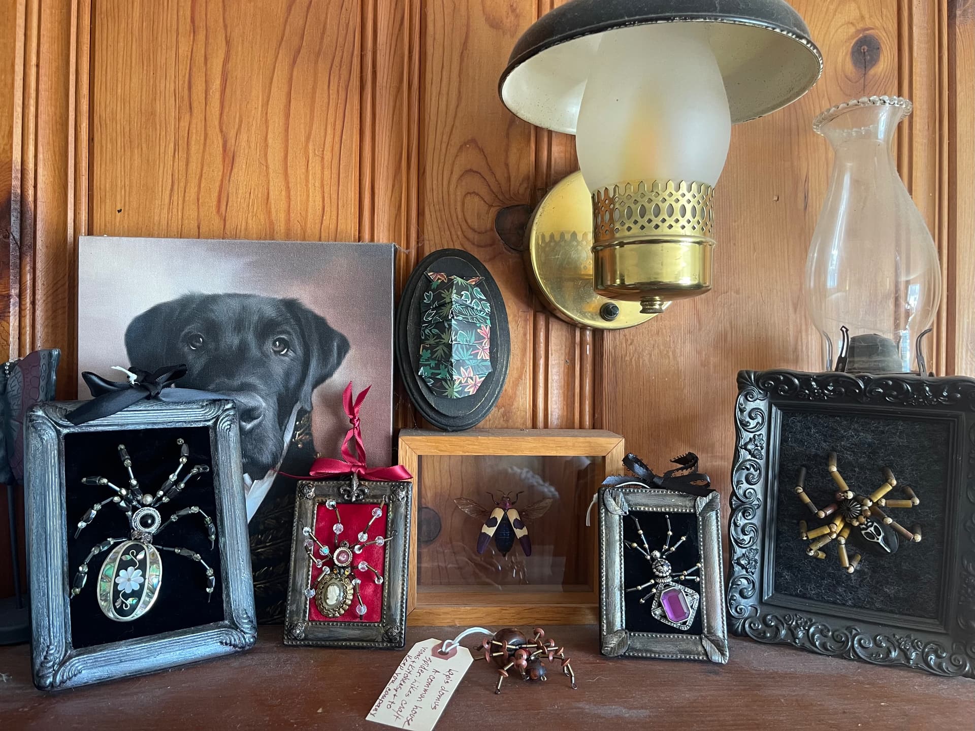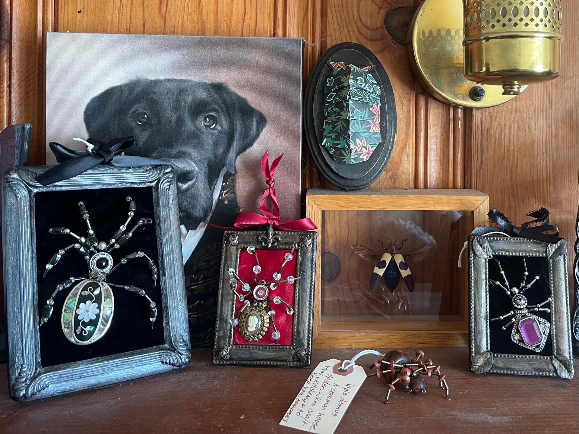 I do want to note that they are also joining a beautiful beaded spider that @Reese52 made me in a Halloween swap last year as well. You can also spot the cool pillbug origami wood plaque that @Manders made me. Here’s the pic zoomed out so you can see all my framed spiders.