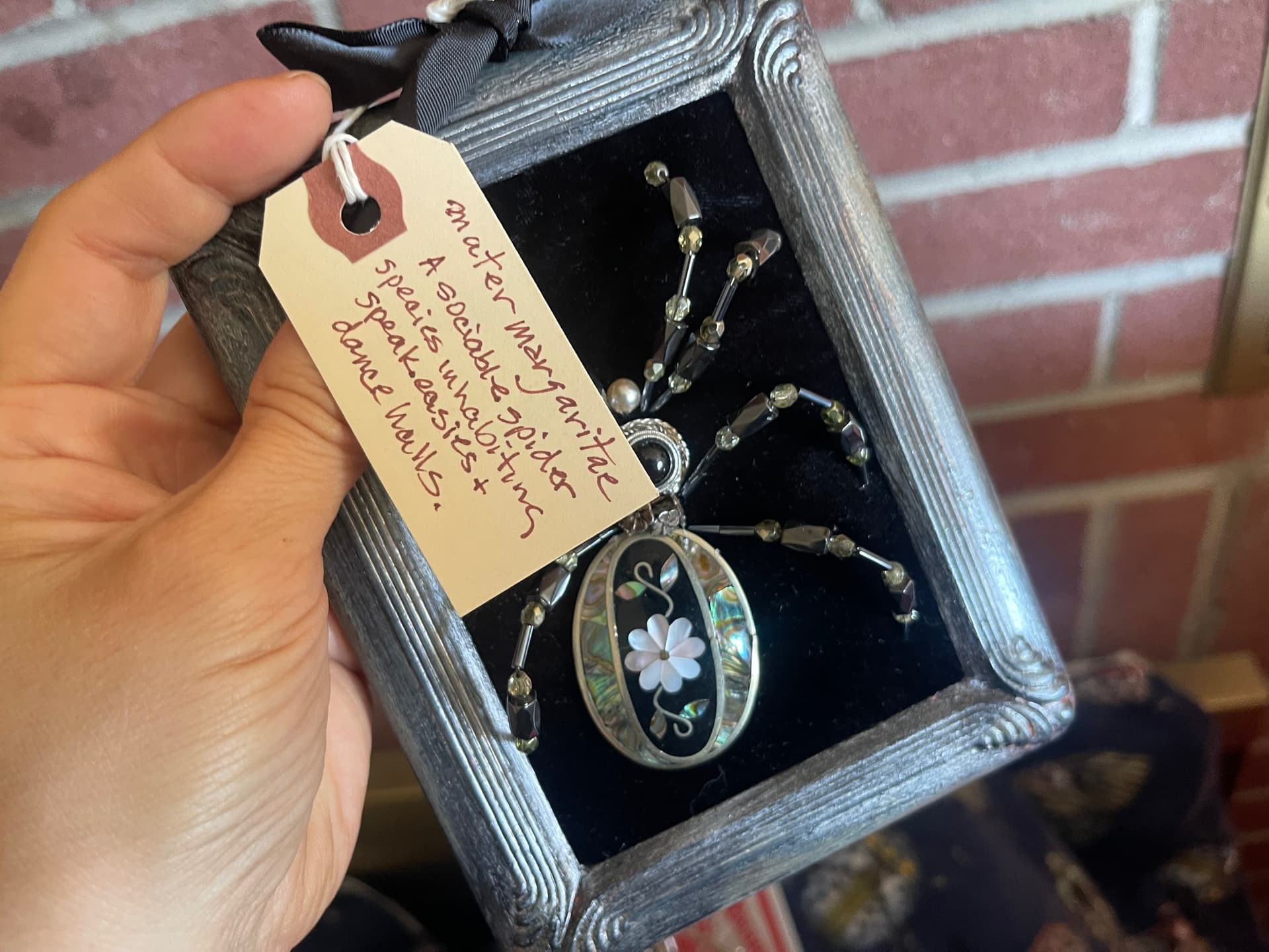 Do you see my gorgeous beaded spiders on the mantel? The three in the frame and the free range one with the tag? Aren’t they fabulous?!