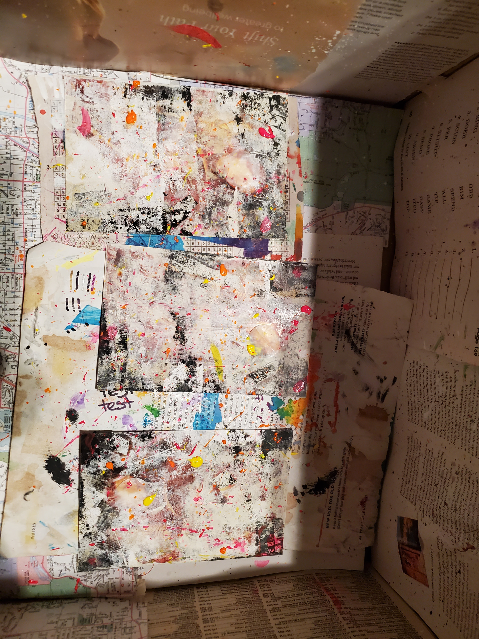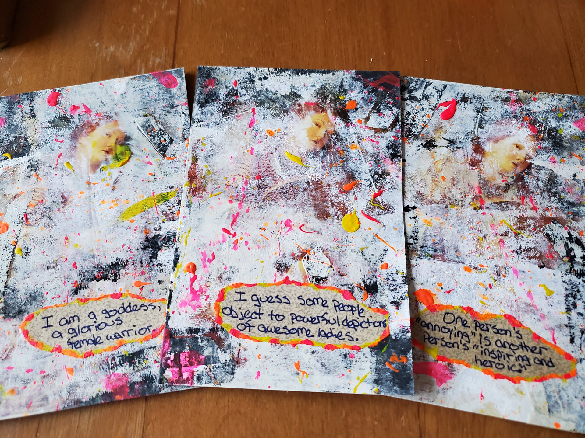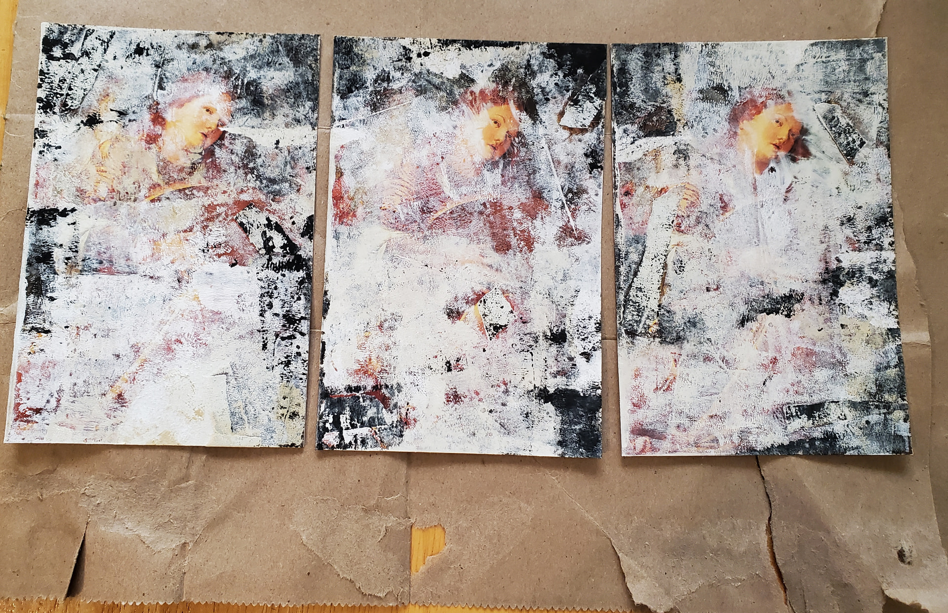 I distressed the surface with an old emery board, patches of clear gesso, tearing up bits of the image – I was making it up as I went along . I brayered over the surface with various neutral colors of craft paint, trying to avoid the faces but just wiping it away if necessary. Then lots of chunky bright splatters.