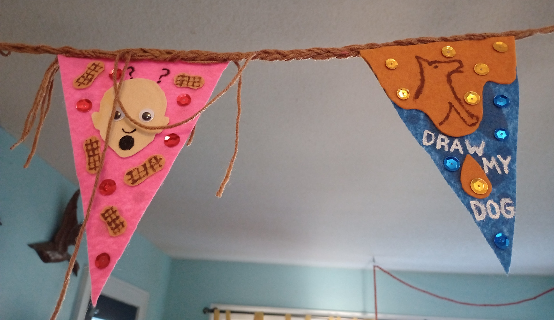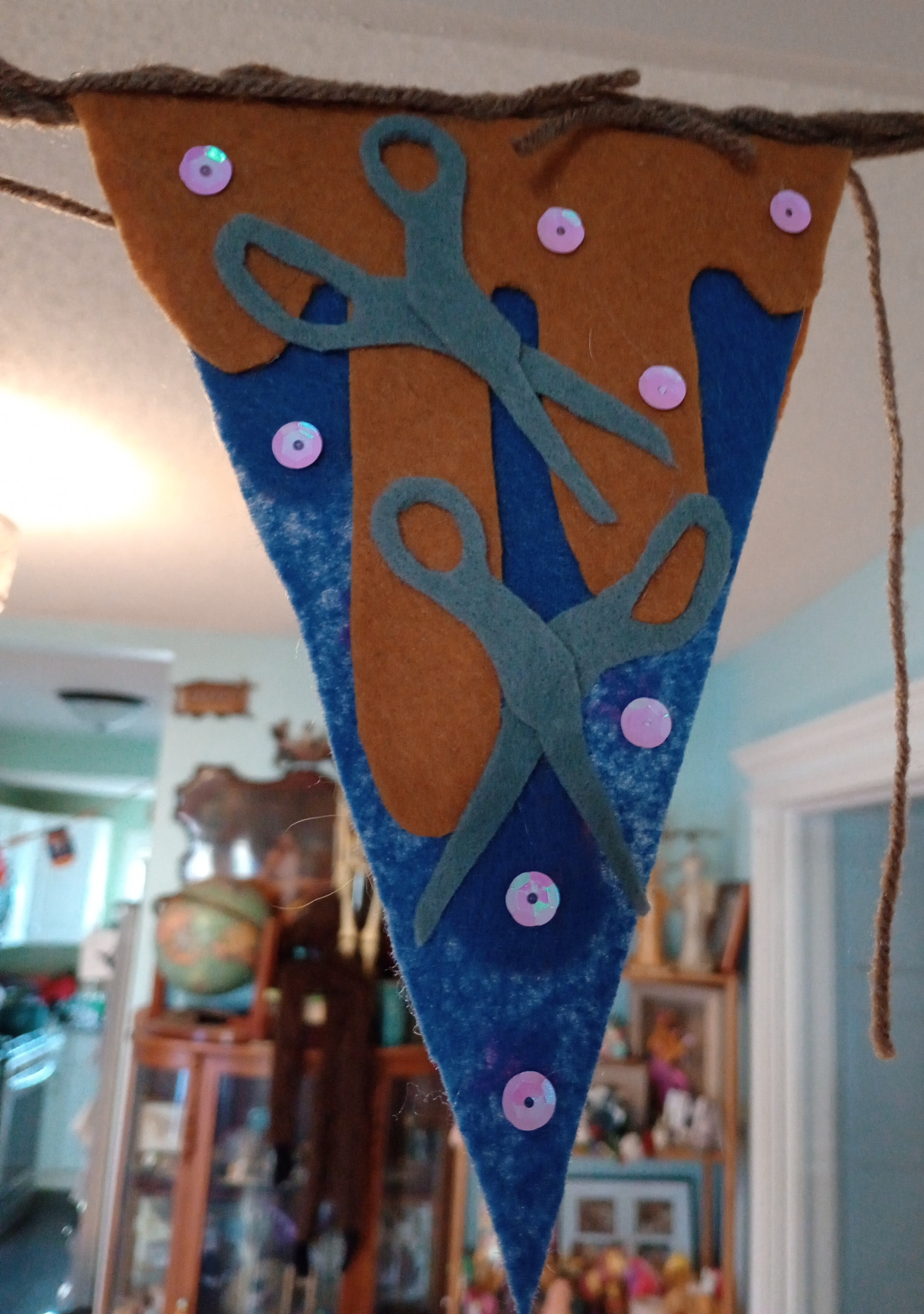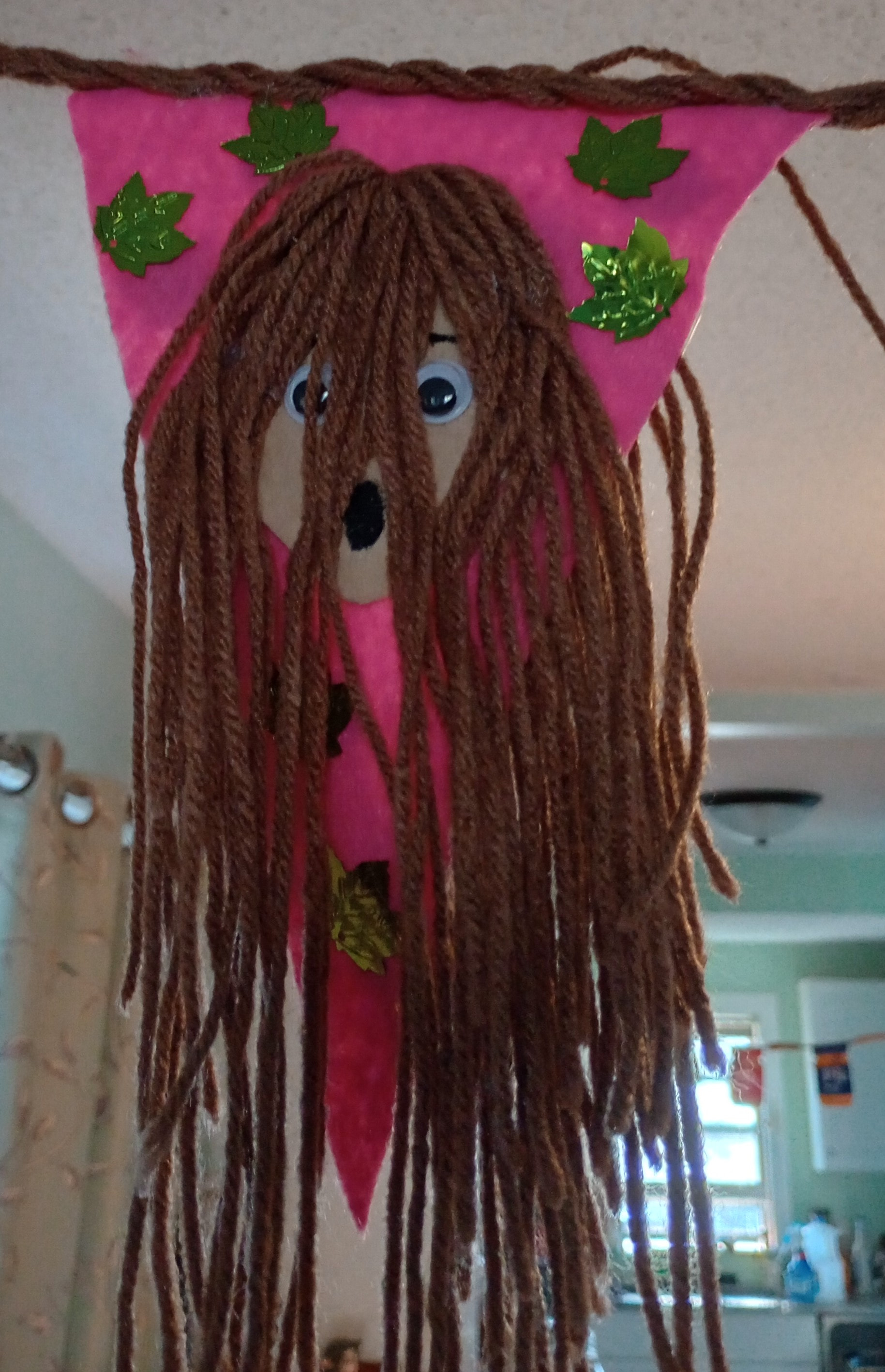 This one is double sided and longer. I’m proud of it. Is made of felt, googly eyes, yarn, and sequins. Obviously it’s ridiculously gaudy because why not?