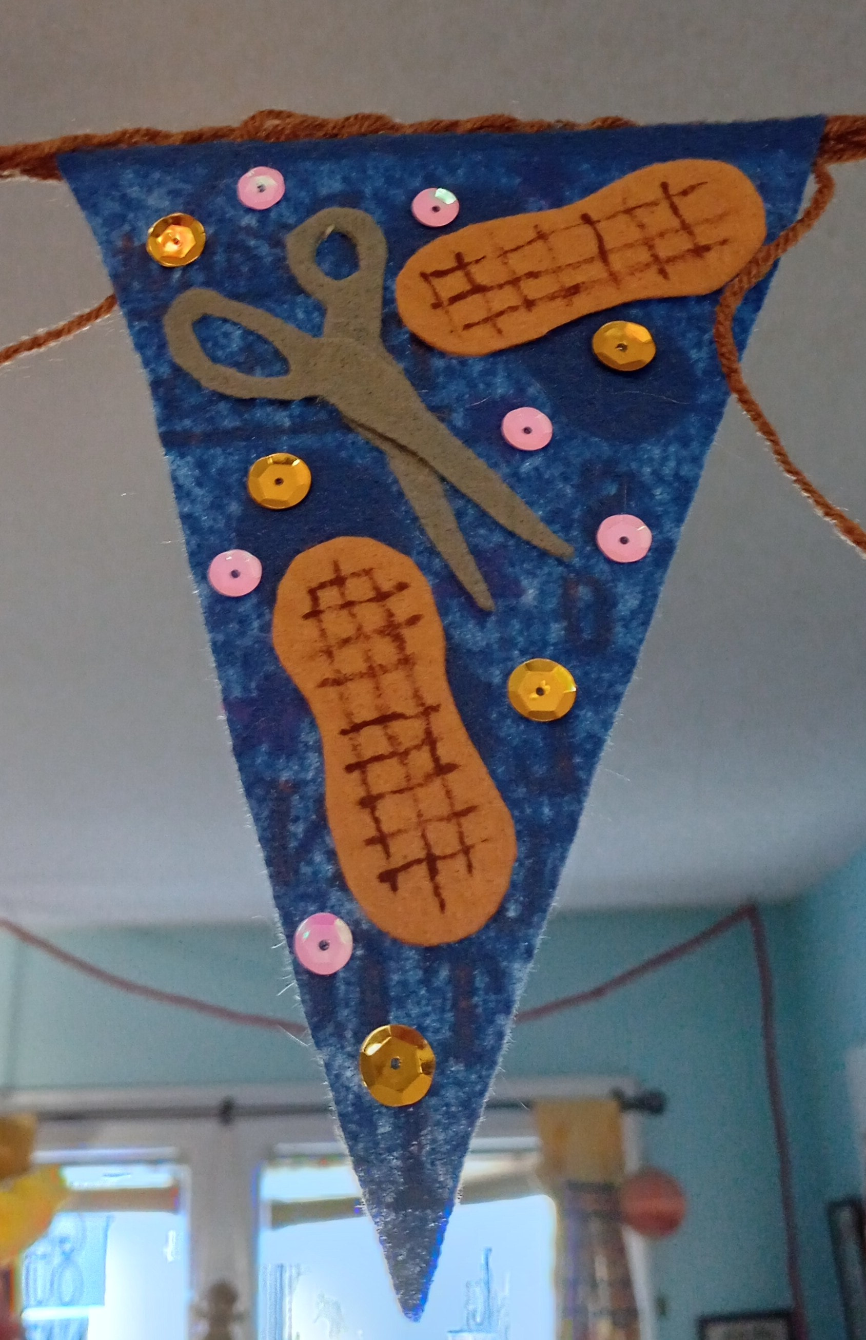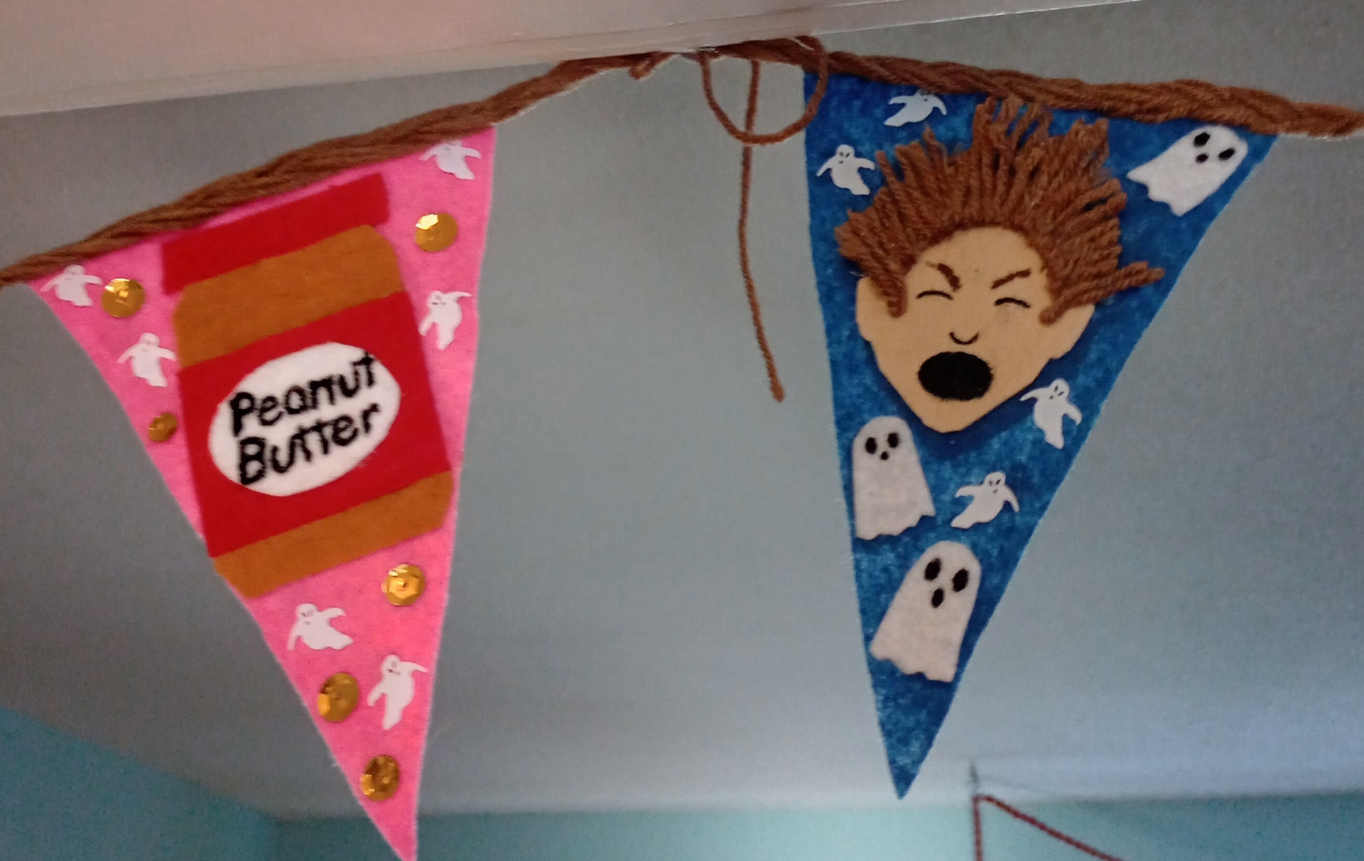 As you can see we have done peanut butter and ghosts. And the kid when his hair went on end because he saw the homeless ghosts in a haunted house. I had some ghost sequins so I added those. I decided the string would represent his hair as well so there’s just loose strands and such all over the place and it’s braided.
