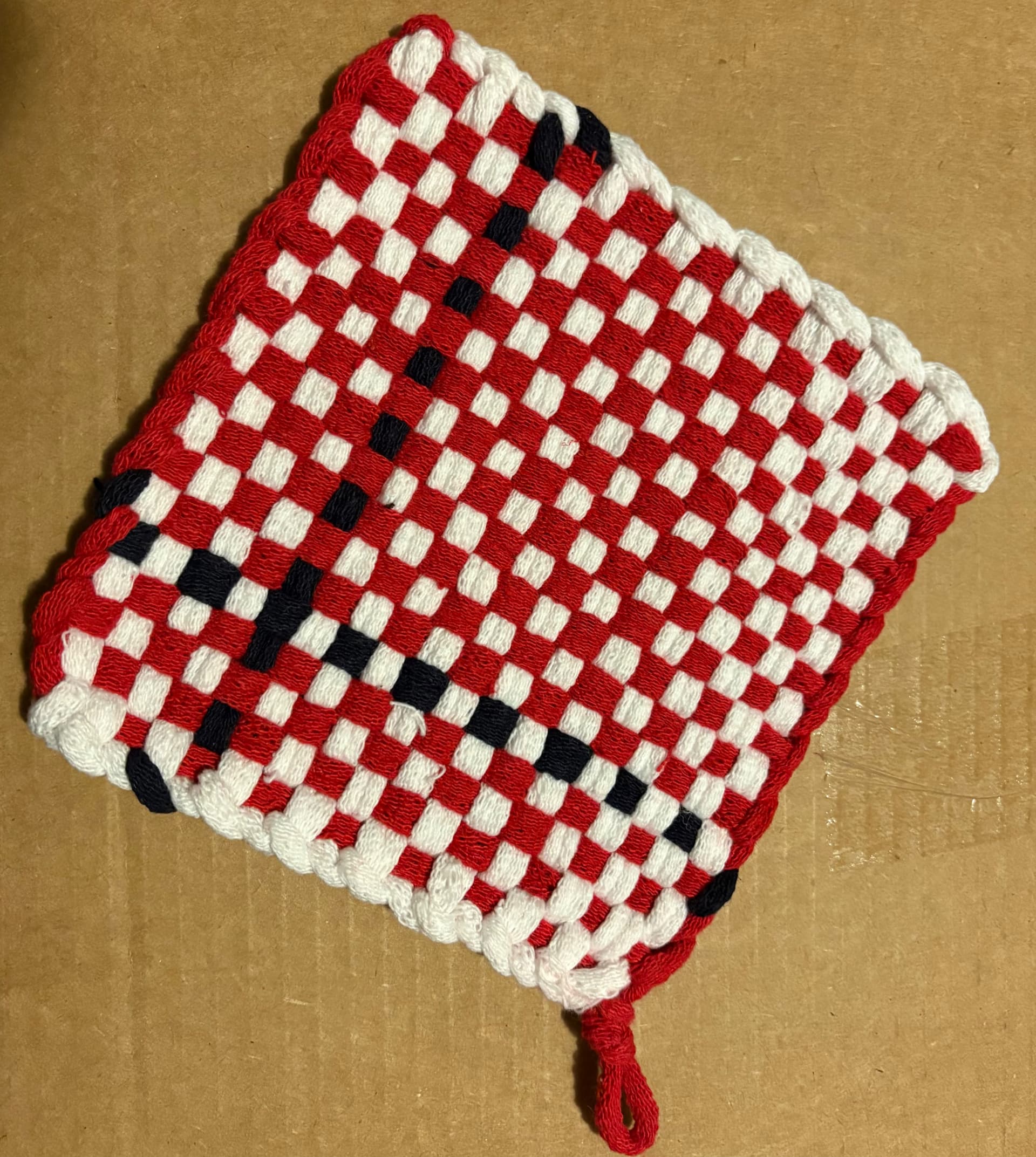 One of the prompts for the Nerd Games- Summer Camp 2025 was to craft an item inspired by a traditional camp song. I decided to combine two- Ants Go Marching and On Top of Spaghetti. I figured that I get in touch with my childhood craft roots and make a potholder.