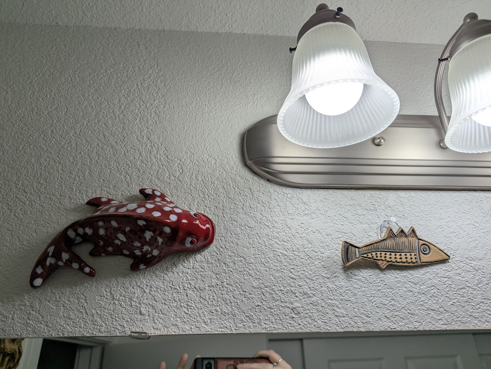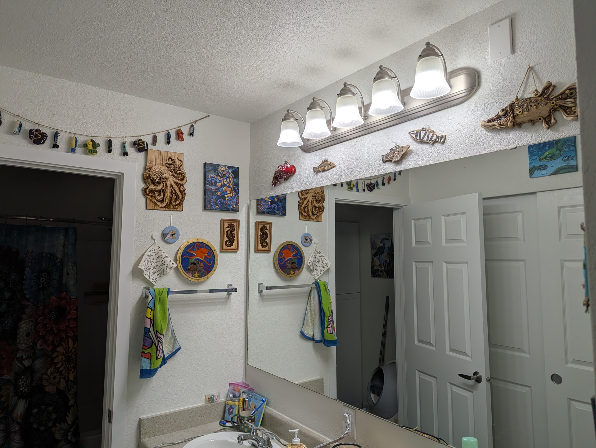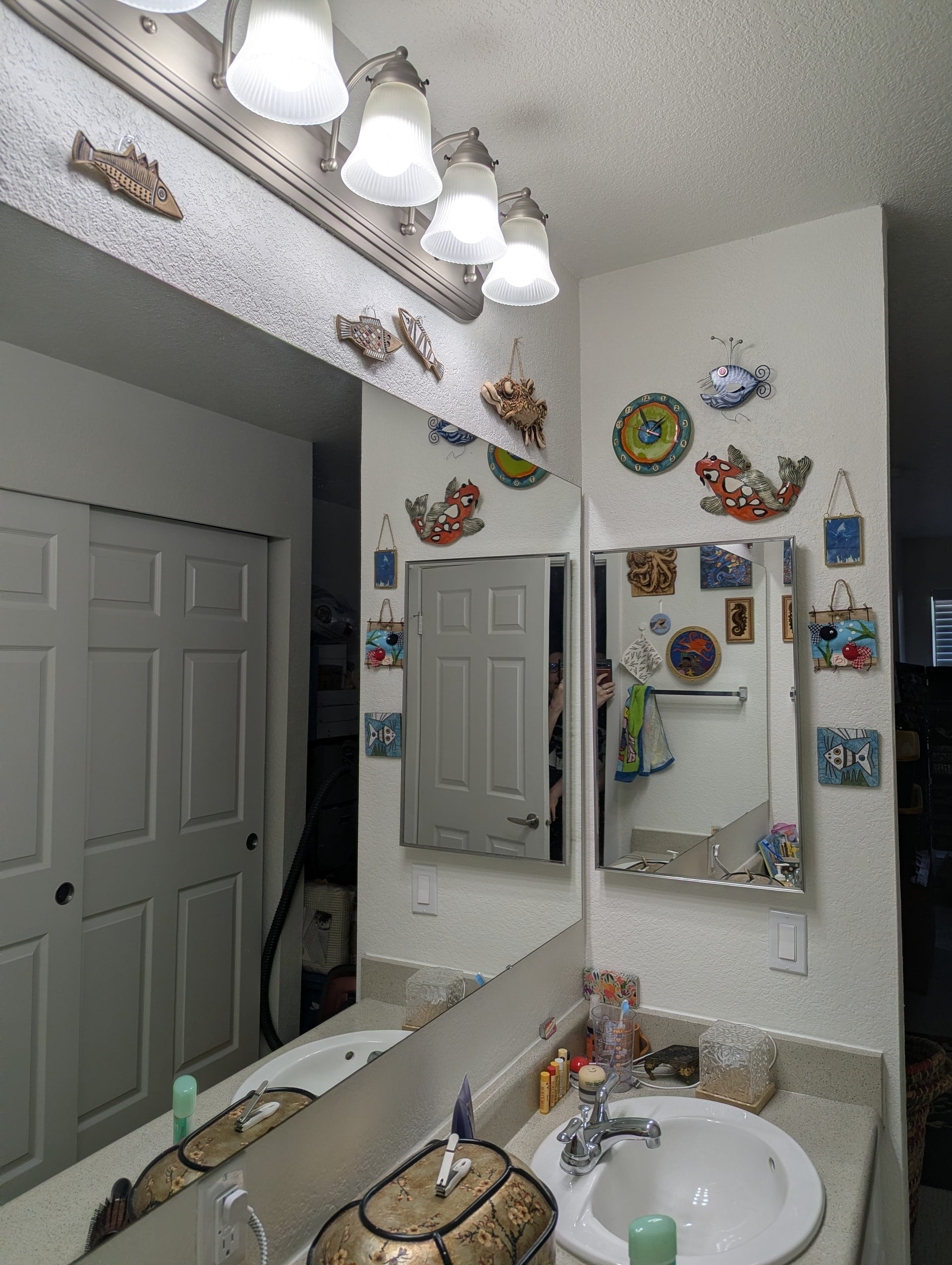 I just took a bunch of pictures of that area; it’s really hard to photograph because it’s like all mirror there, so you’ll see my hands as I try to stay out of the shots. ;p The felt fish garland over the door is from World Market; everything else was either handmade for me in a swap or as a gift, or I bought at a craft market!
