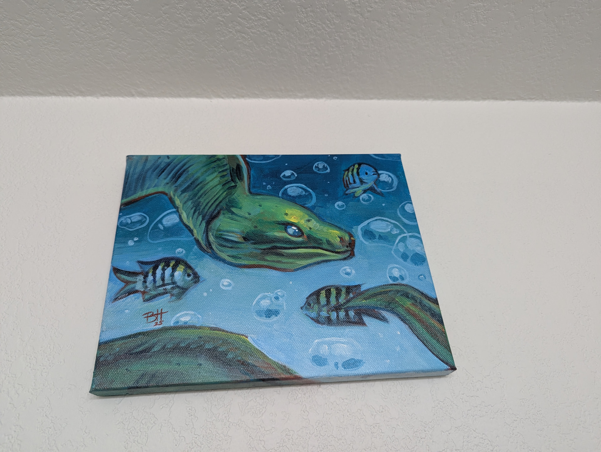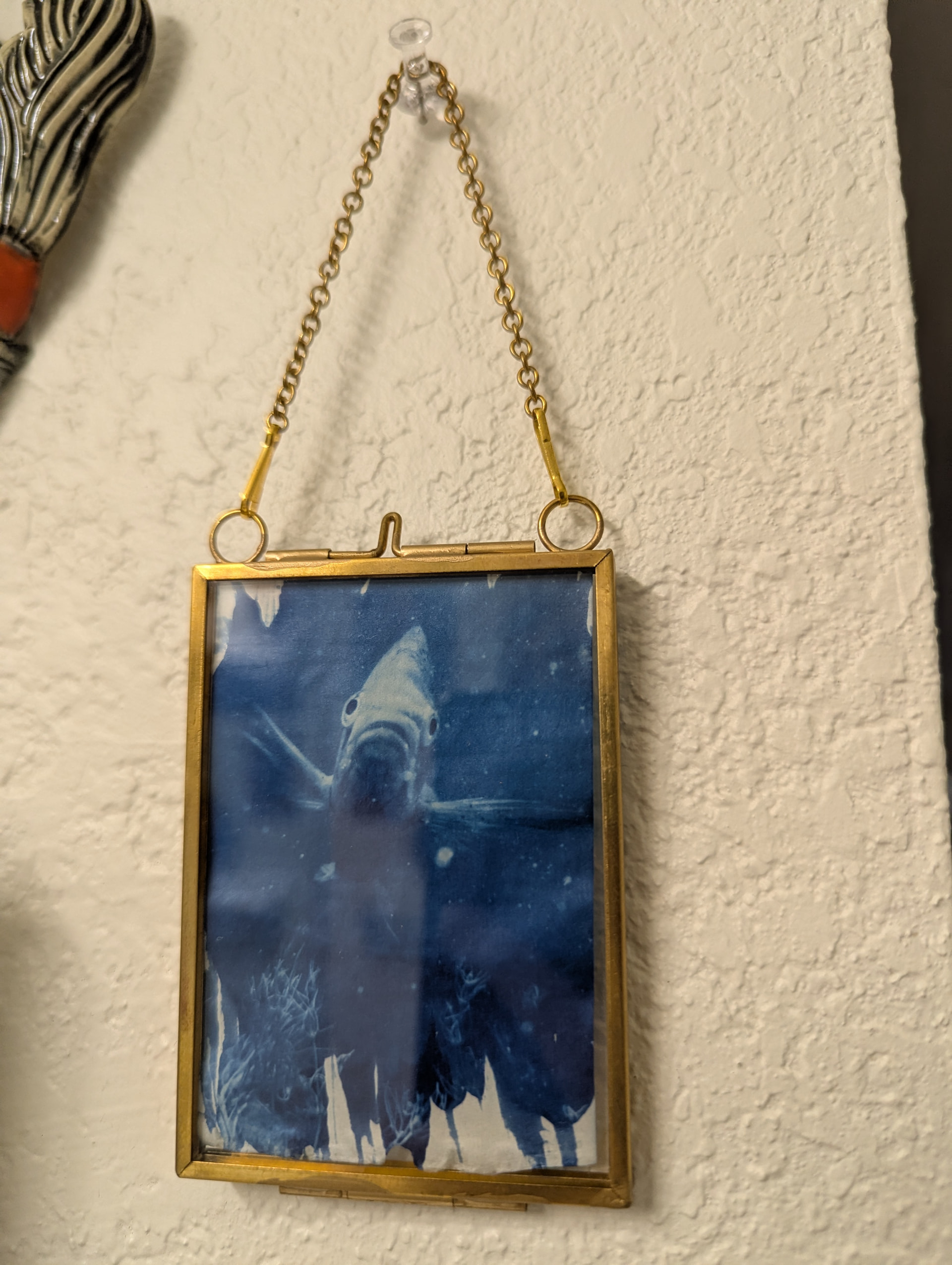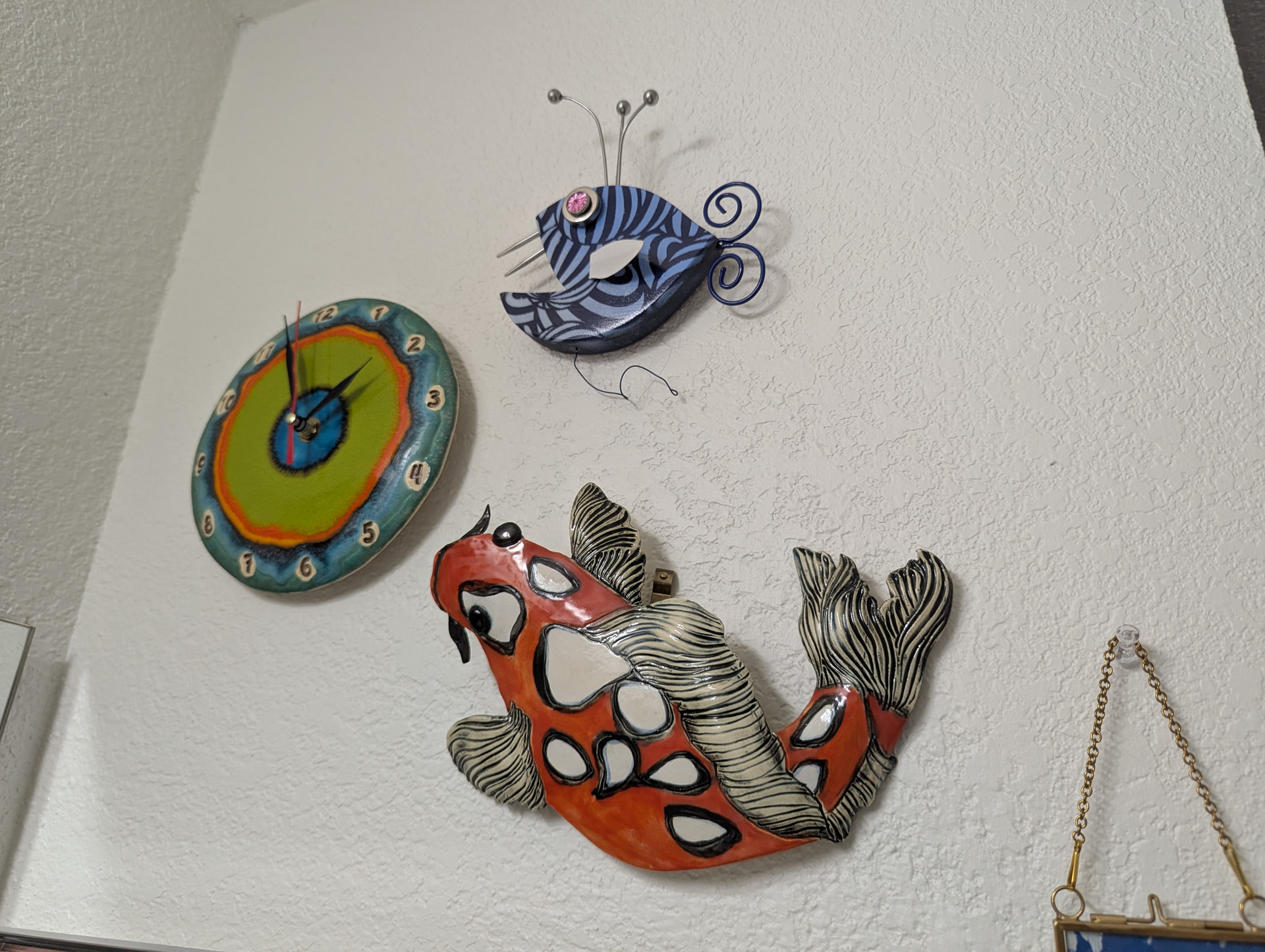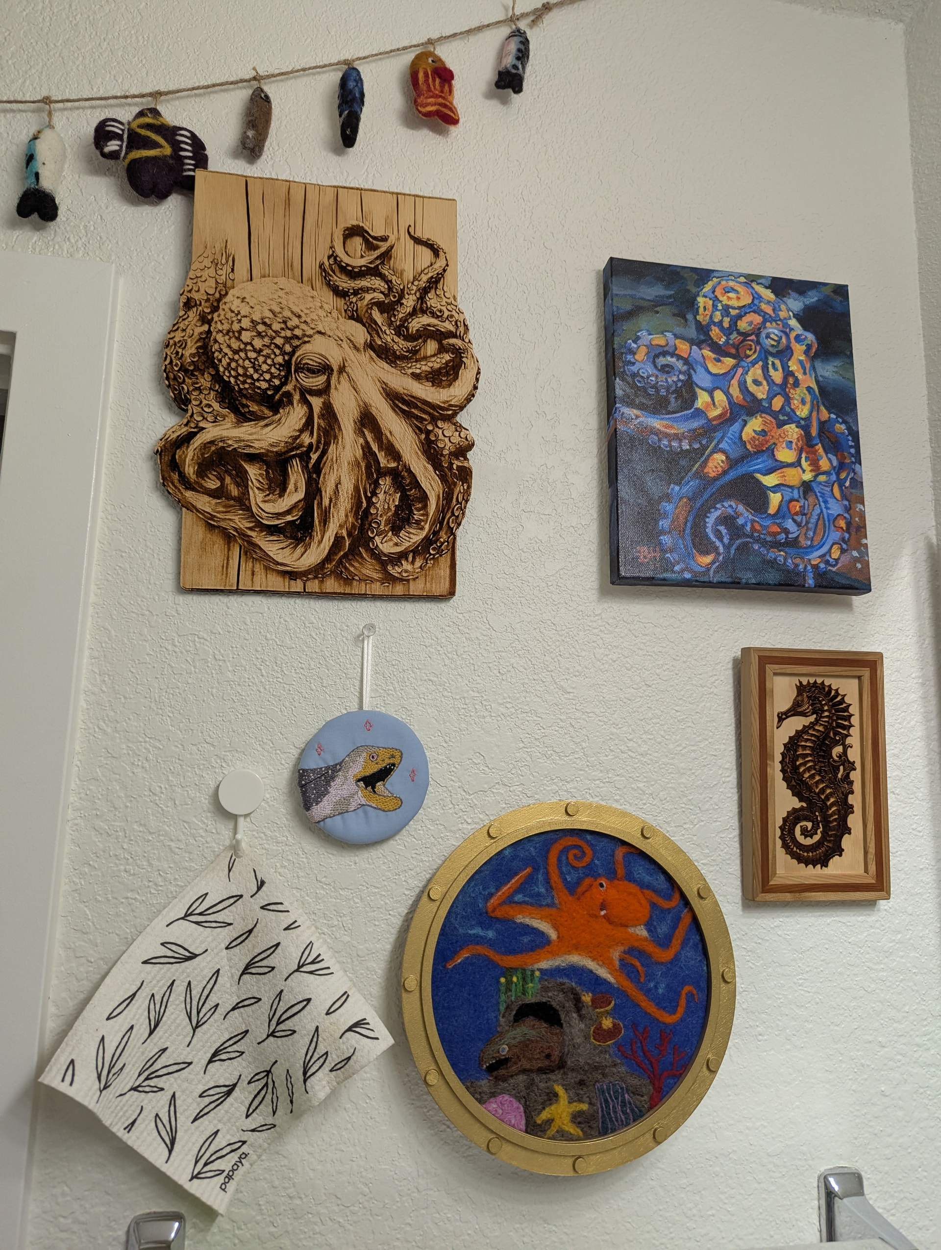 I just took a bunch of pictures of that area; it’s really hard to photograph because it’s like all mirror there, so you’ll see my hands as I try to stay out of the shots. ;p The felt fish garland over the door is from World Market; everything else was either handmade for me in a swap or as a gift, or I bought at a craft market!