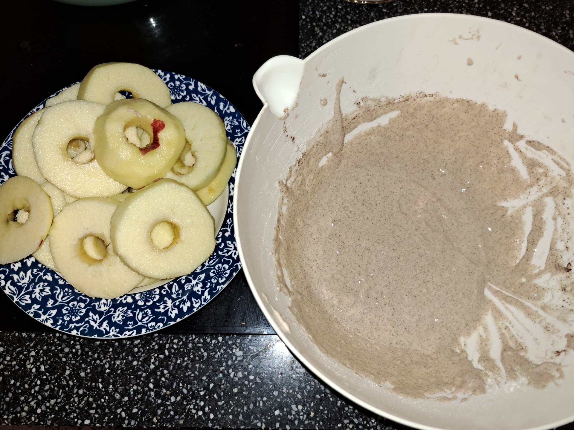 Mix dry ingredients, stir in wet ingredients until you’ve got a batter without lumps. The colour is unappealing because of the cinnamon but it looks better when they’re fried.