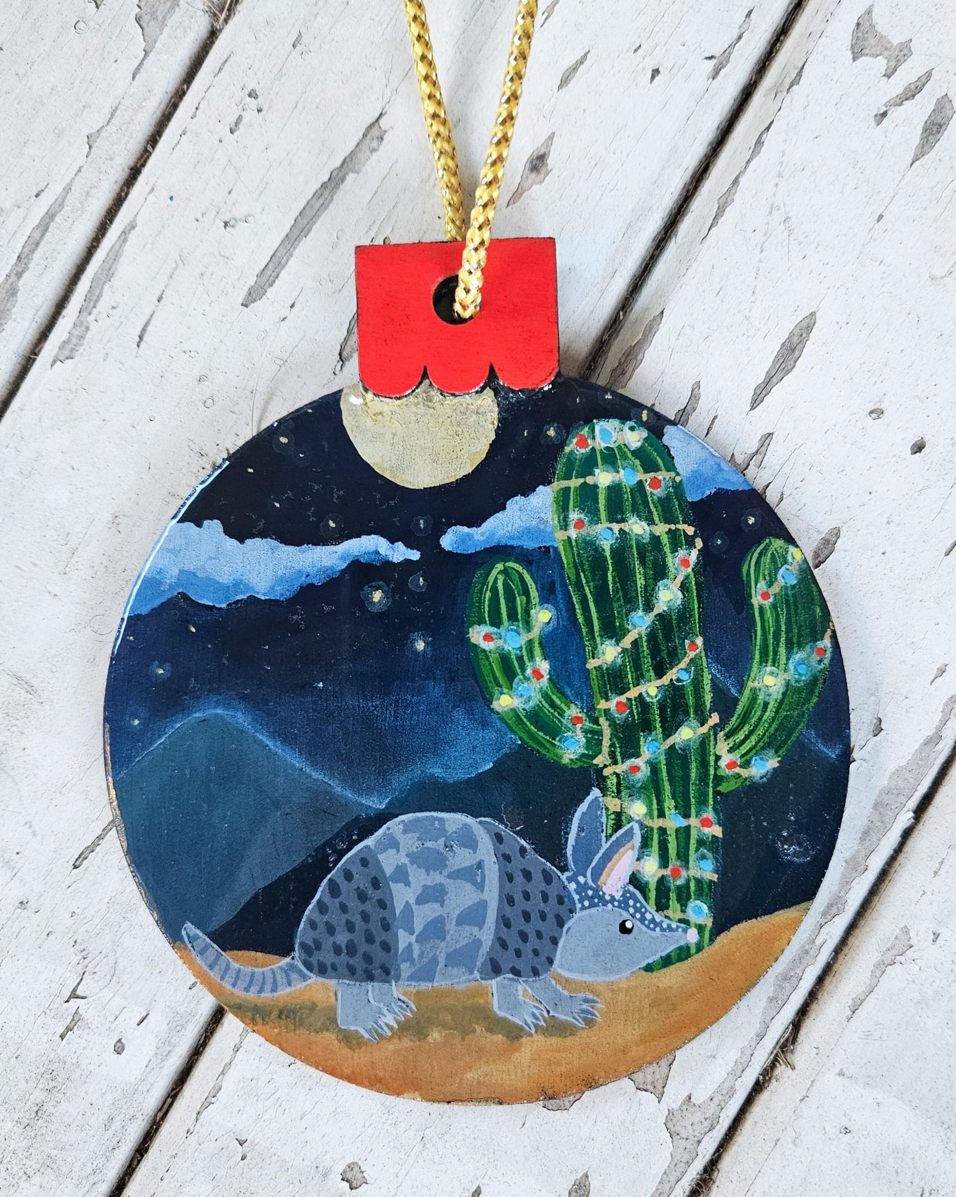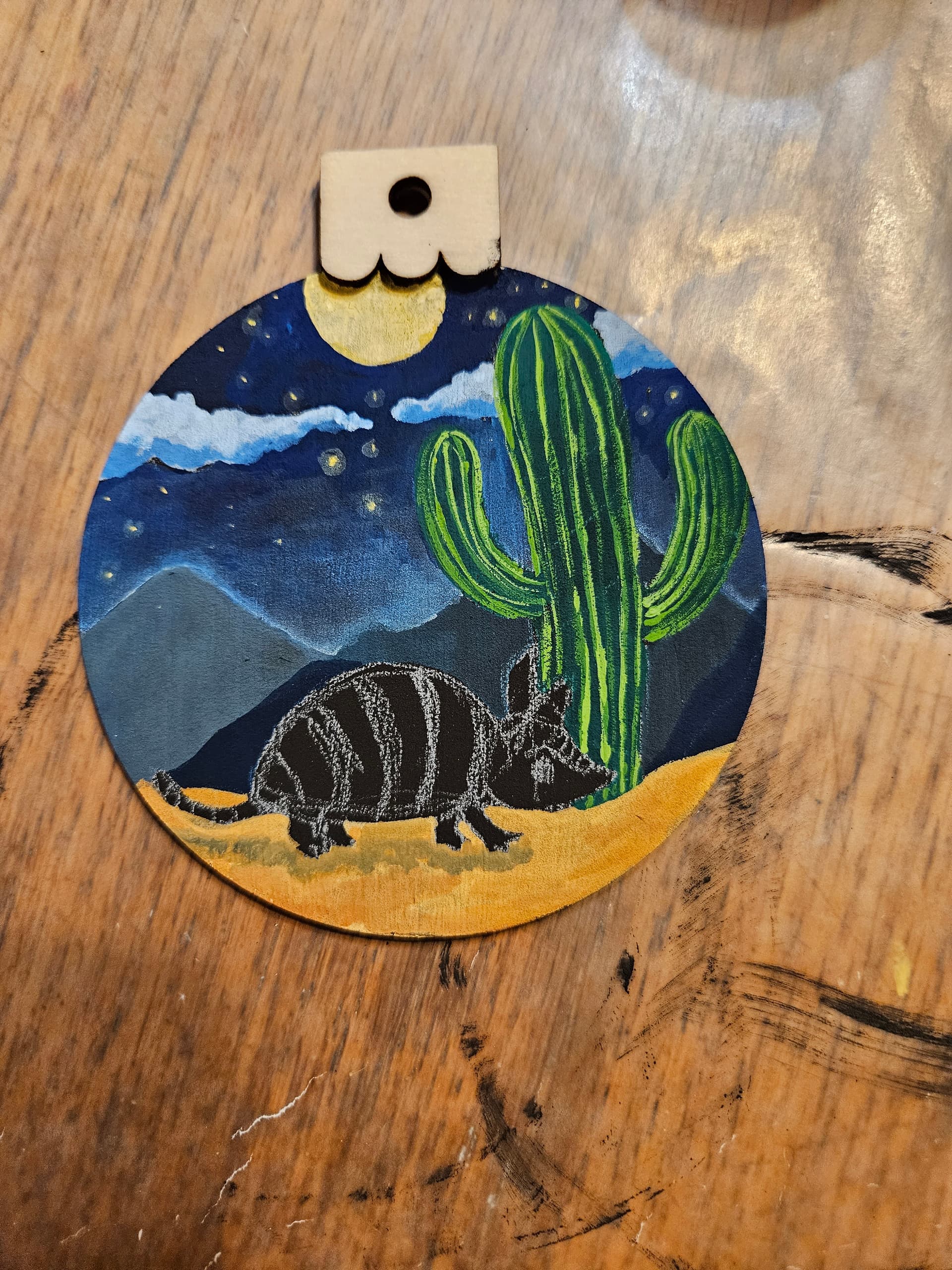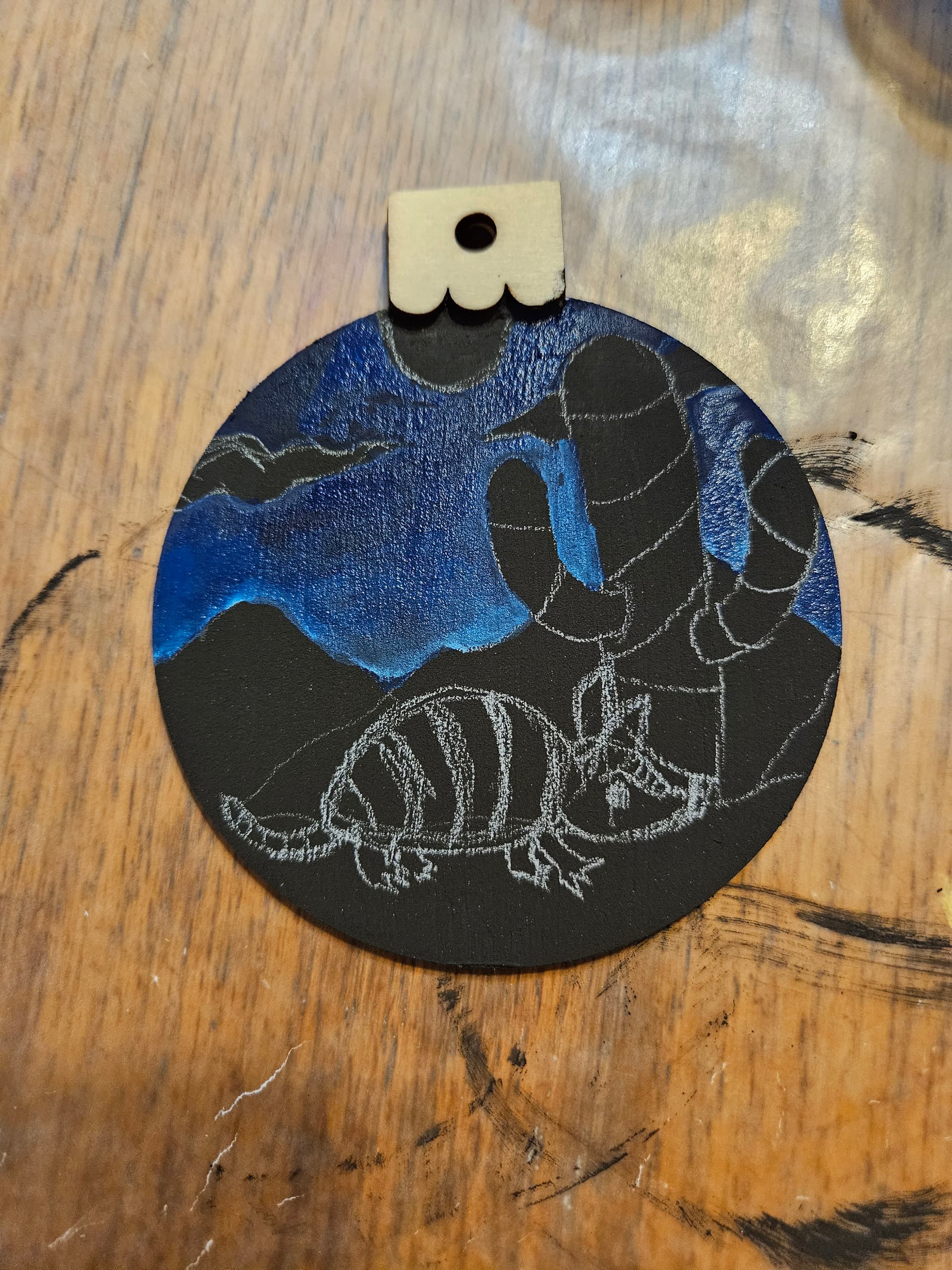 The base is a wooden blank that I painted with black watercolor ground. Then I created the main painting with acrylic gouache. I realllllllllly should have just sealed it and walked away…but I decided this would be a great time to use some UV resin for a polished look. Sigh. There are some bubbles and it’s not as perfect as I prefer. In the end I sent it hoping RagingSloth would like it warts and all. But I’m still kicking myself over the resin.