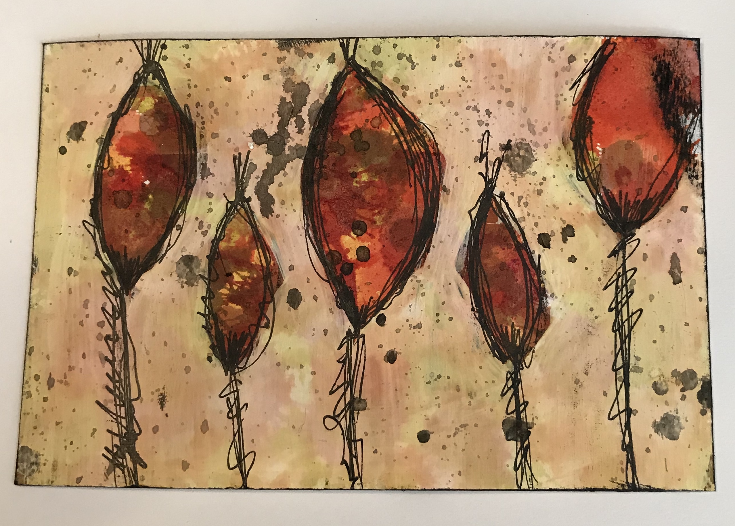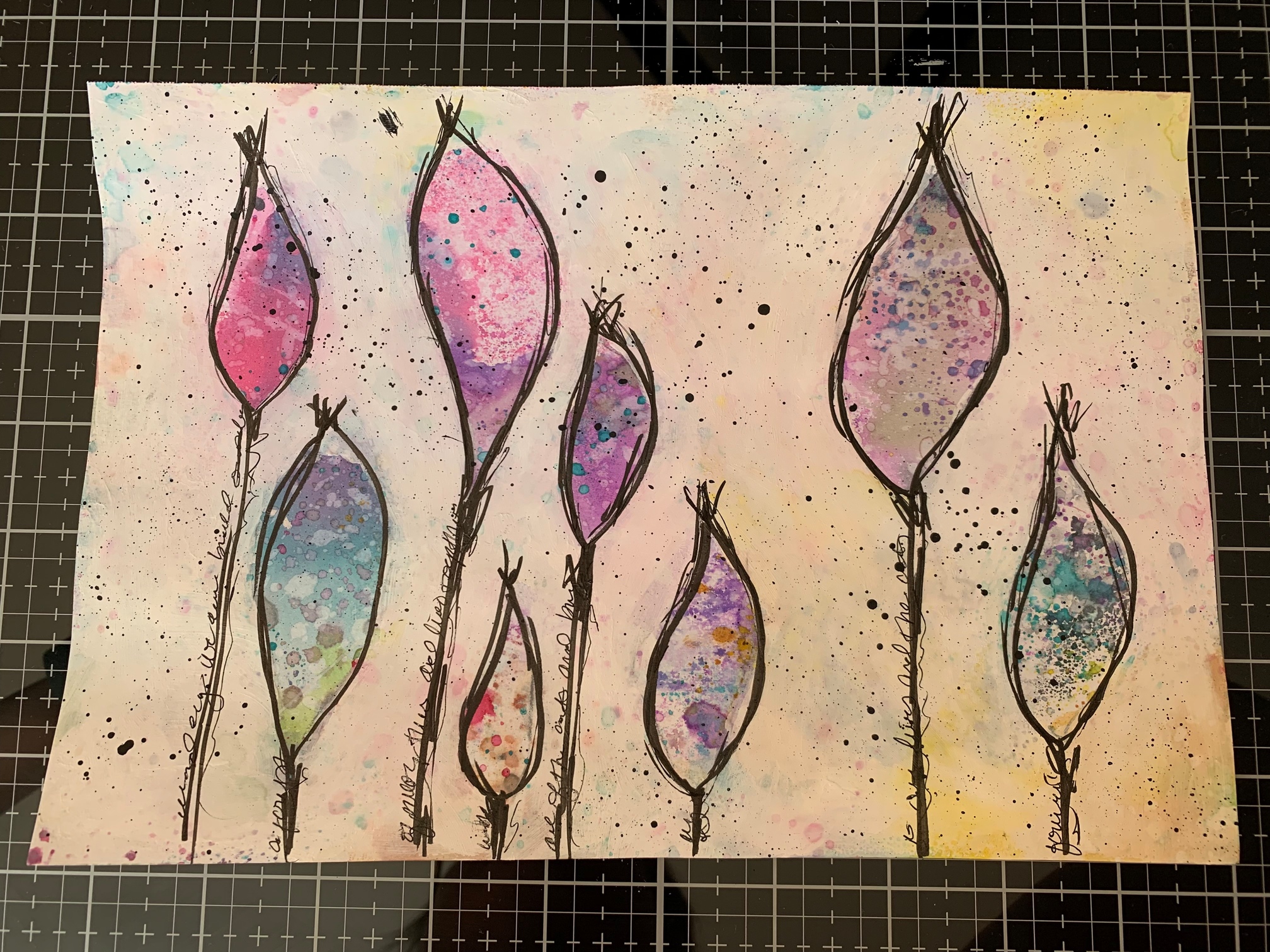 Background: Red, yellow, orange, and aqua craft acrylics watered down with spray bottle, white acrylic ink, water spritzes