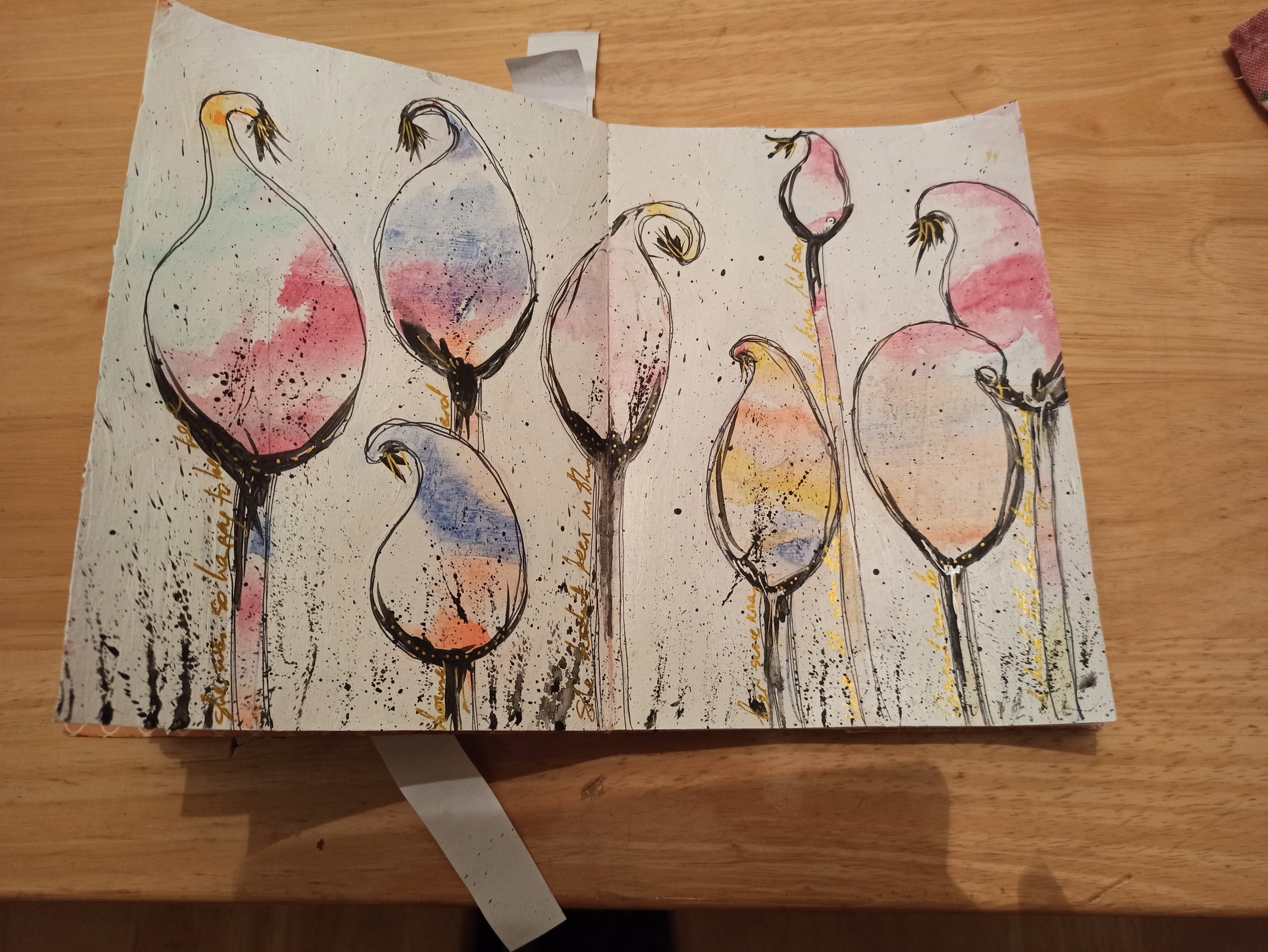 I used pan watercolour for the background, then two layers of white acrylic on top, the splatters are thin black acrylic. And the pen was a black felt tip and a gold uniball signo