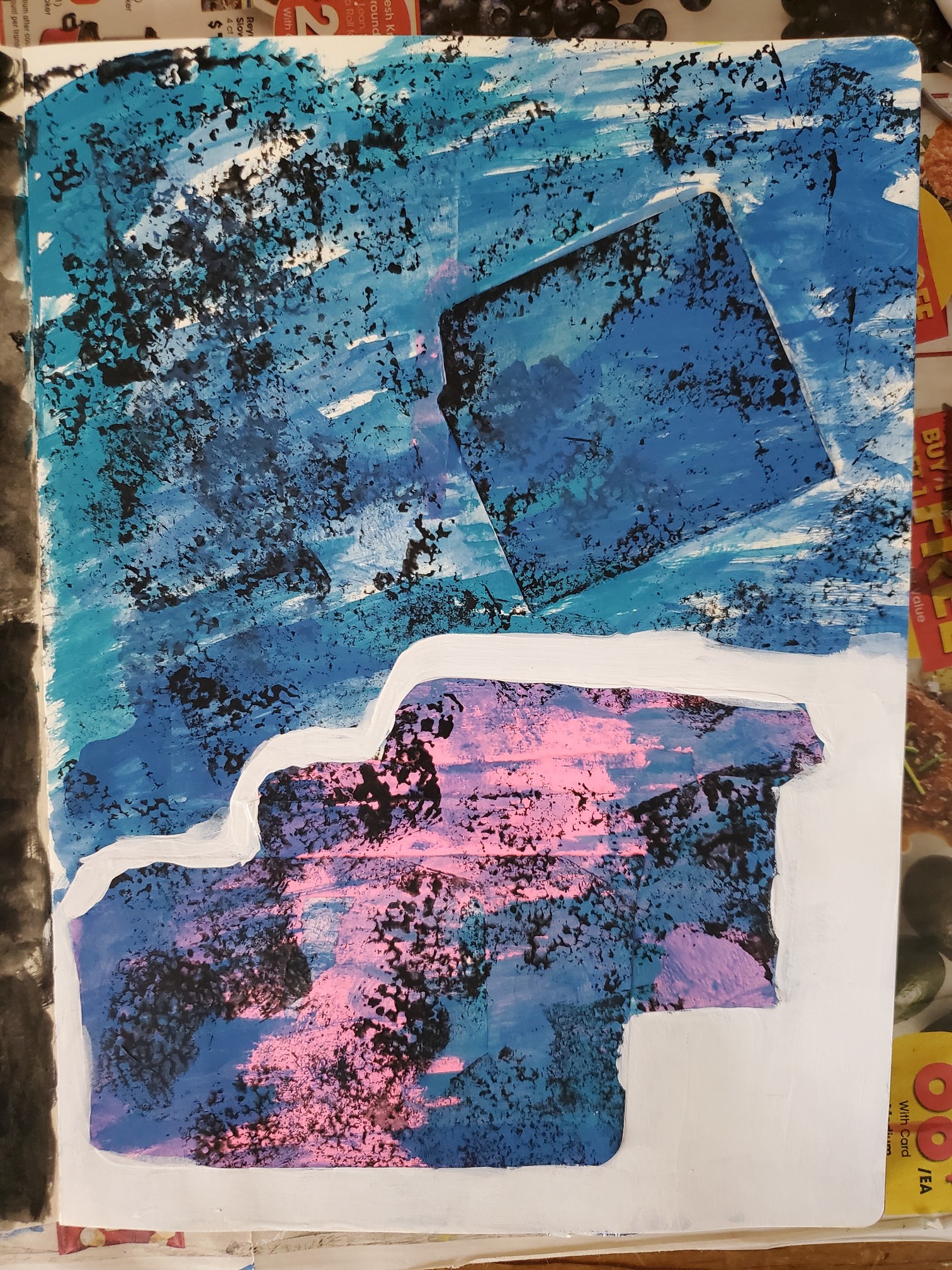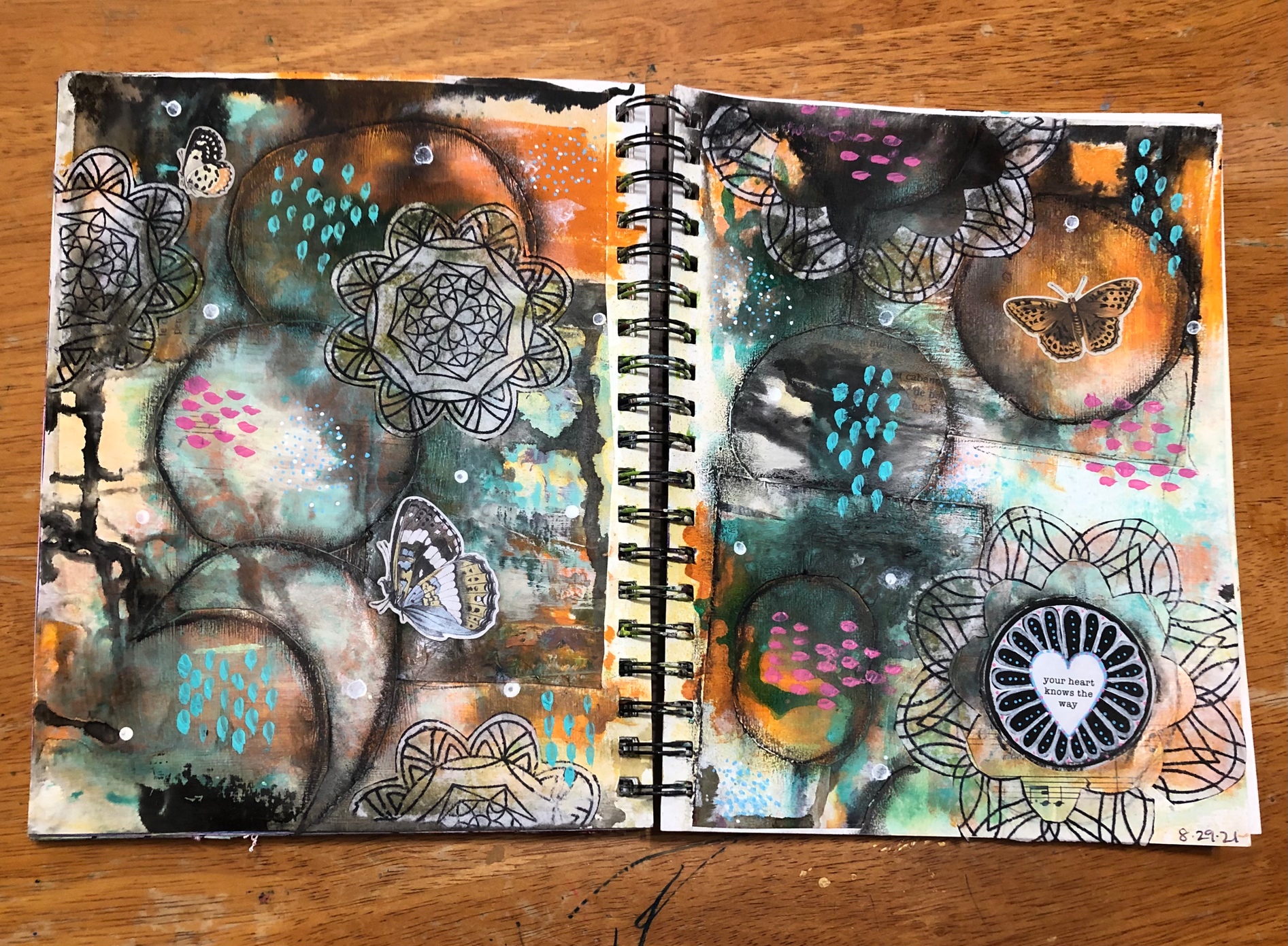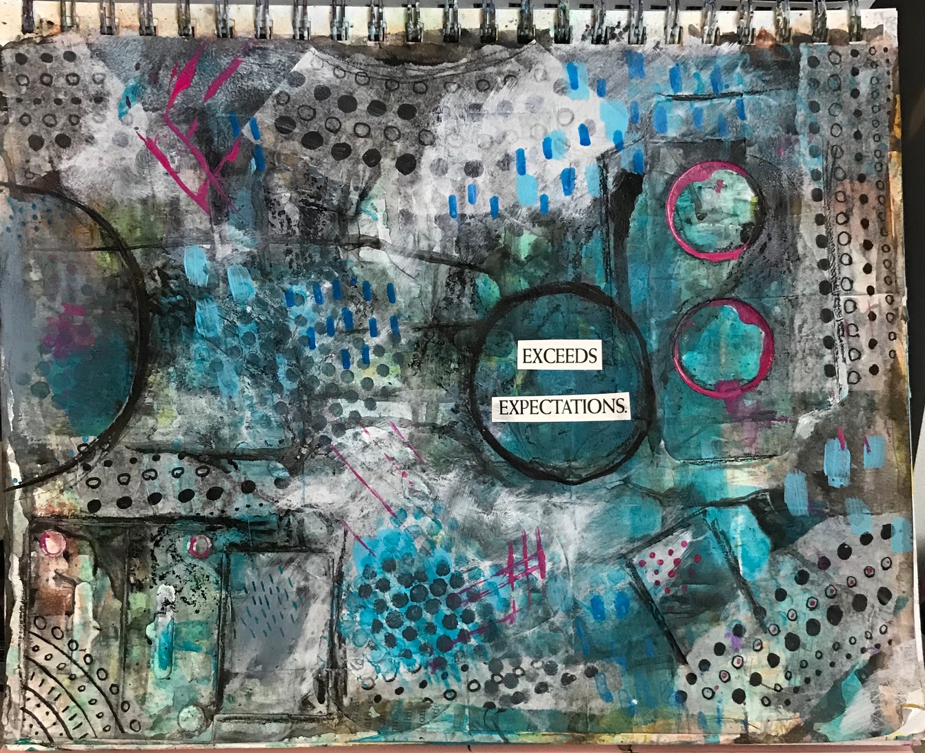 Here’s my page! Today was definitely a practice in letting go! Every time I made peace with my pages she added another layer! I am happy with how it came out though I’m iffy on the blue and pink dots I added at the very end.