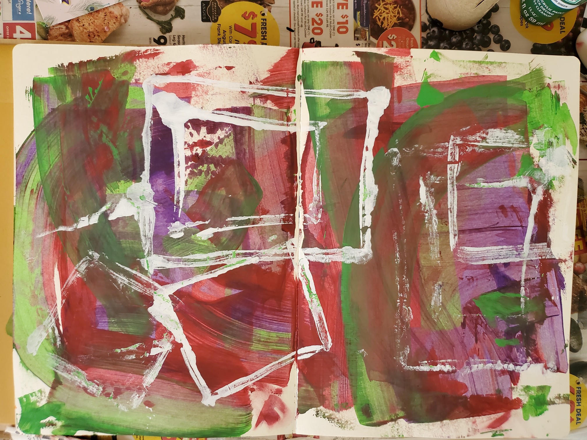 So I’ve gotten carried away playing around with the Recycler’s Journal class. I don’t have any finished pages yet but have been having a lot of fun slapping paint around and making backgrounds (spreads and single pages). Commence photo dump: